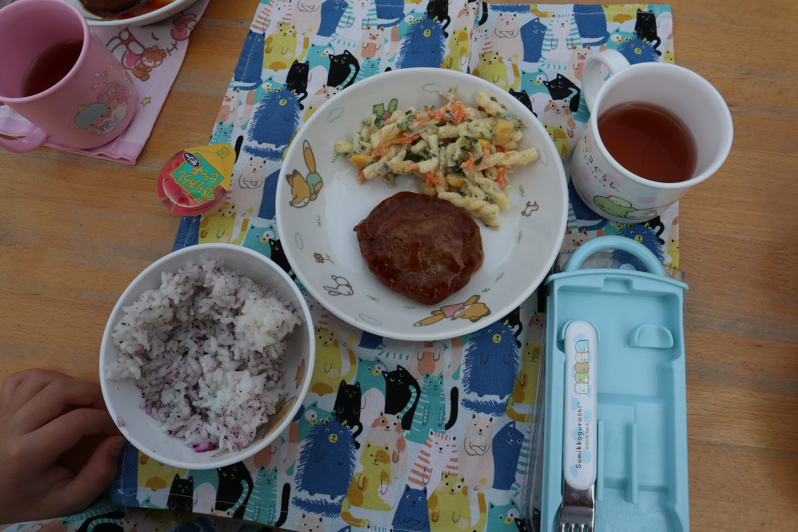この日のメニューはゆかりご飯、ハンバーグ、マカロニサラダ、すりおろしピーチゼリーです。