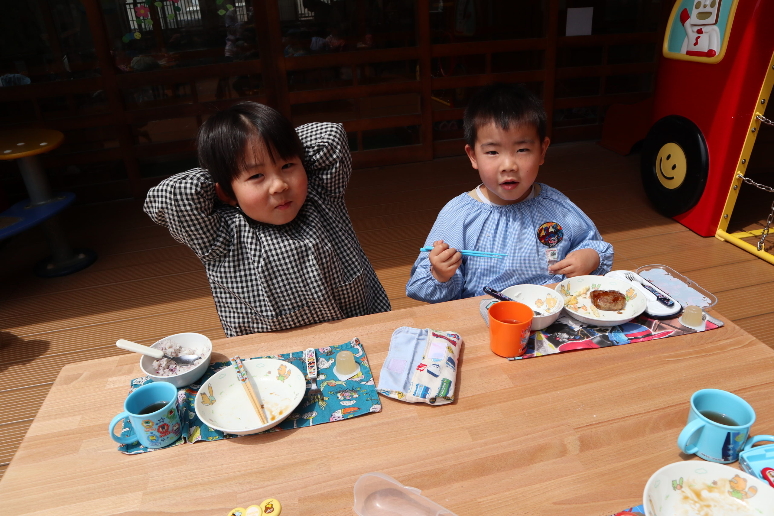 「おにいちゃん、ここでおきゅうしょくたべるの?ハンバーグおいしそう!」おにいちゃんは「あっちで遊んでおいでよ。」ちょっぴり照れていました。