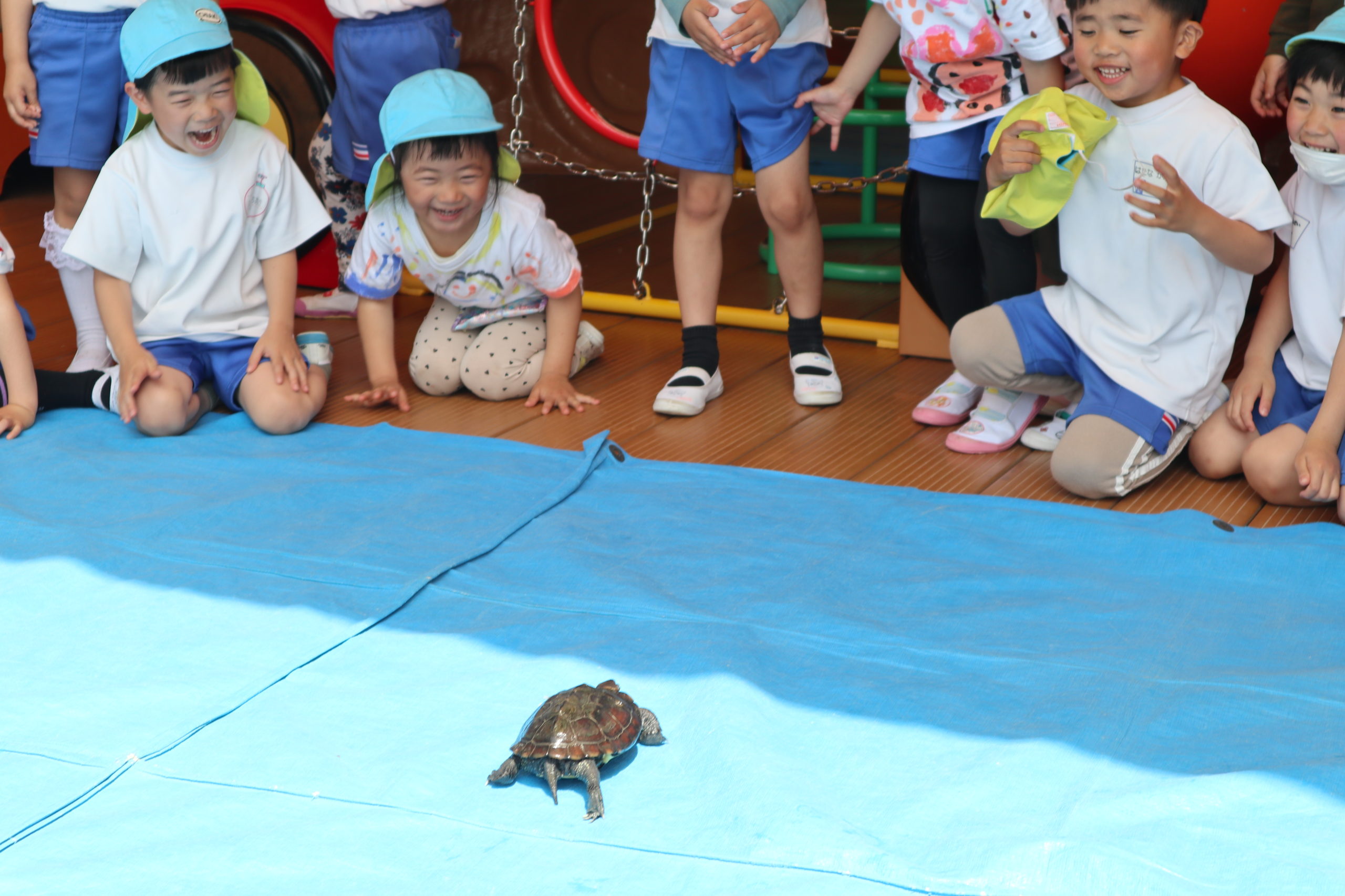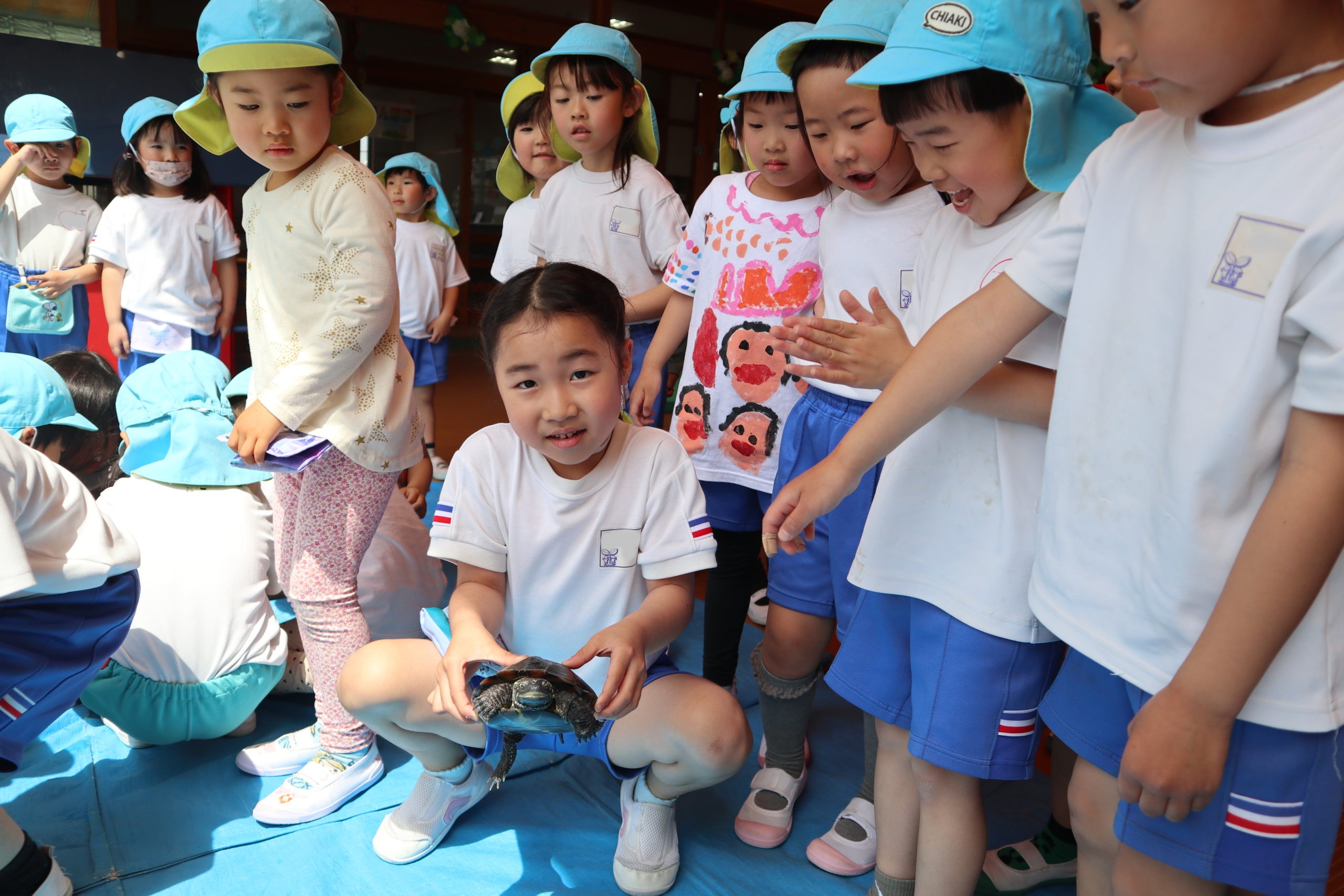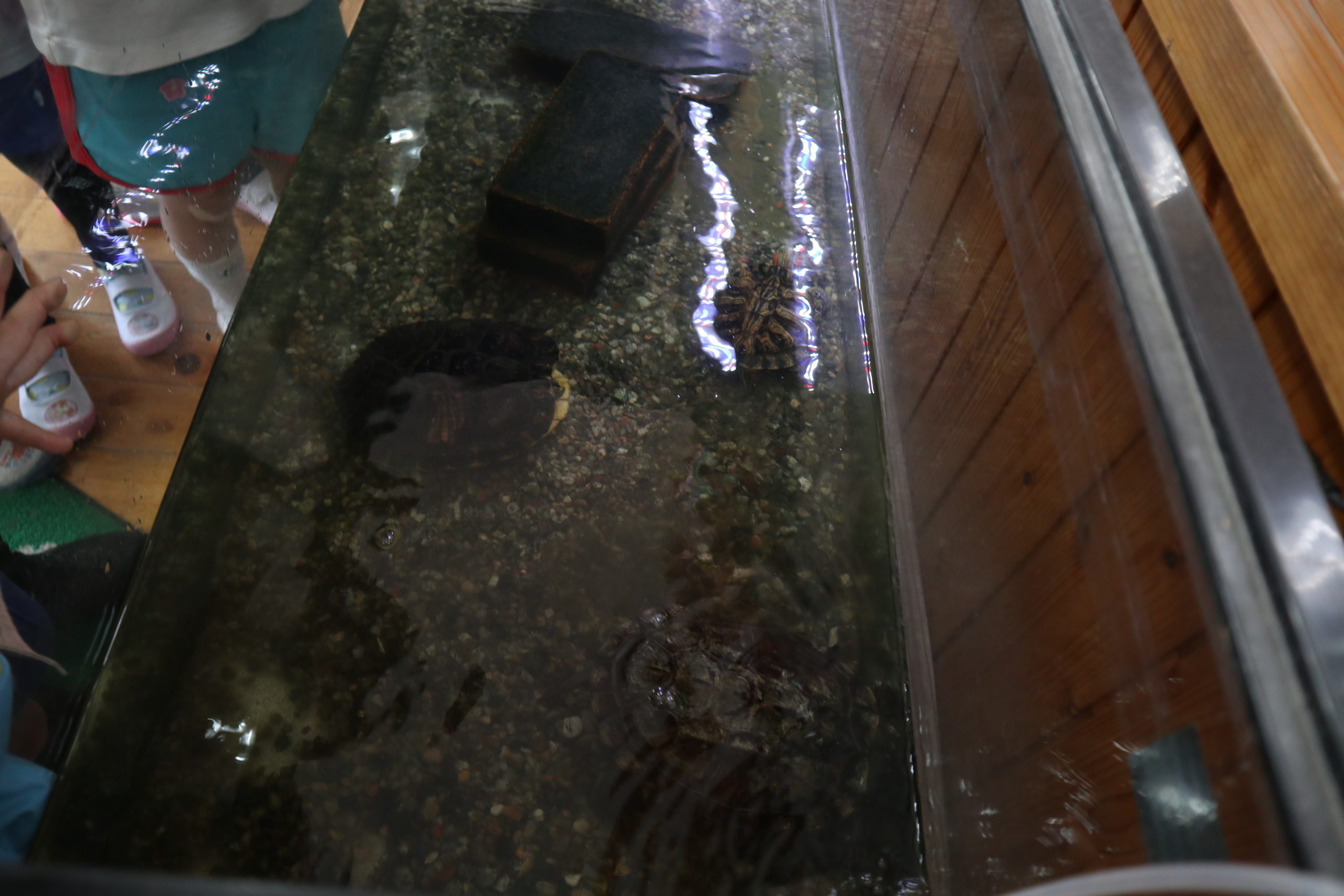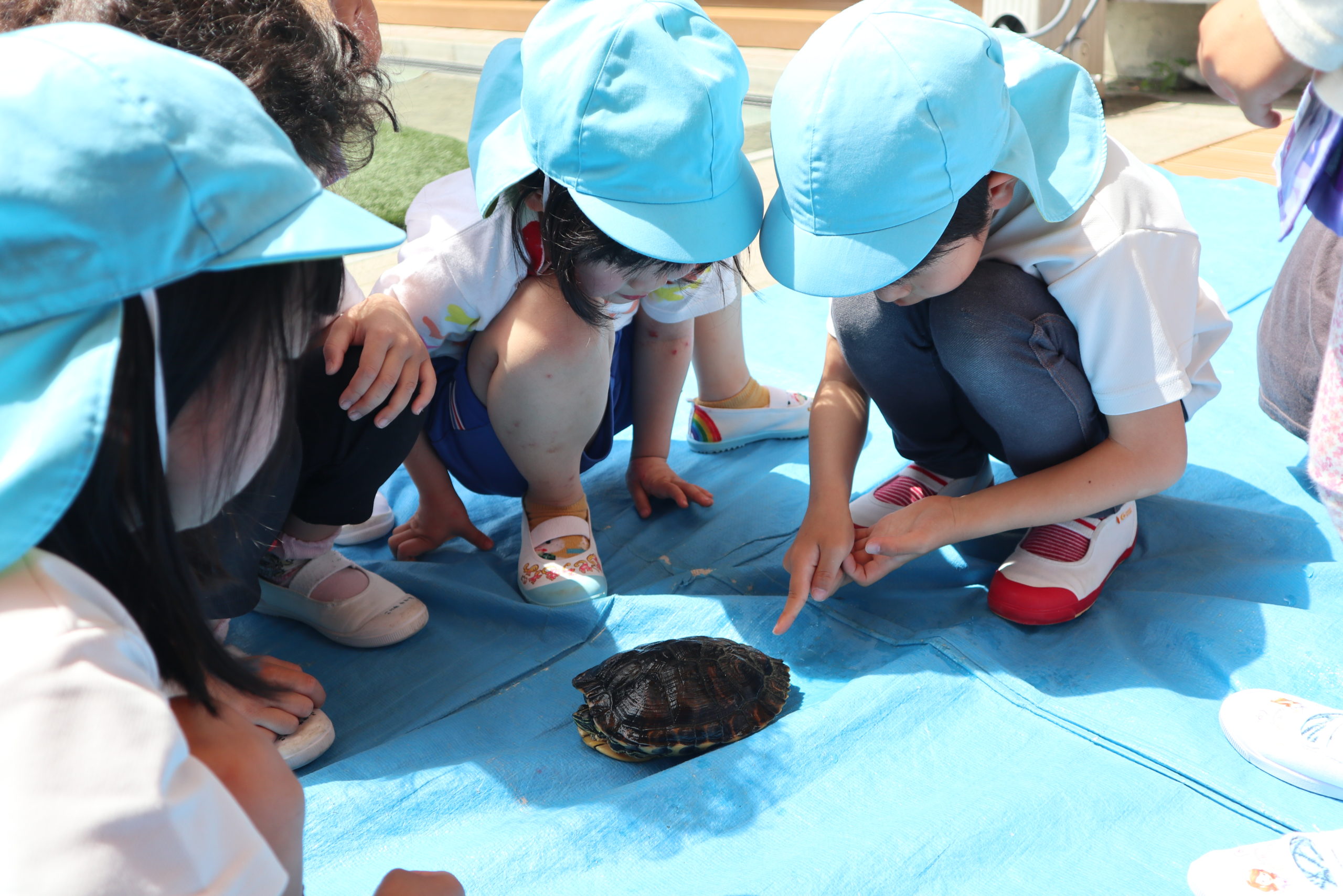 かめを触ったことのない友達も勇気を出してチャレンジしたよ。「触れてすごいね!」友達も一緒に喜んでいたよ。