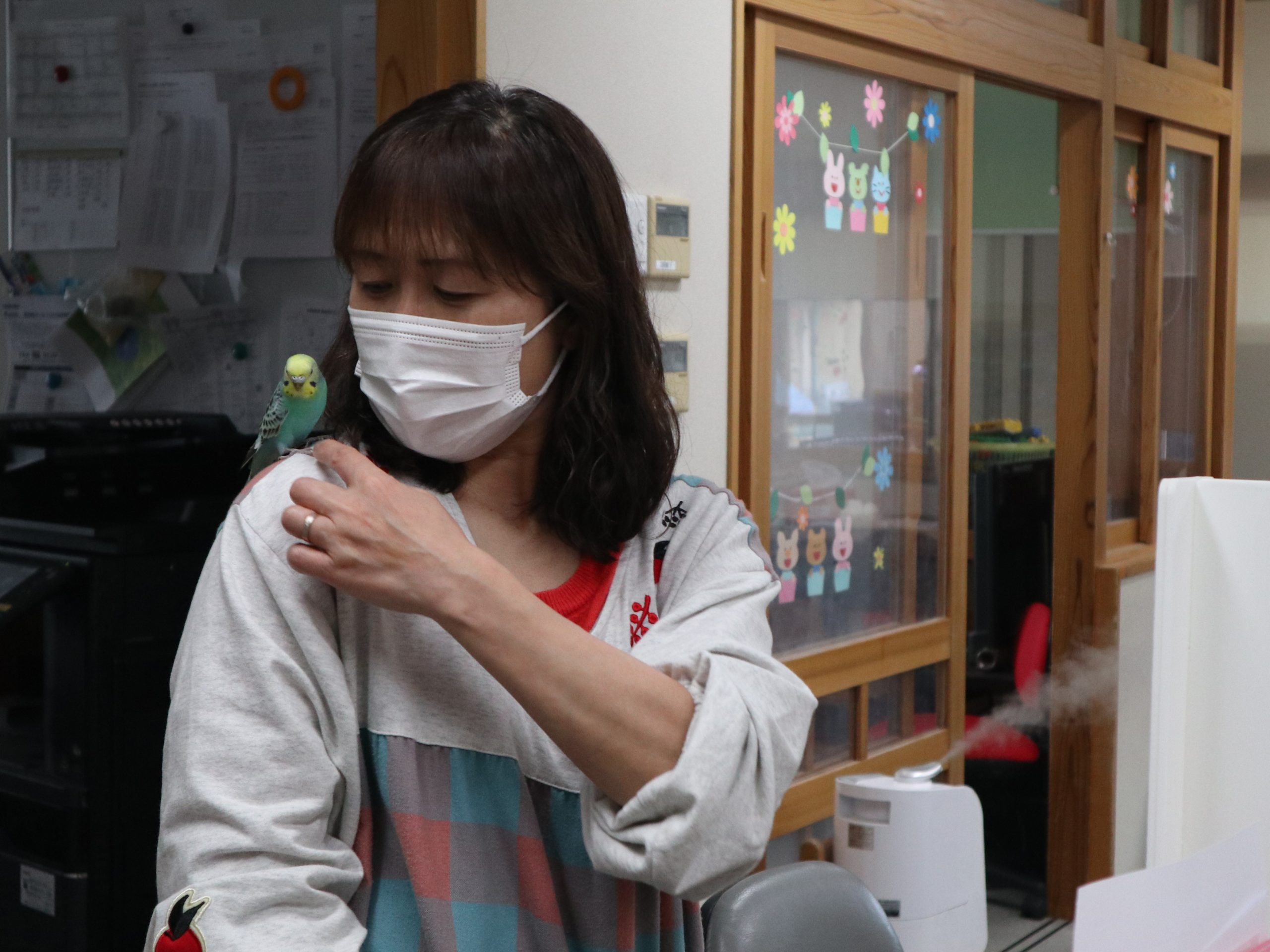 ゆきちゃんは松井先生にとっても懐いています。指にとまったり、肩に乗ったりなかよしこよし。