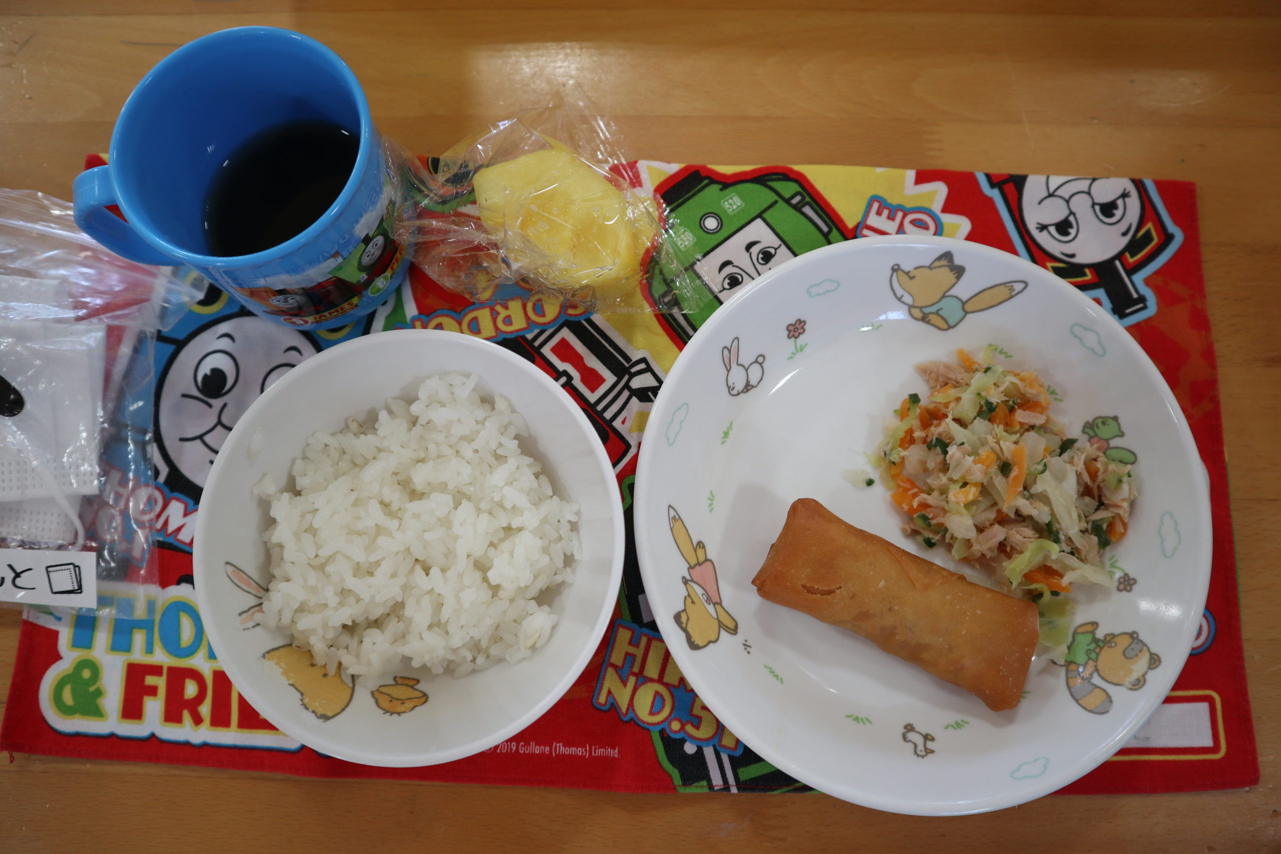 ランチタイムの4月27日の給食の献立はご飯、パリパリ春巻き、ツナと野菜の甘酢あえ、パイナップルでした。