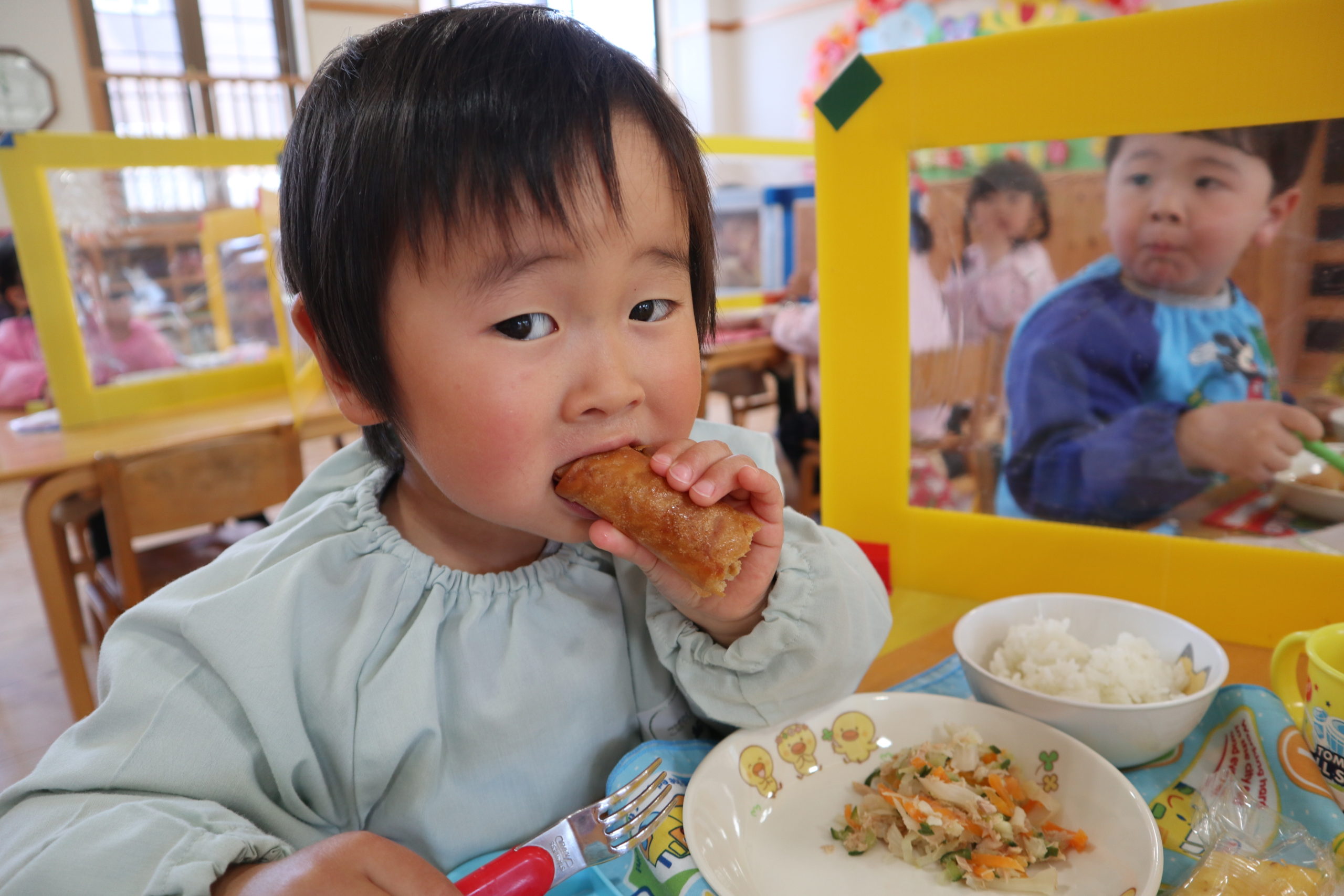 「おいしいね、おいしいね♫」と好きな食べ物も苦手な食べ物もみんなと食べればとっても楽しいね。