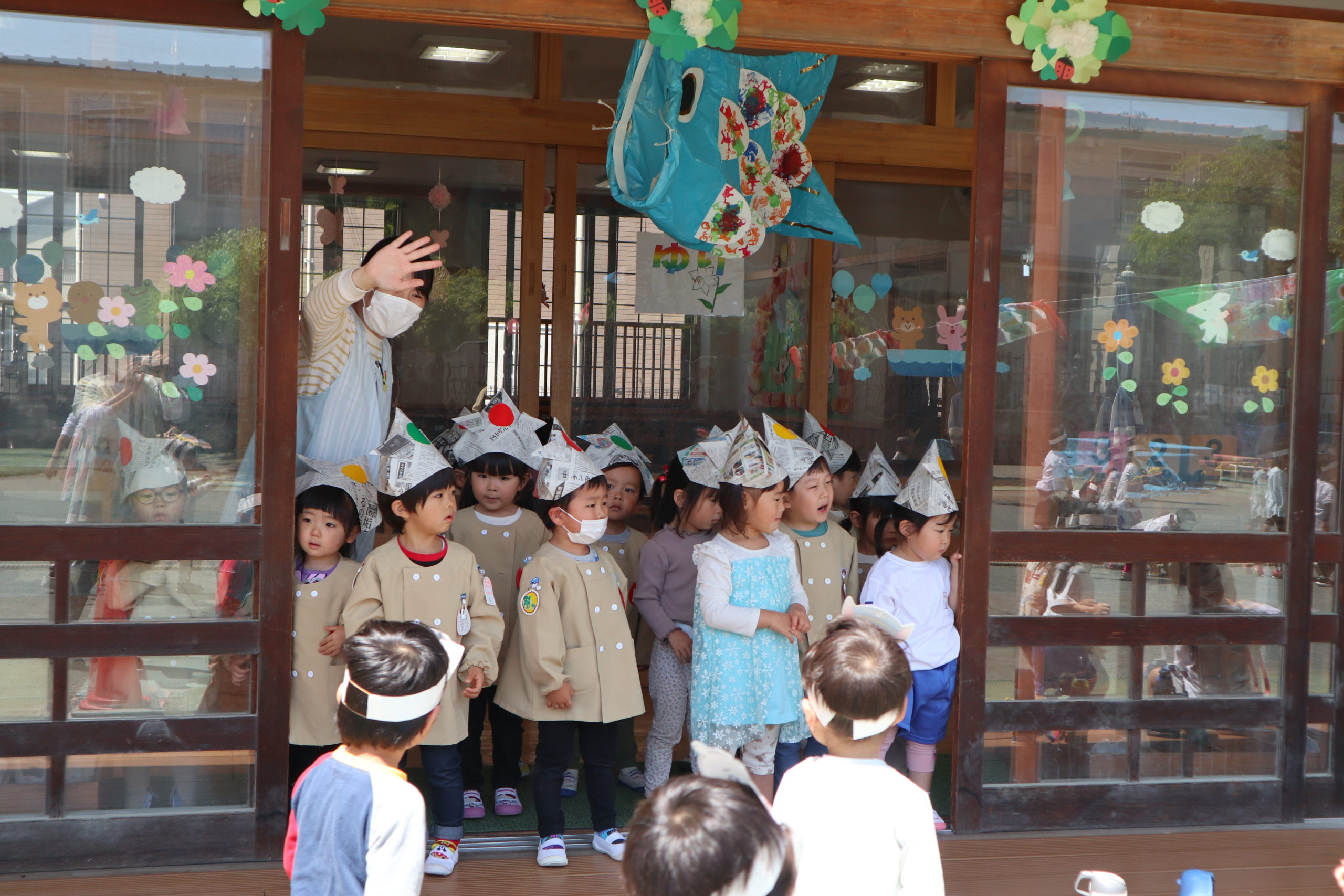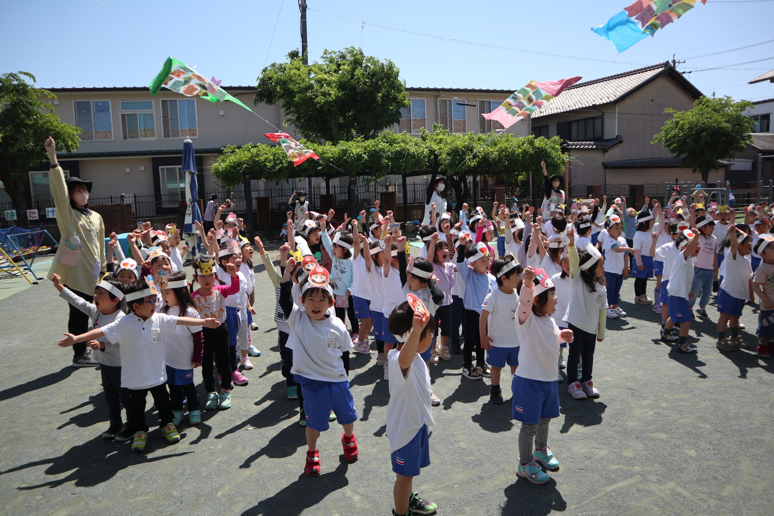 お休みの雨模様が一変して爽やかな青空が広がりました。年中組さんが作ったこいのぼりがすいすい泳いでいます。