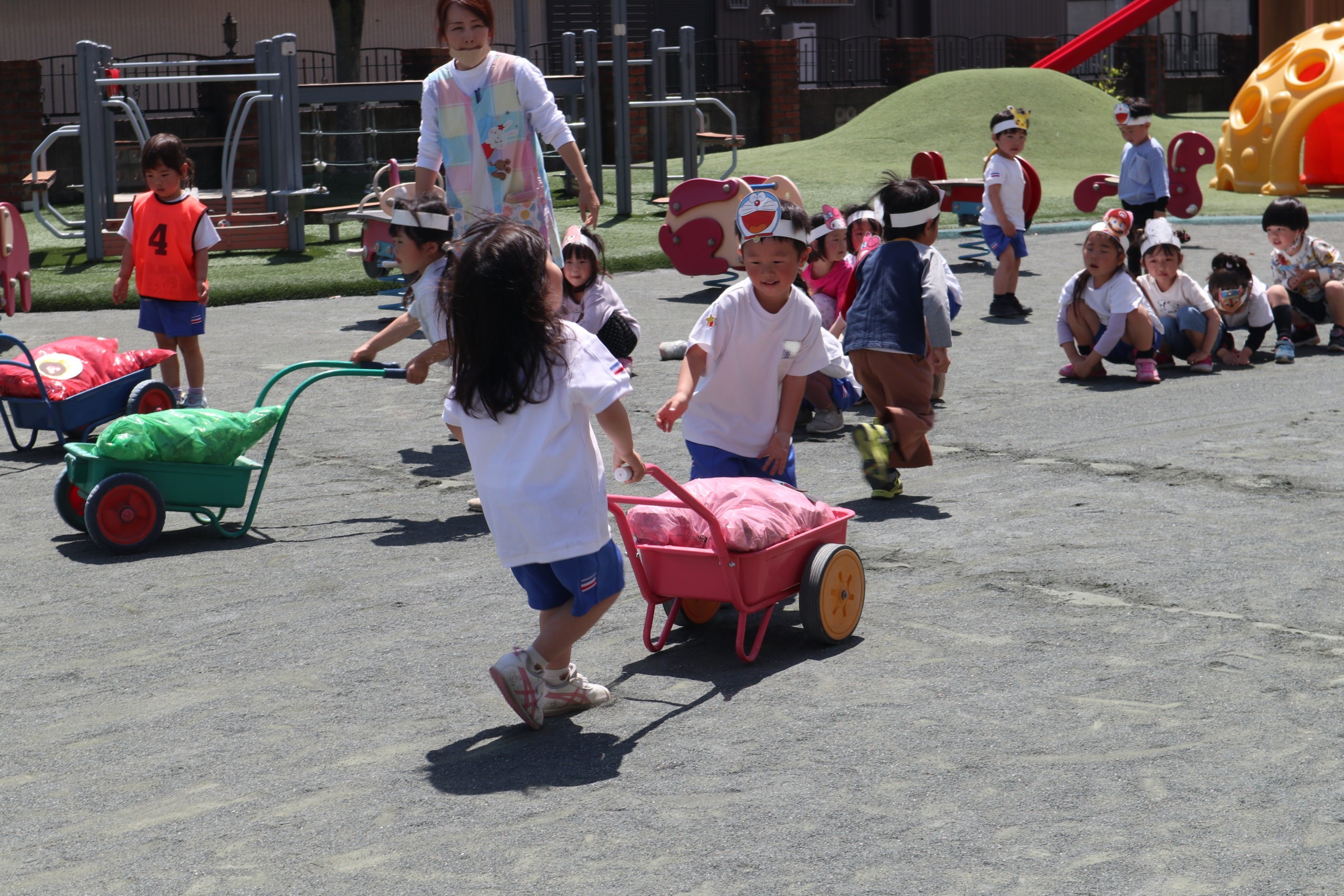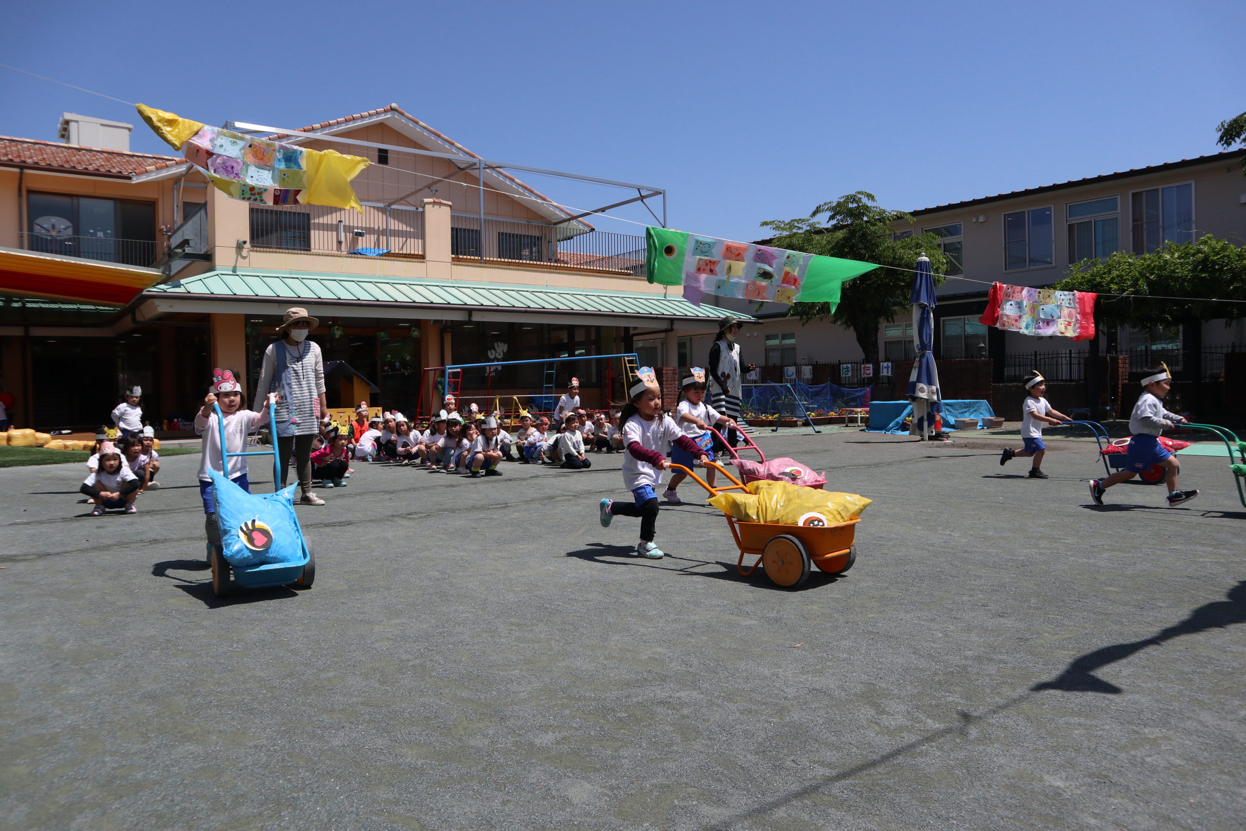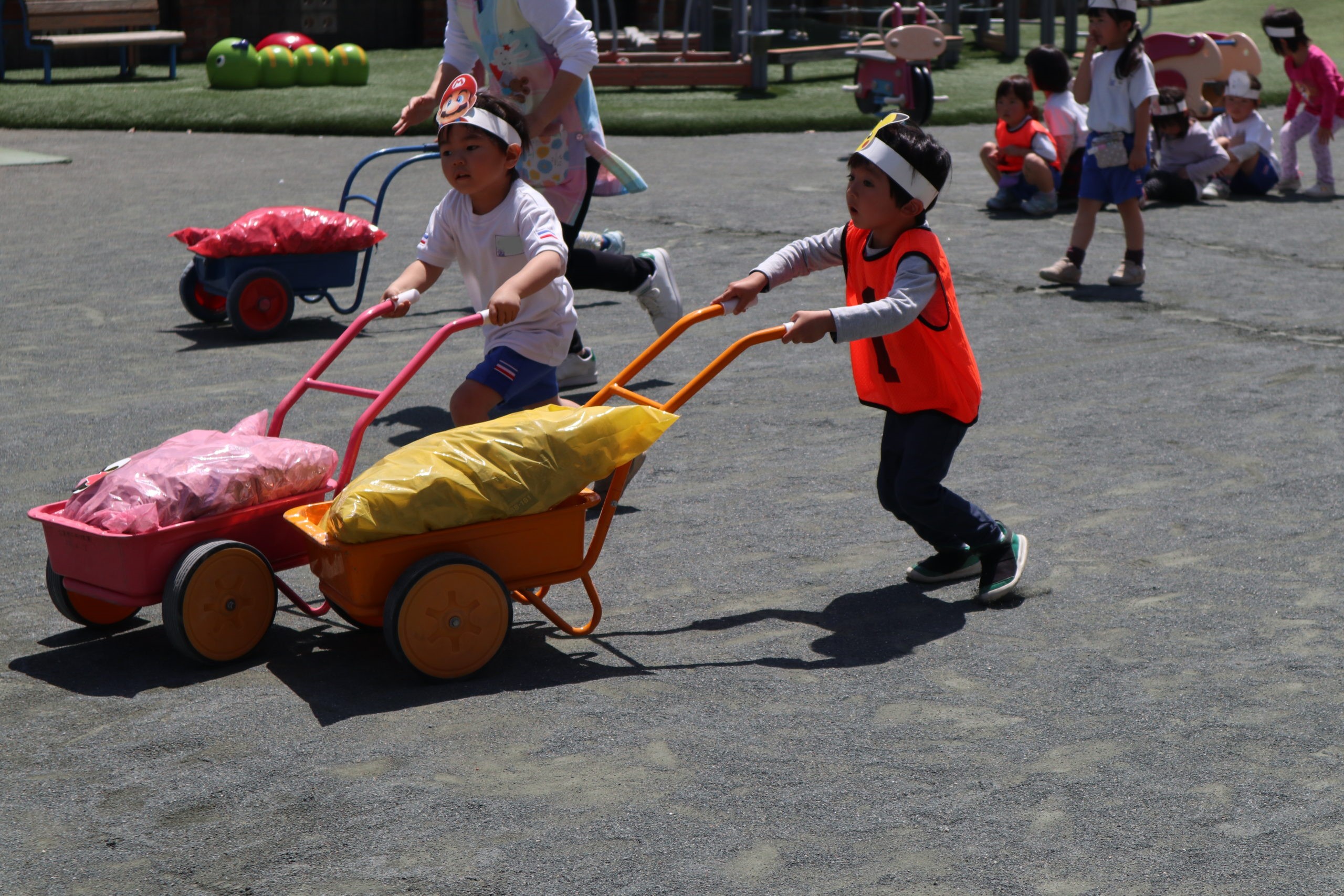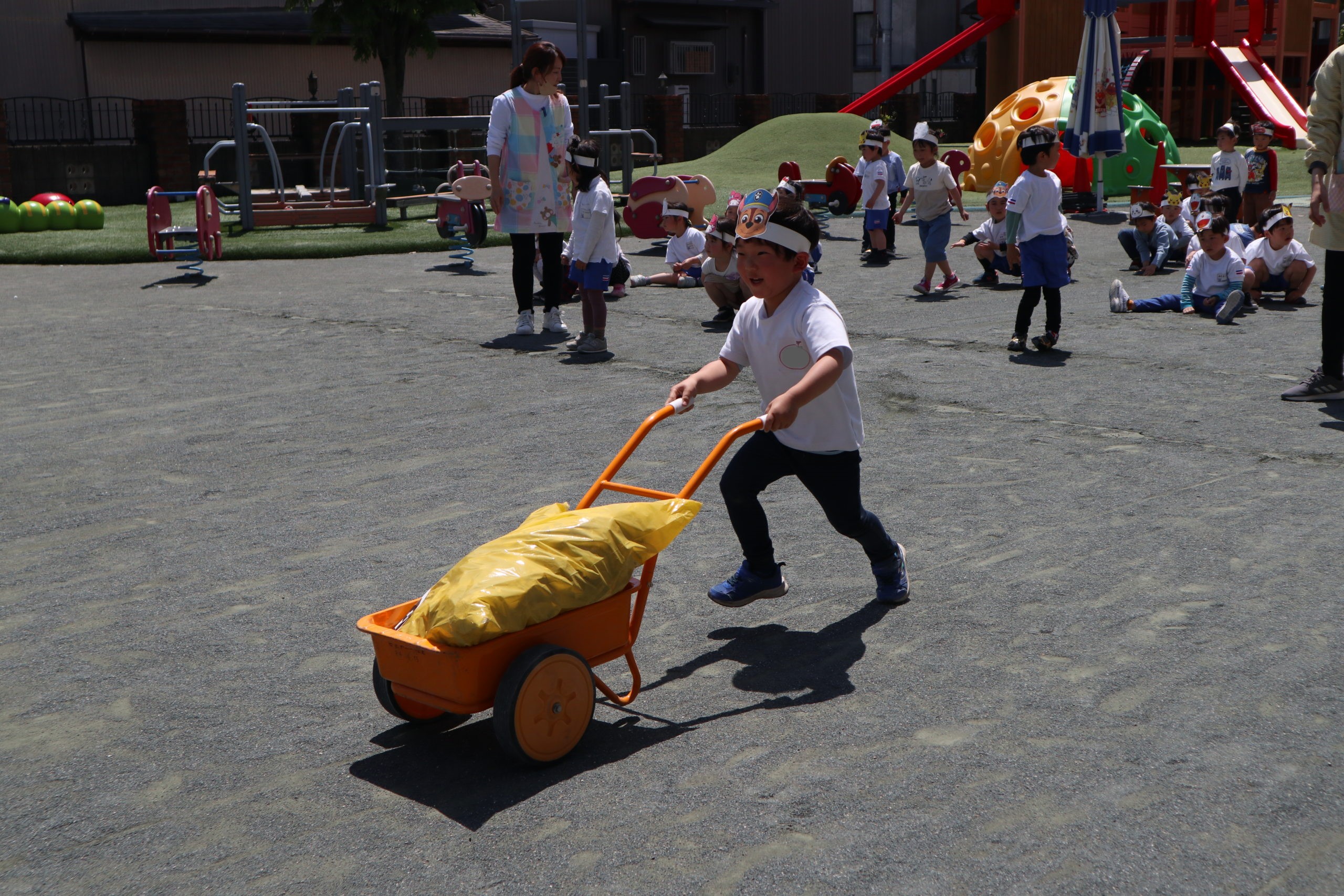 次の種目はこいのぼり運びリレー。みにこいのぼりをリアカーに乗せてかけっこするよ。ビュンビュン風をきって一生懸命走る姿がとてもかっこよかったよ。