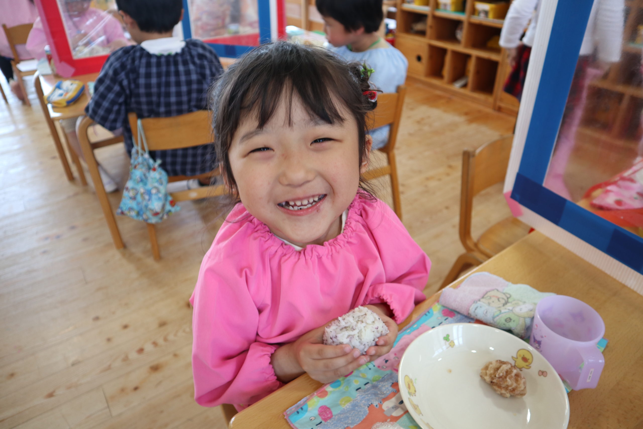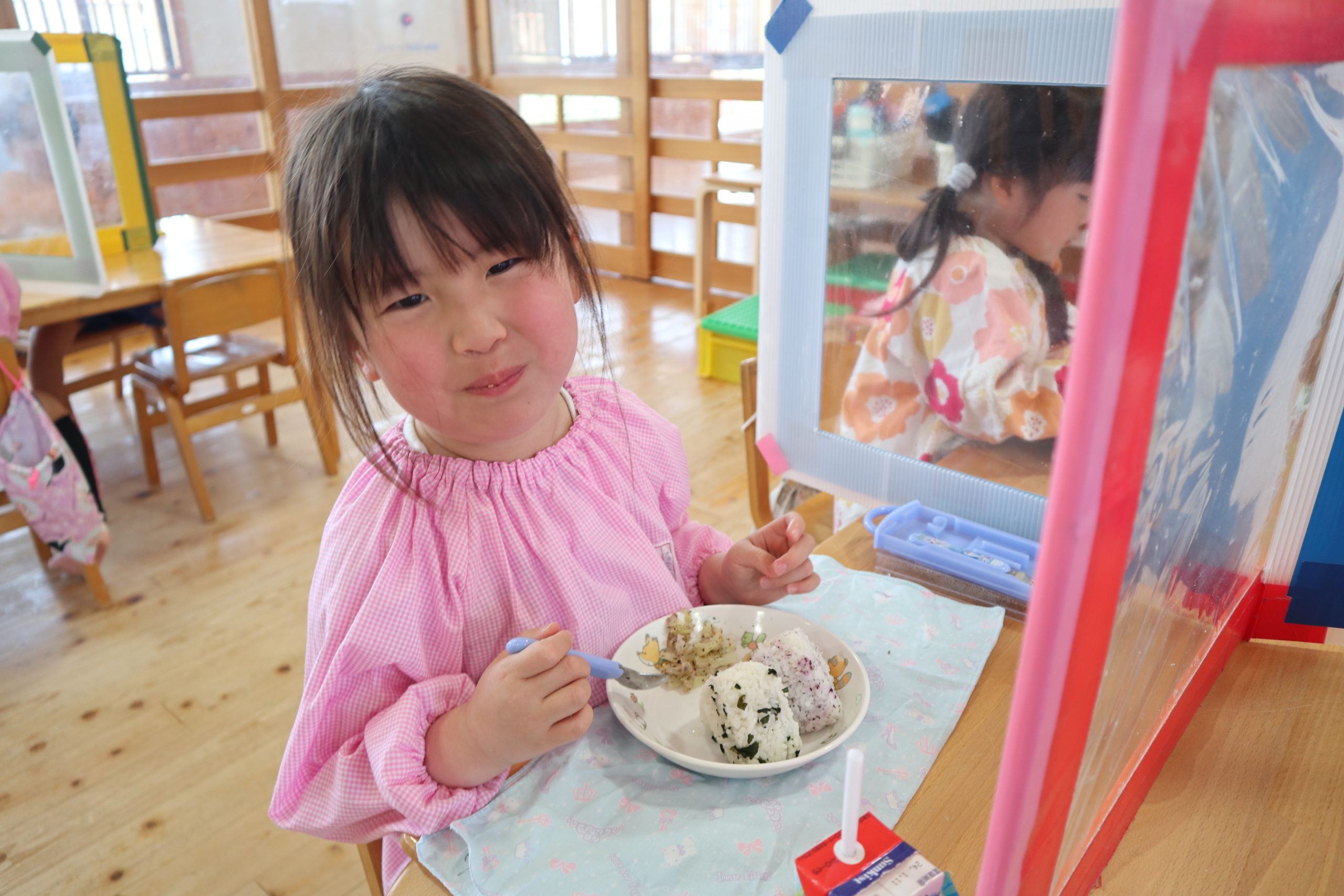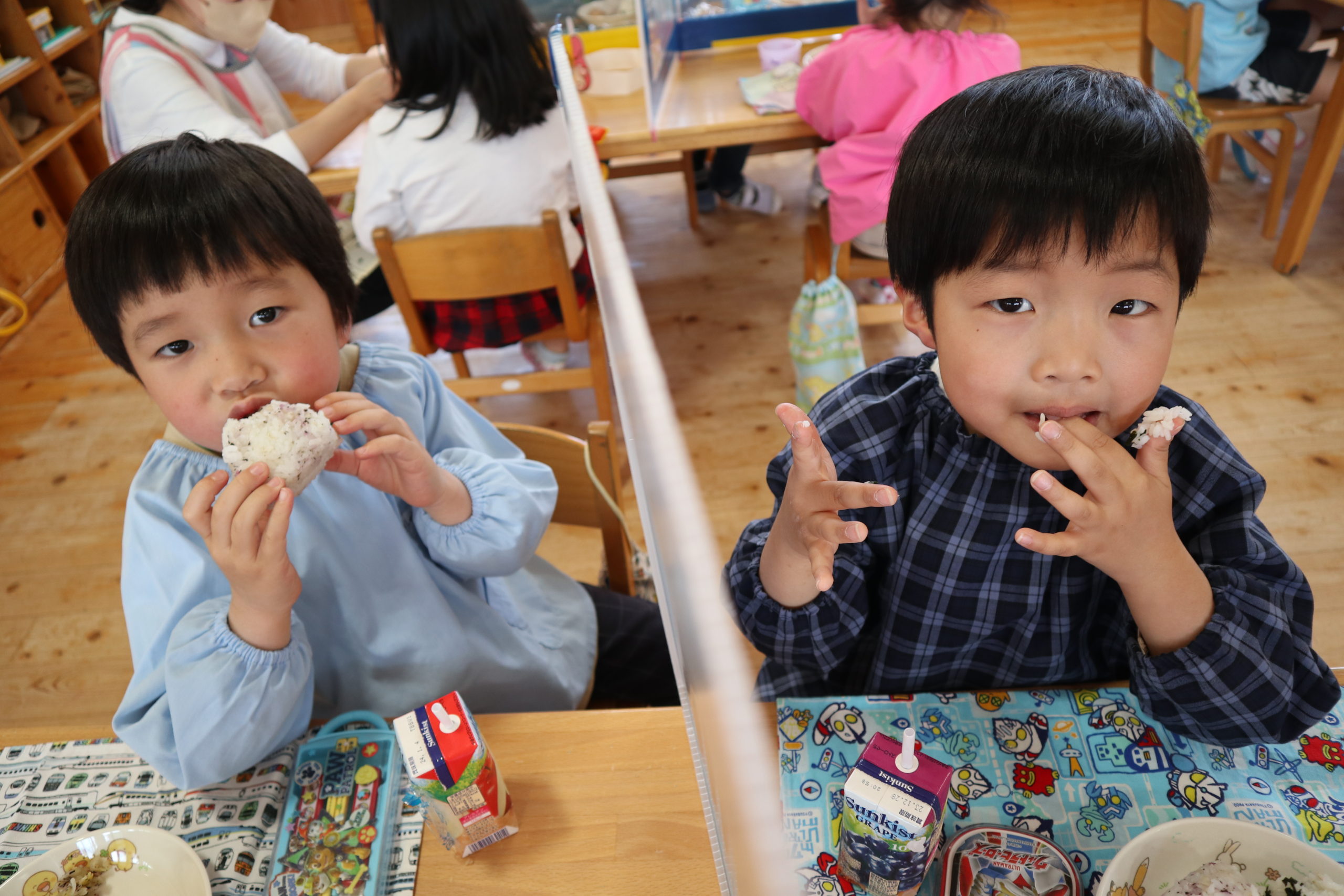 給食も今日はこいのぼりフェスタで特別メニュー♪調理員さんがひとつひとつ心を込めて握ってくれたおにぎりです。