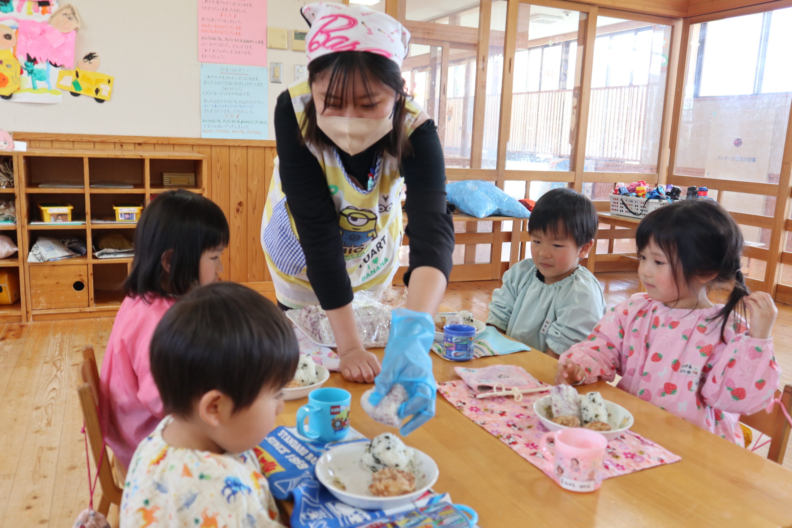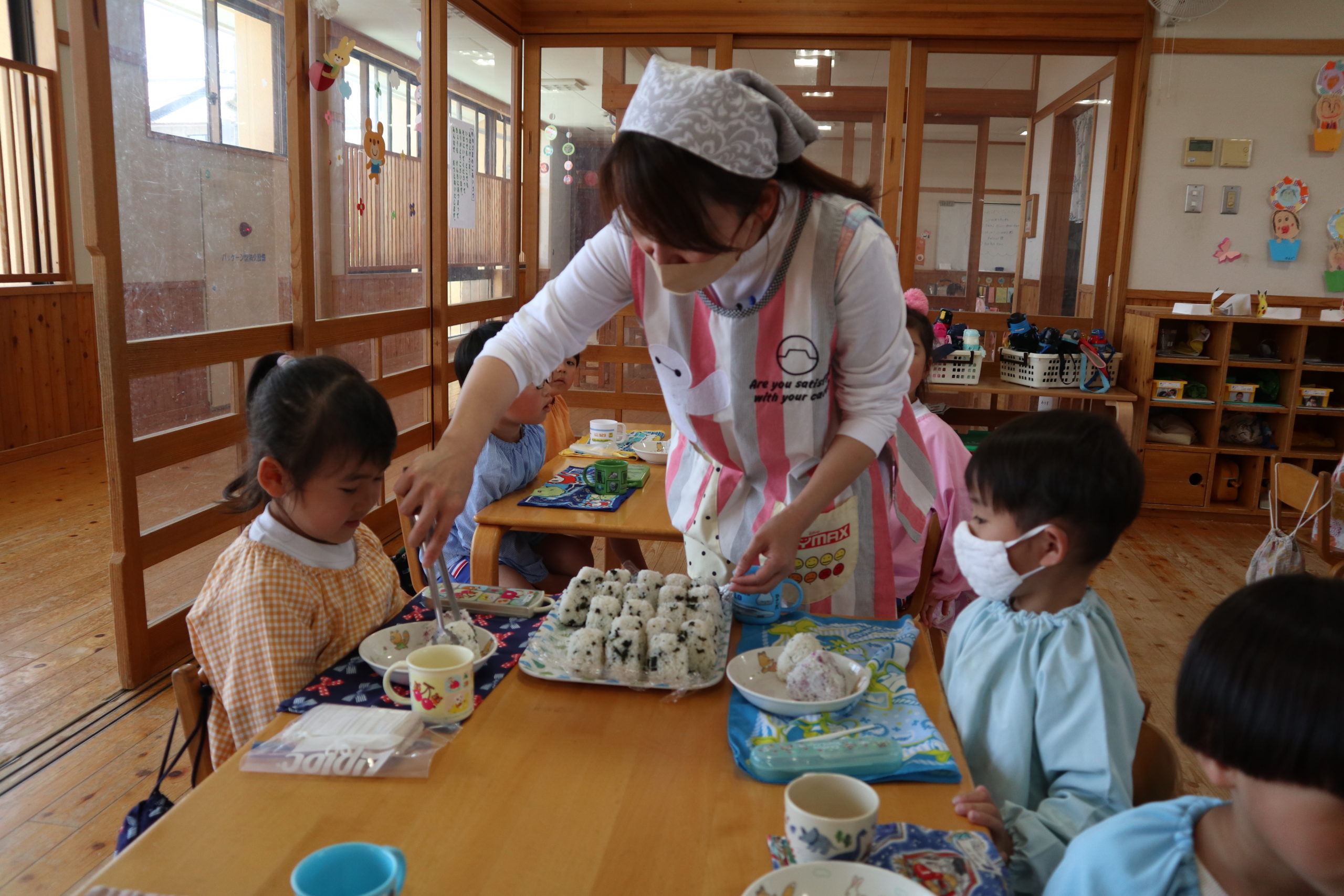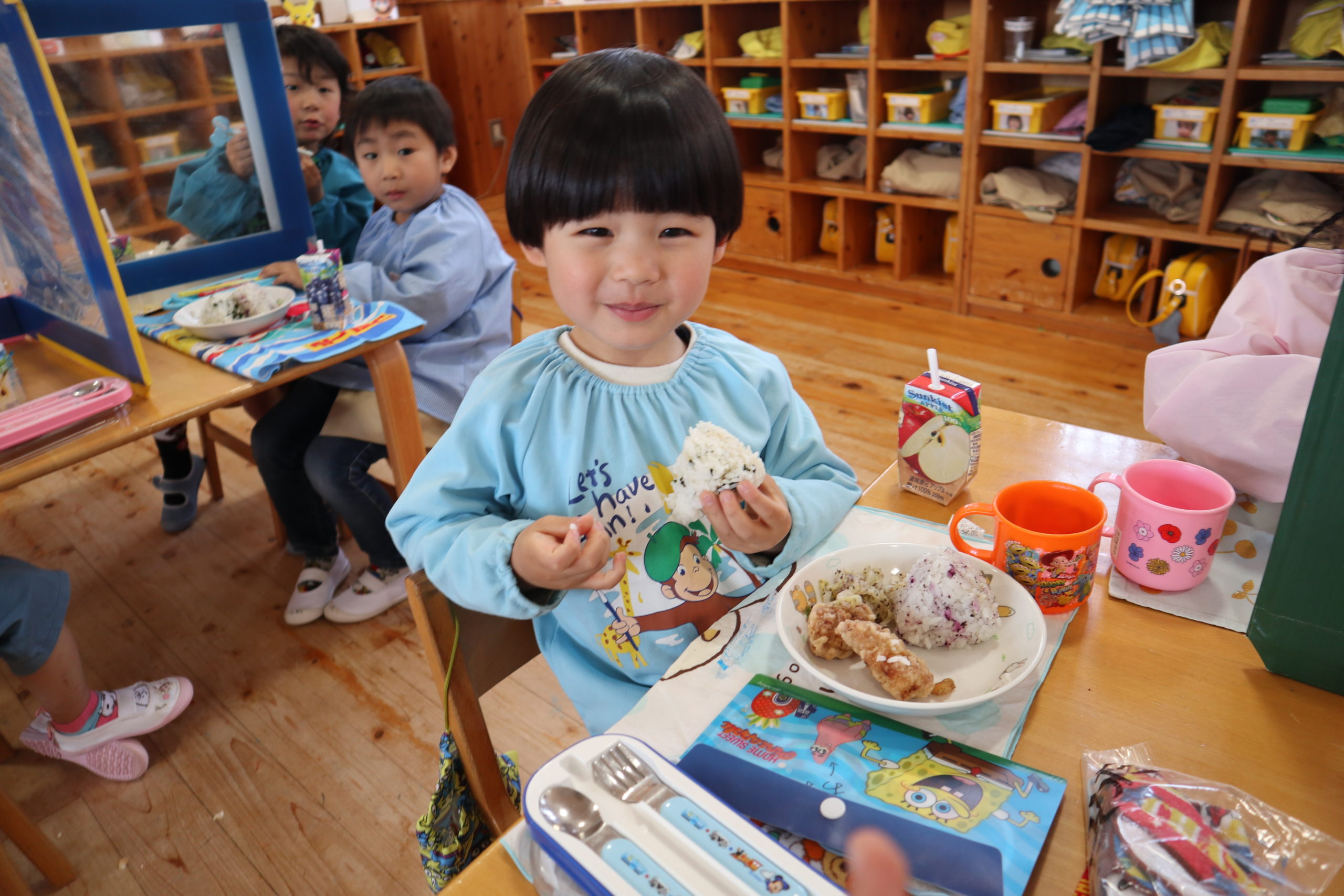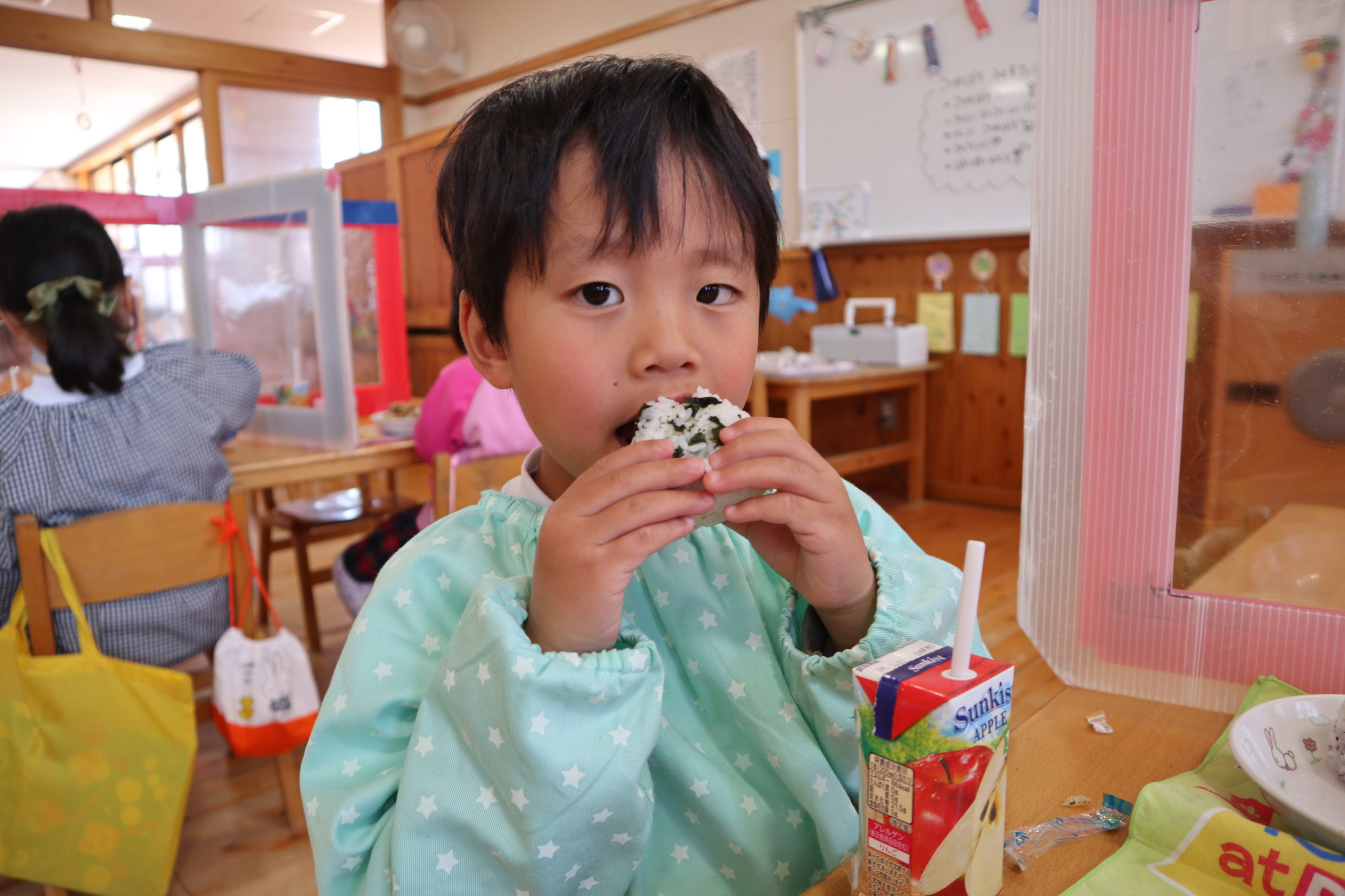 給食も今日はこいのぼりフェスタで特別メニュー♪調理員さんがひとつひとつ心を込めて握ってくれたおにぎりです。