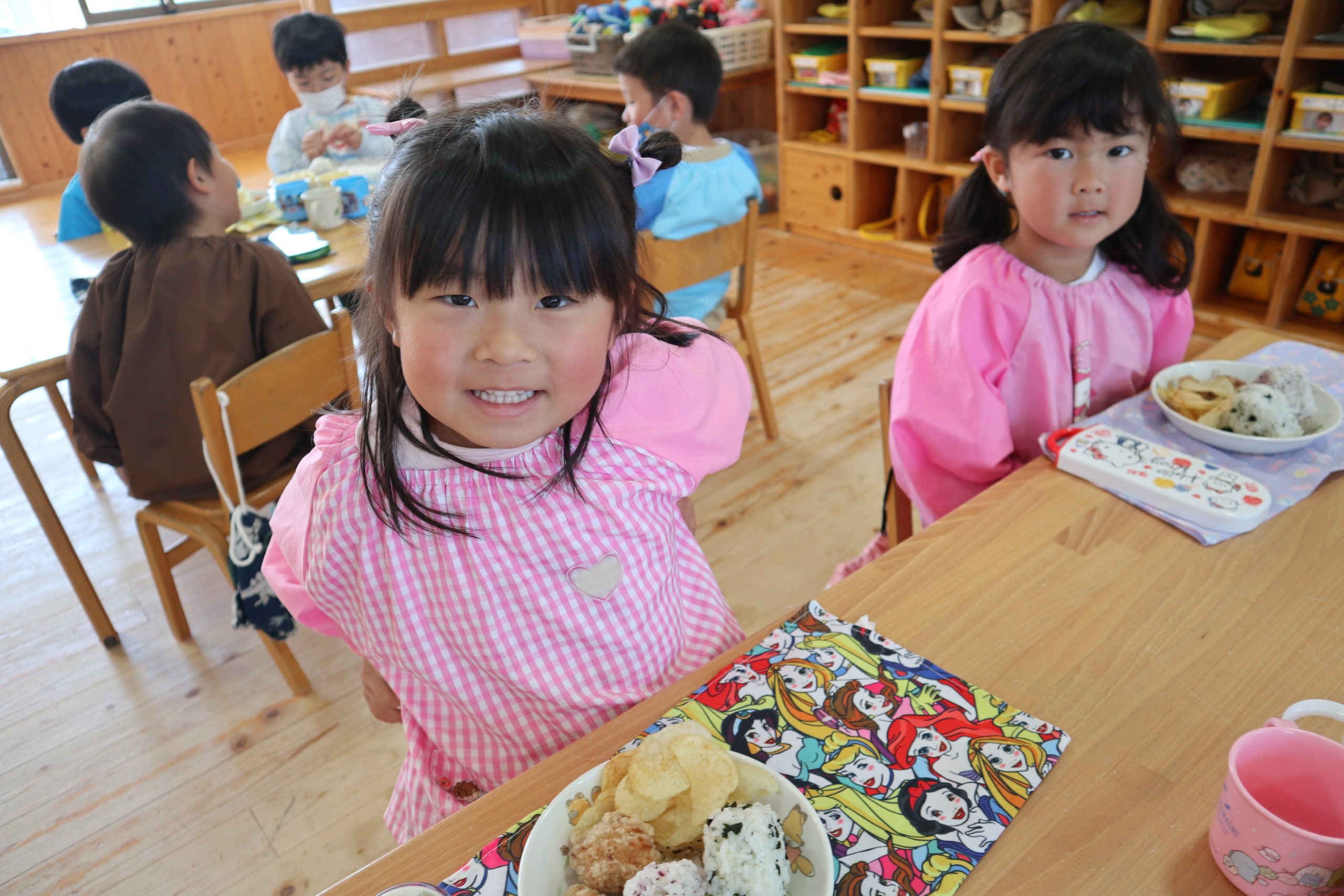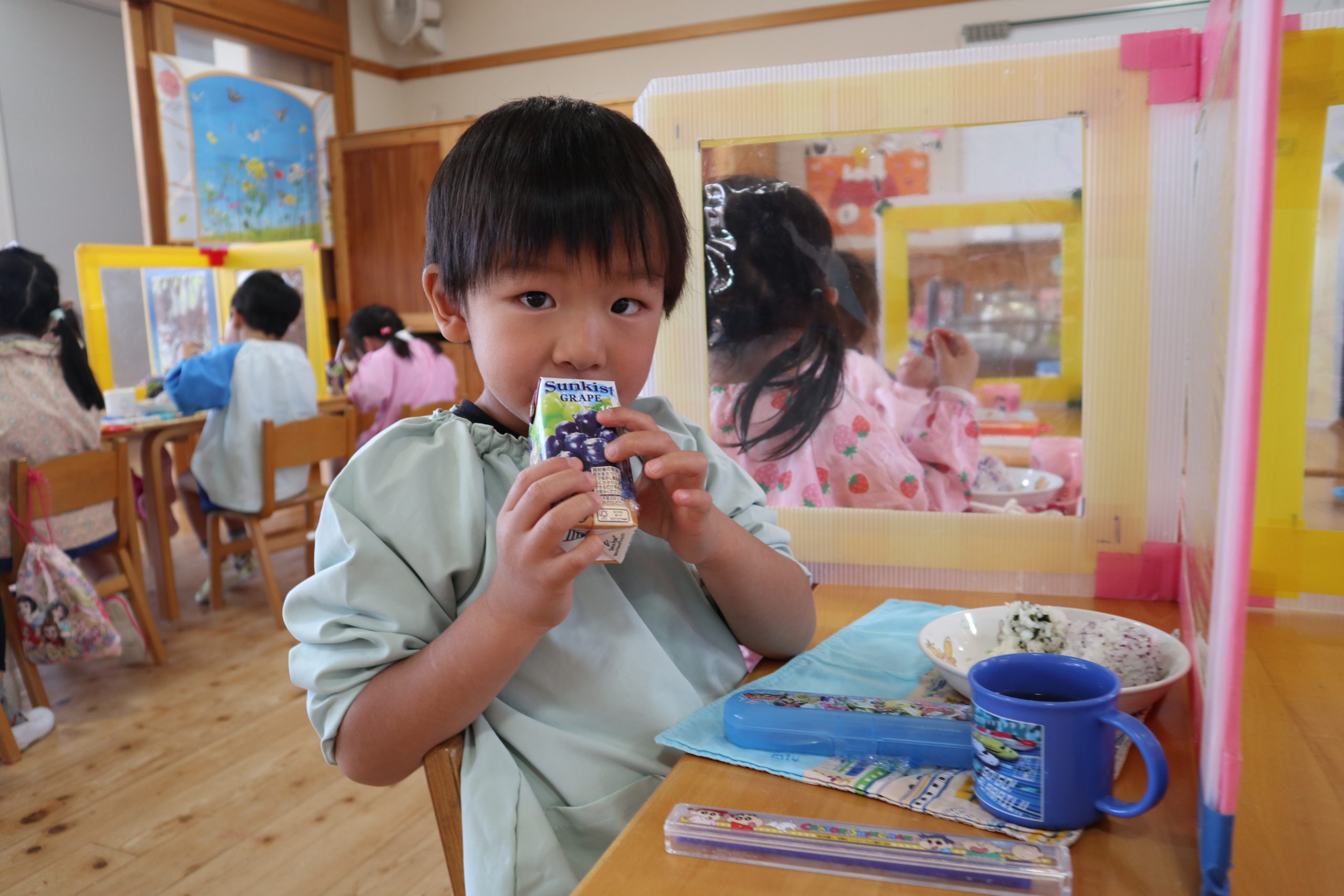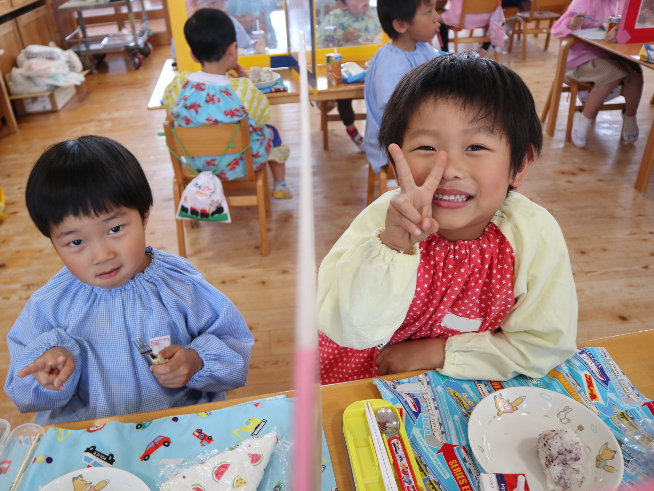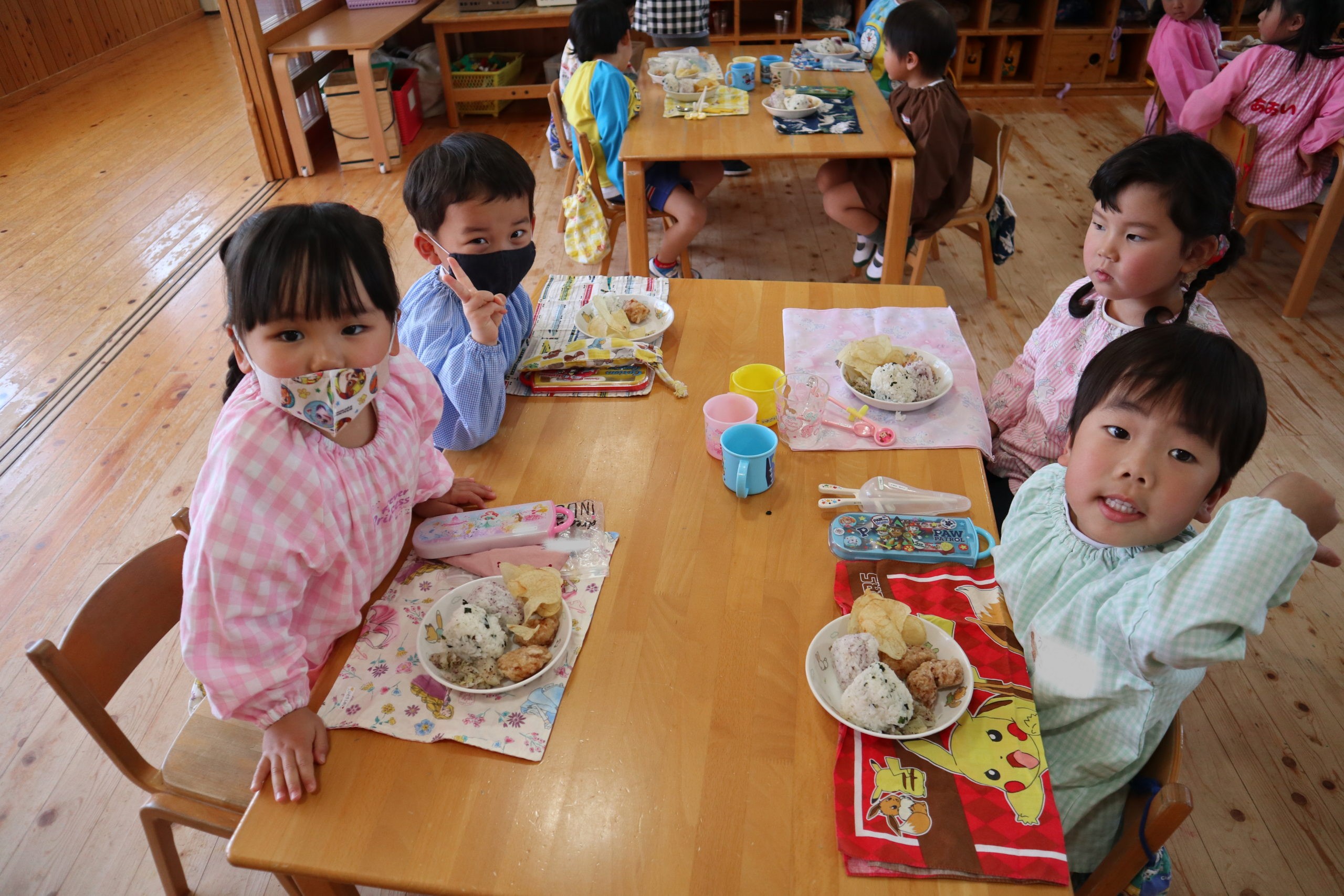 おひさまの下で元気いっぱい遊んだ後の給食はとってもおいしいね。みんなの笑顔が集まりました。