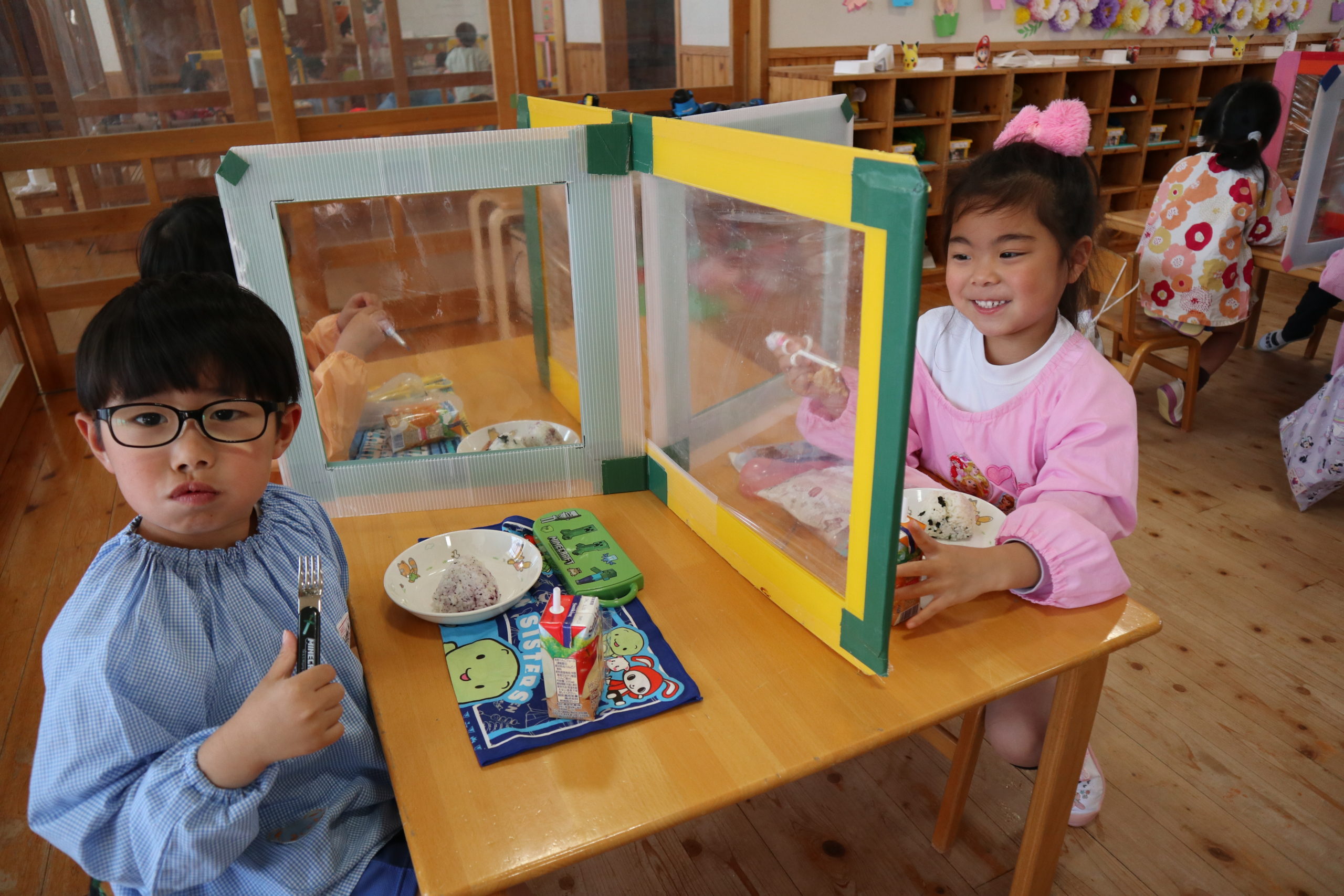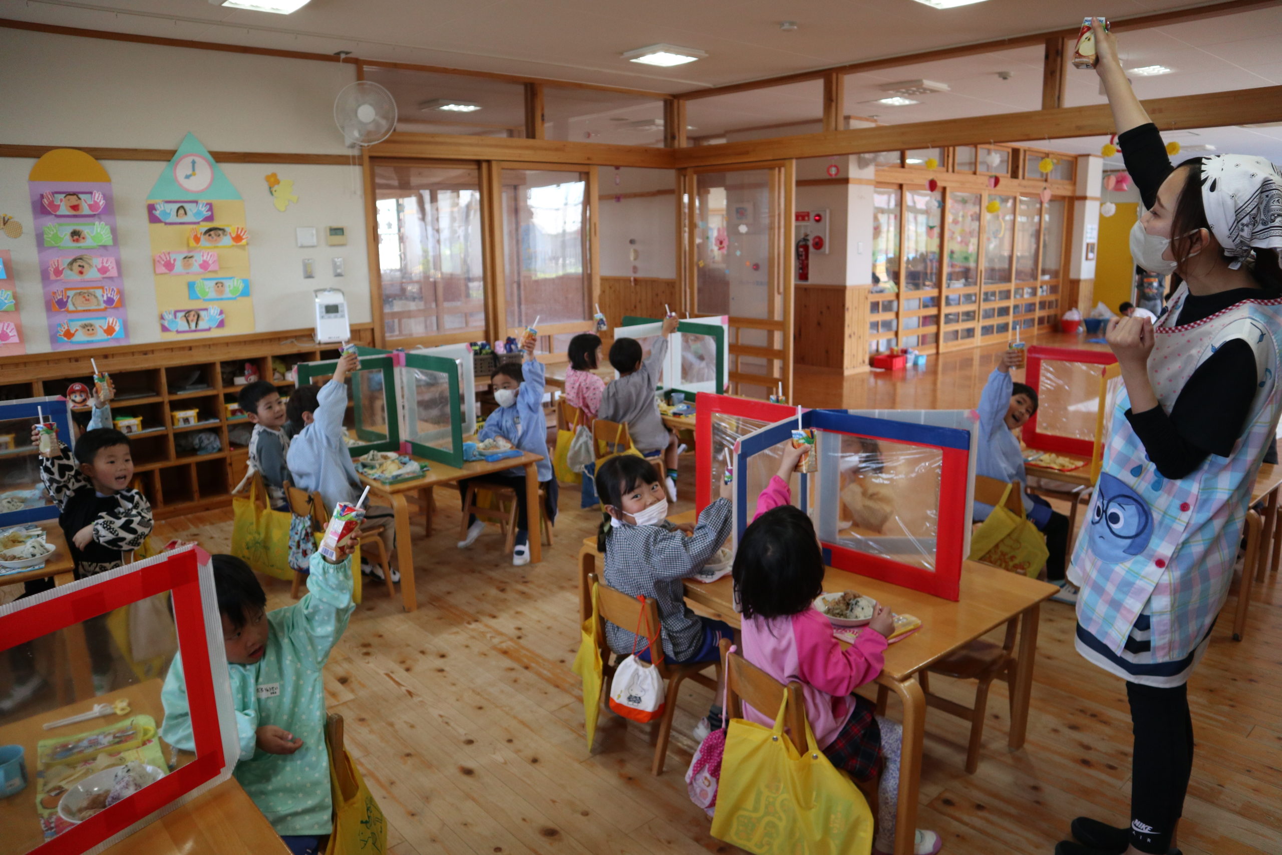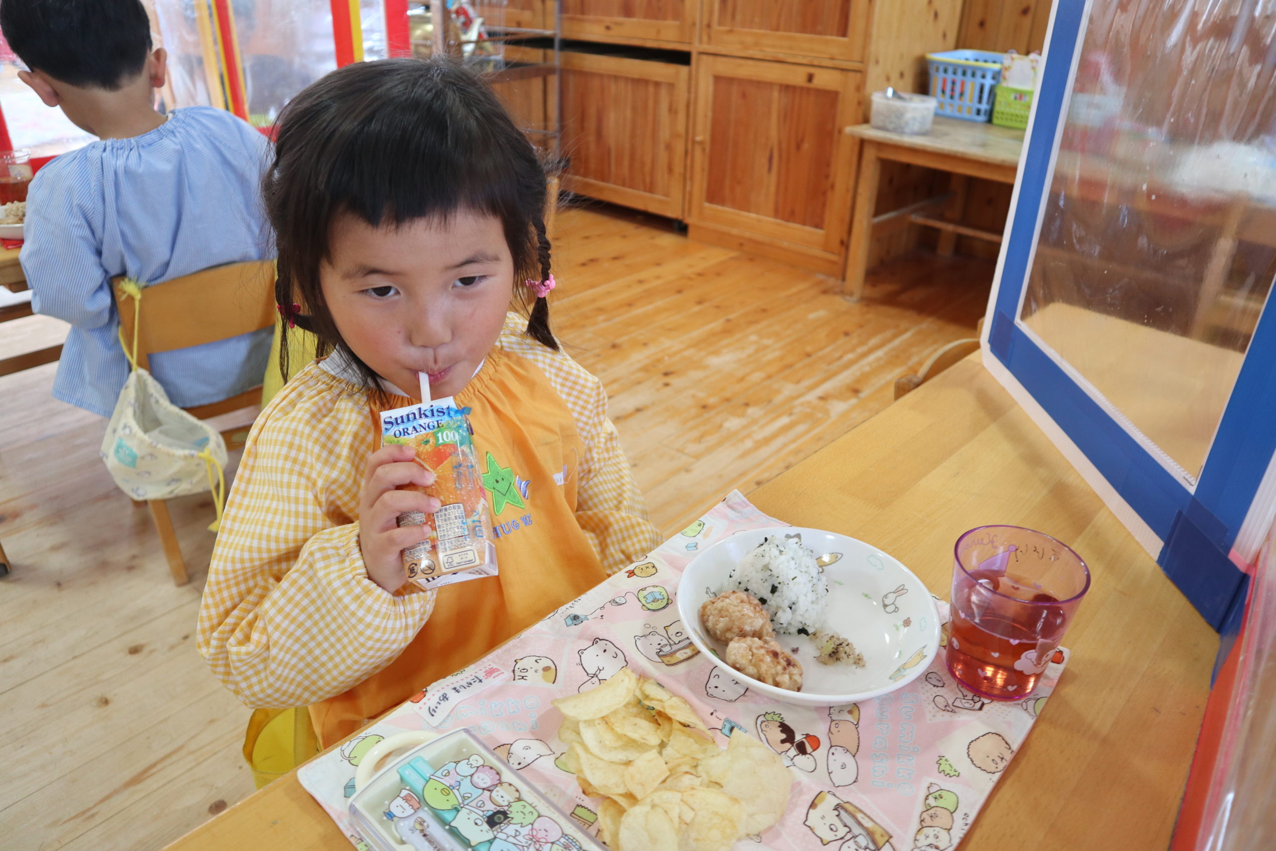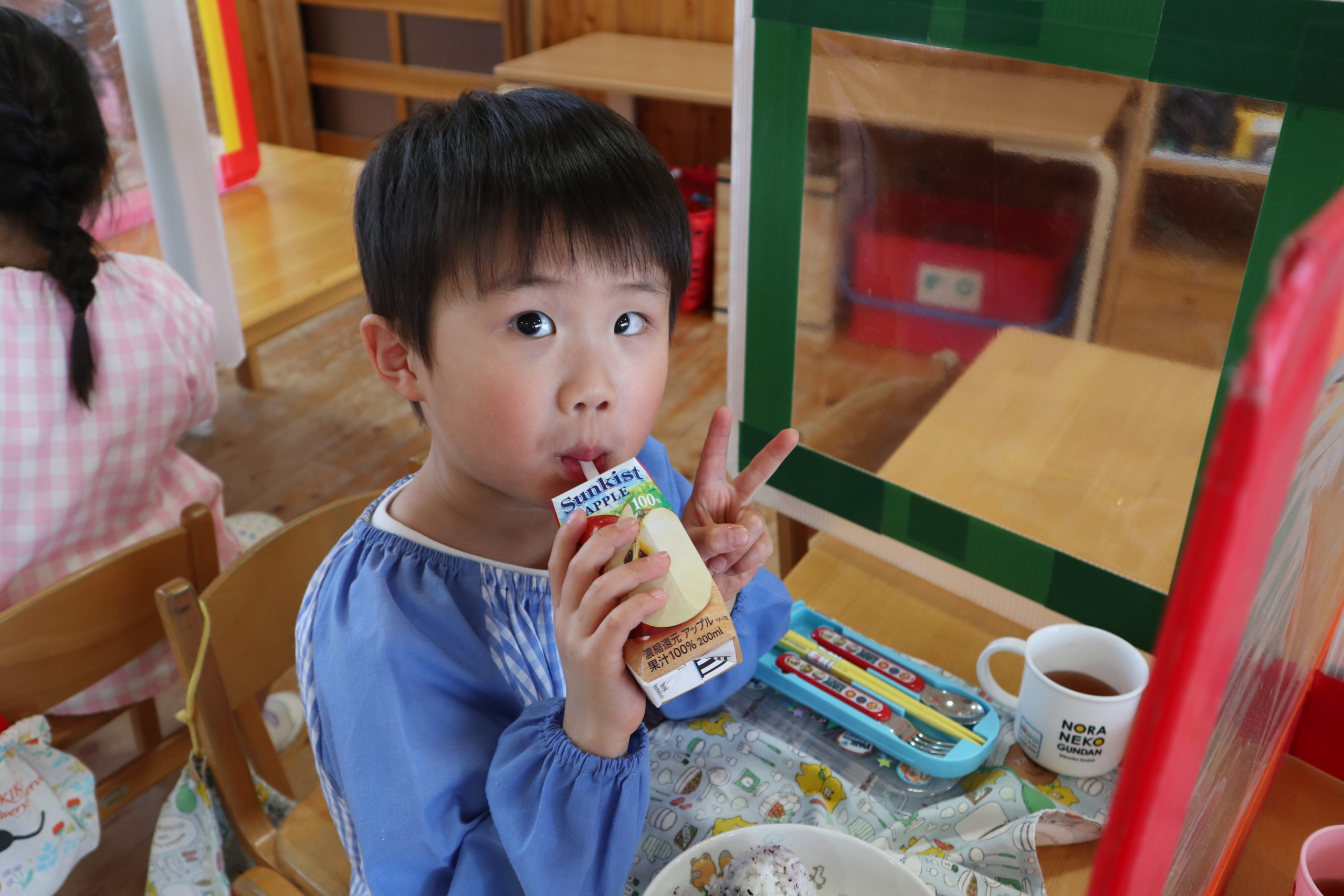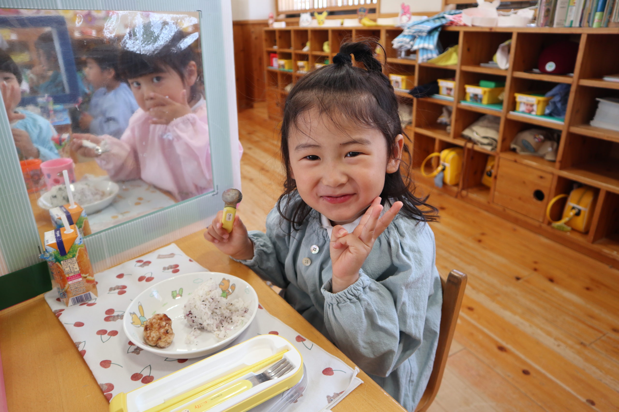 おひさまの下で元気いっぱい遊んだ後の給食はとってもおいしいね。みんなの笑顔が集まりました。