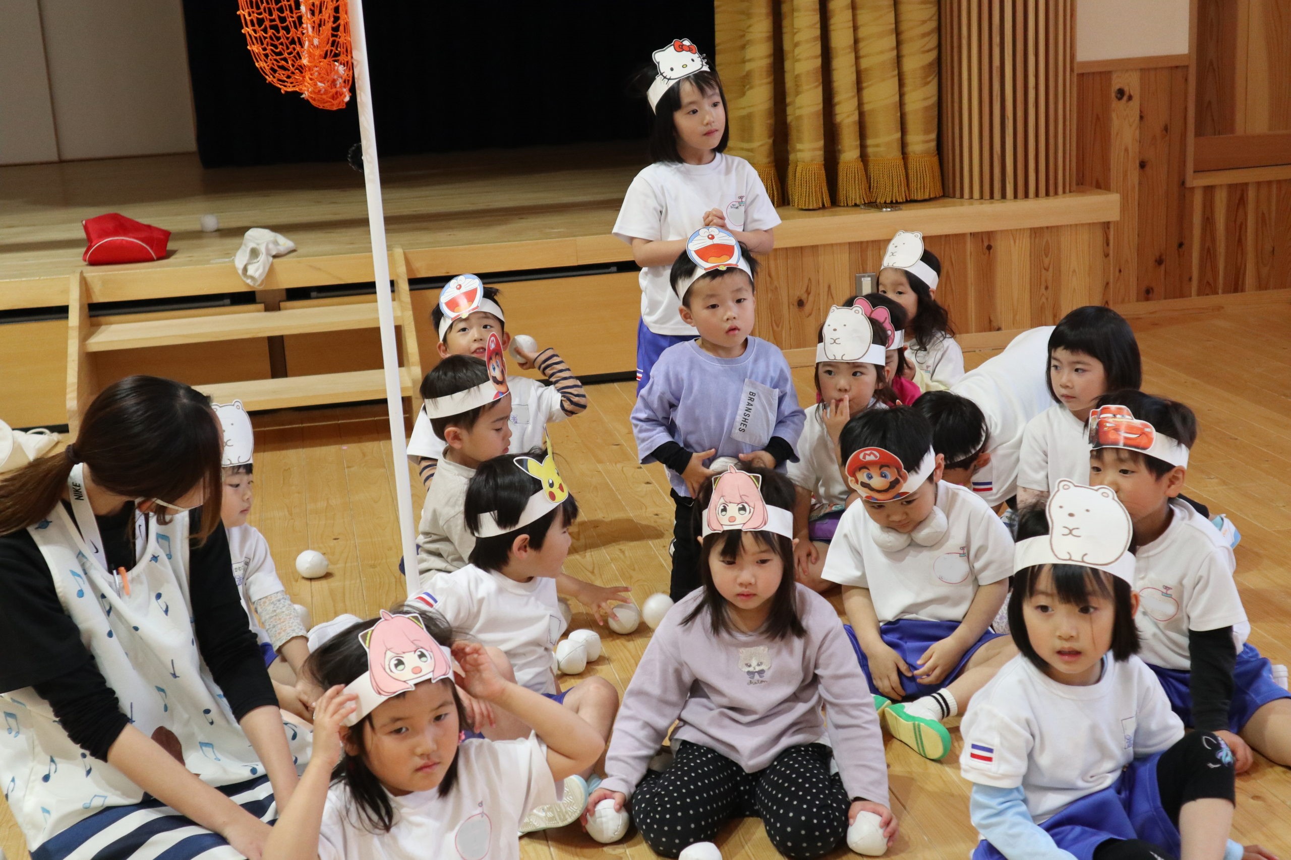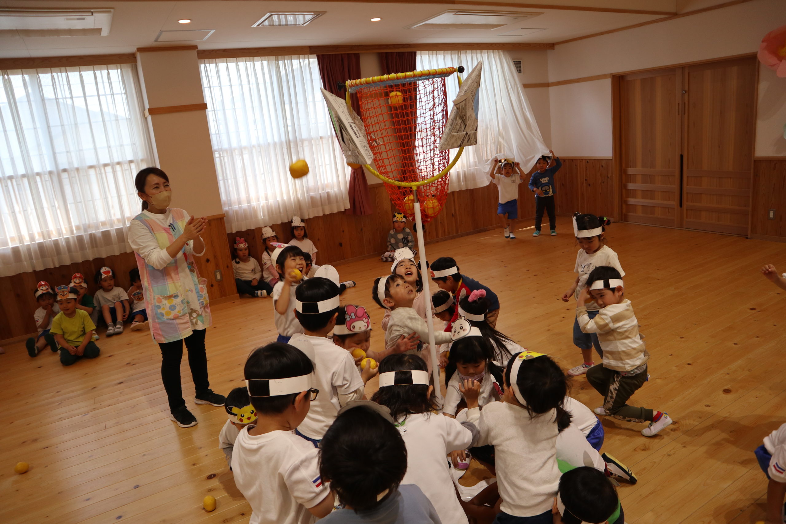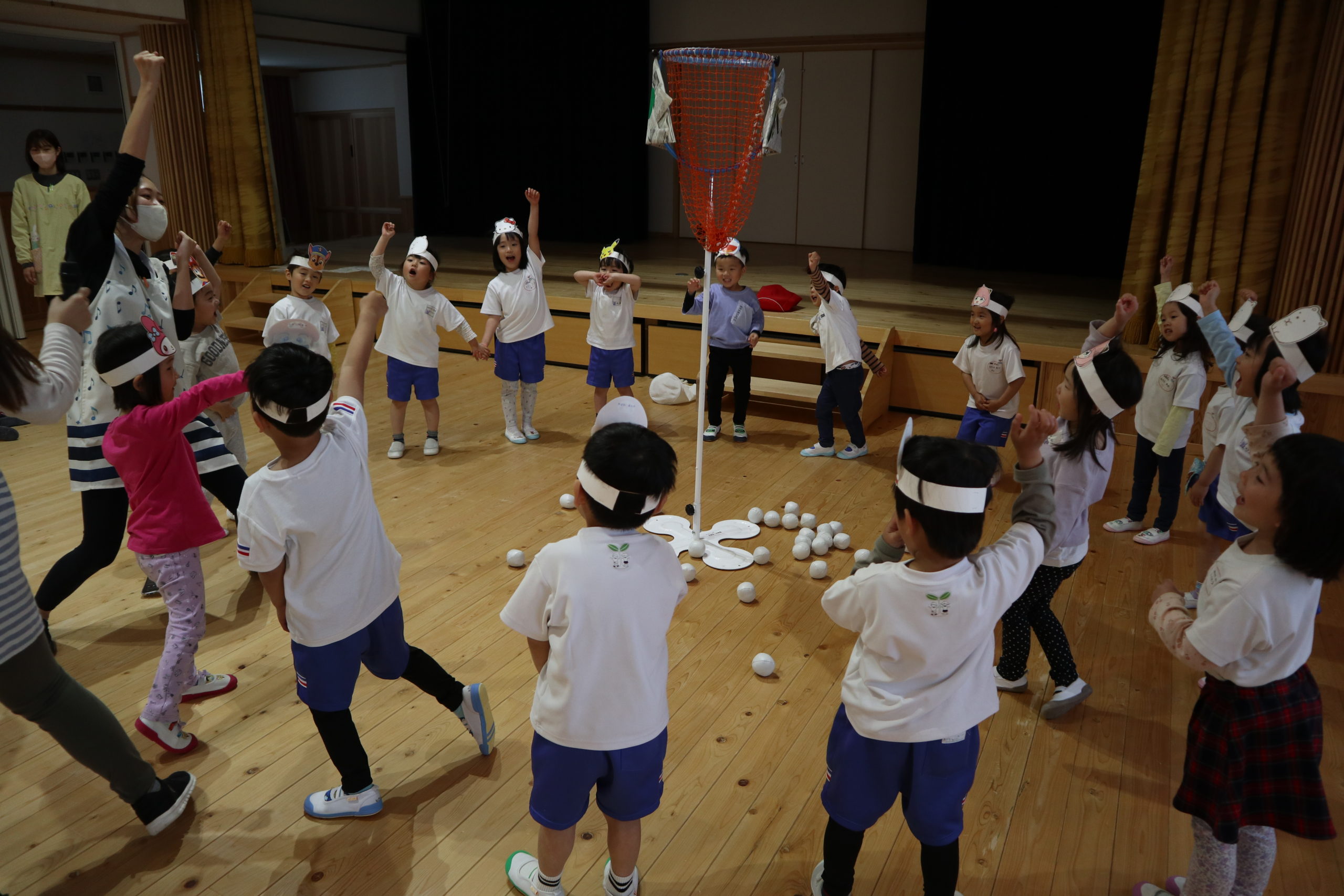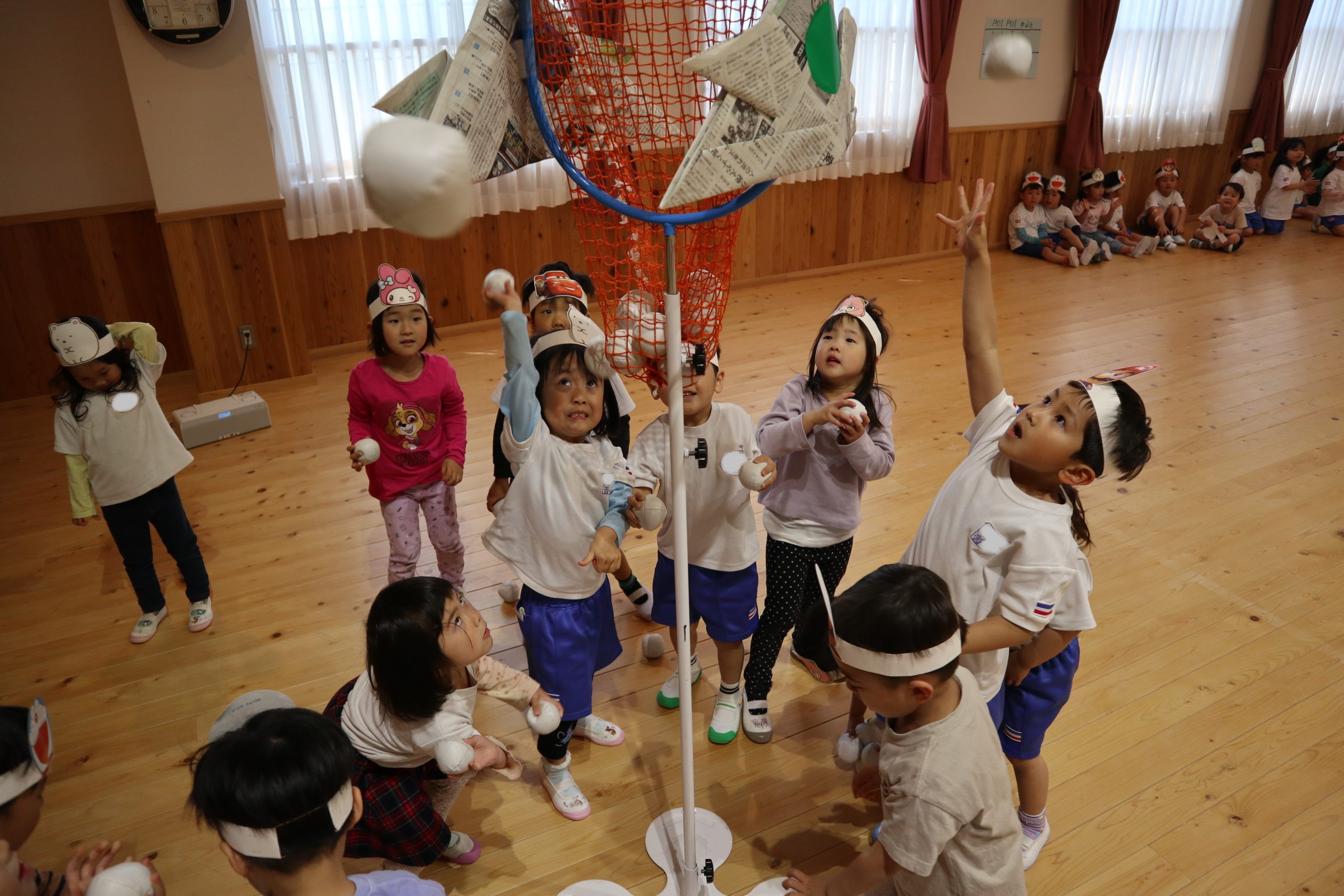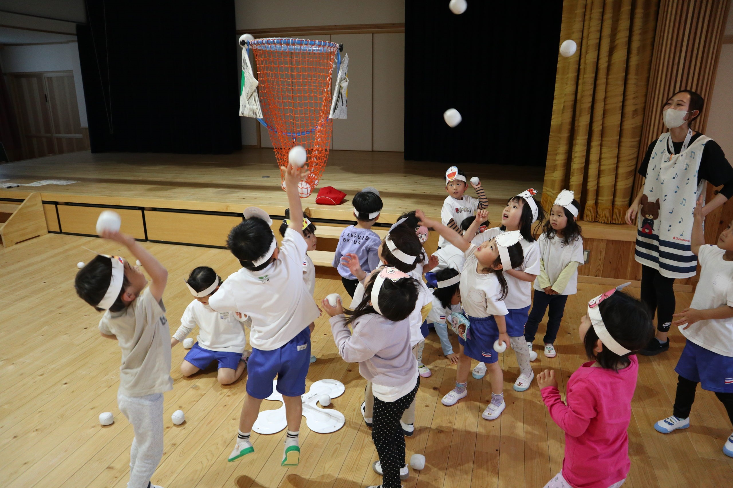 みんなの背よりずいぶん高いかごを目掛けて玉を投げていたよ。歓声を上げながらがんばるこどもたちに先生たちも笑顔でエールを送っていました。