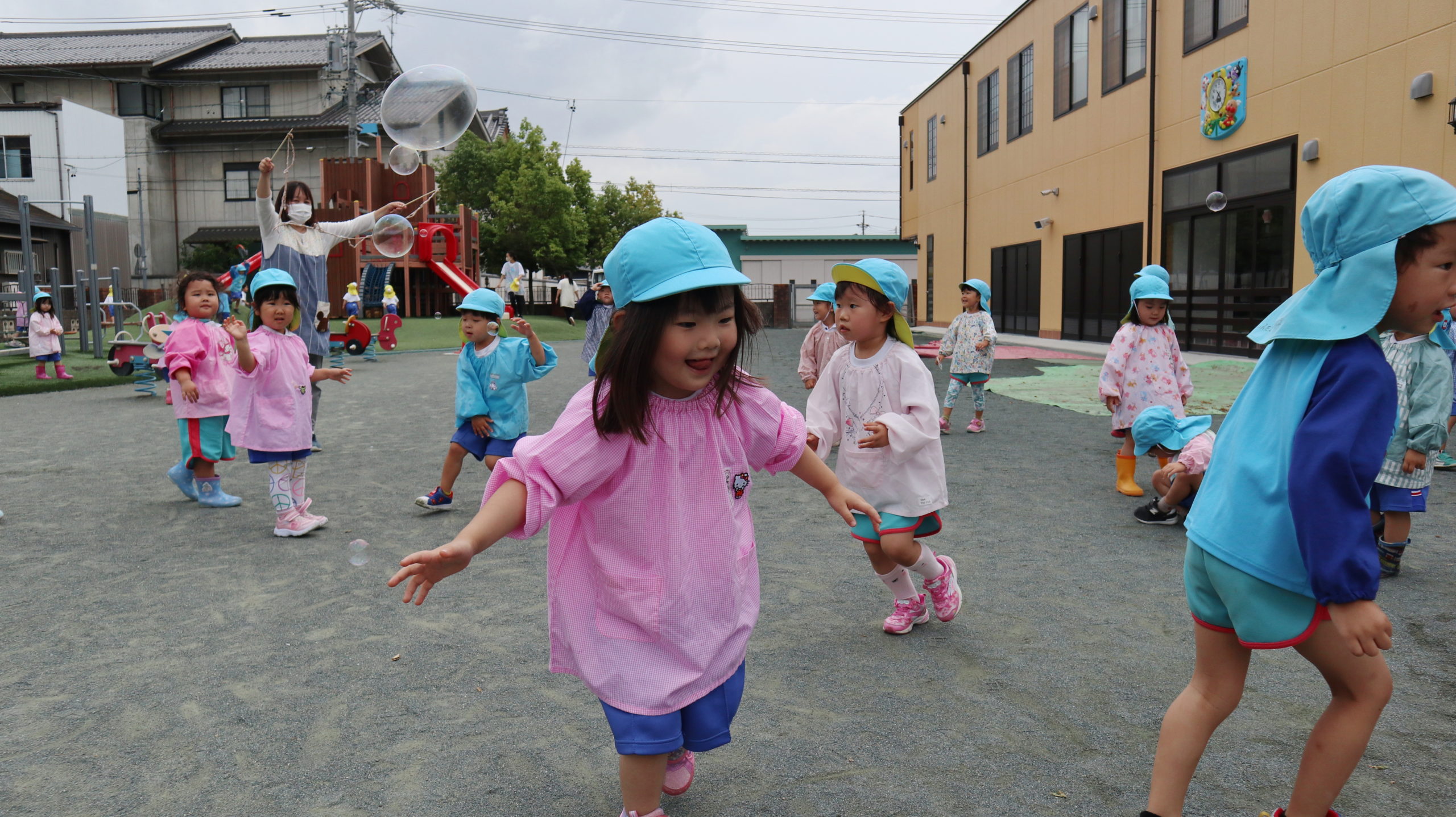 「きゃー!待ってー!」しゃぼんだまを追いかけるよ!