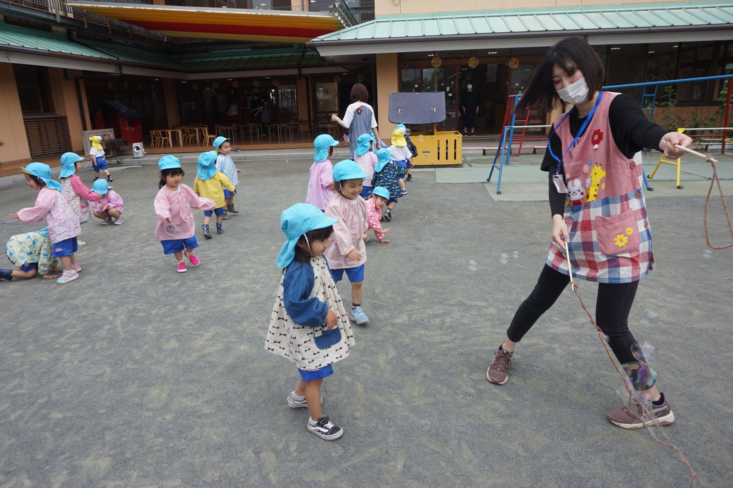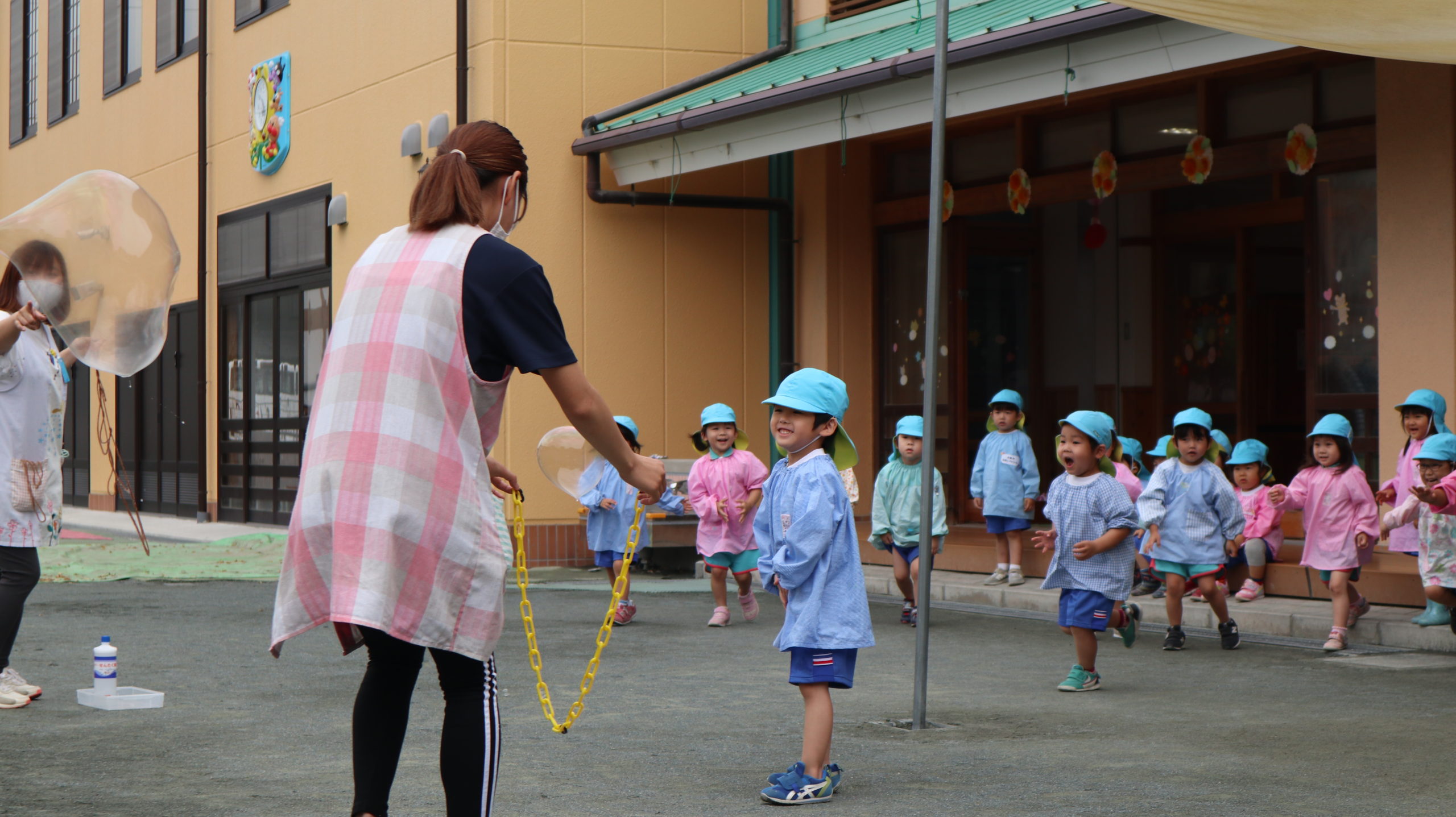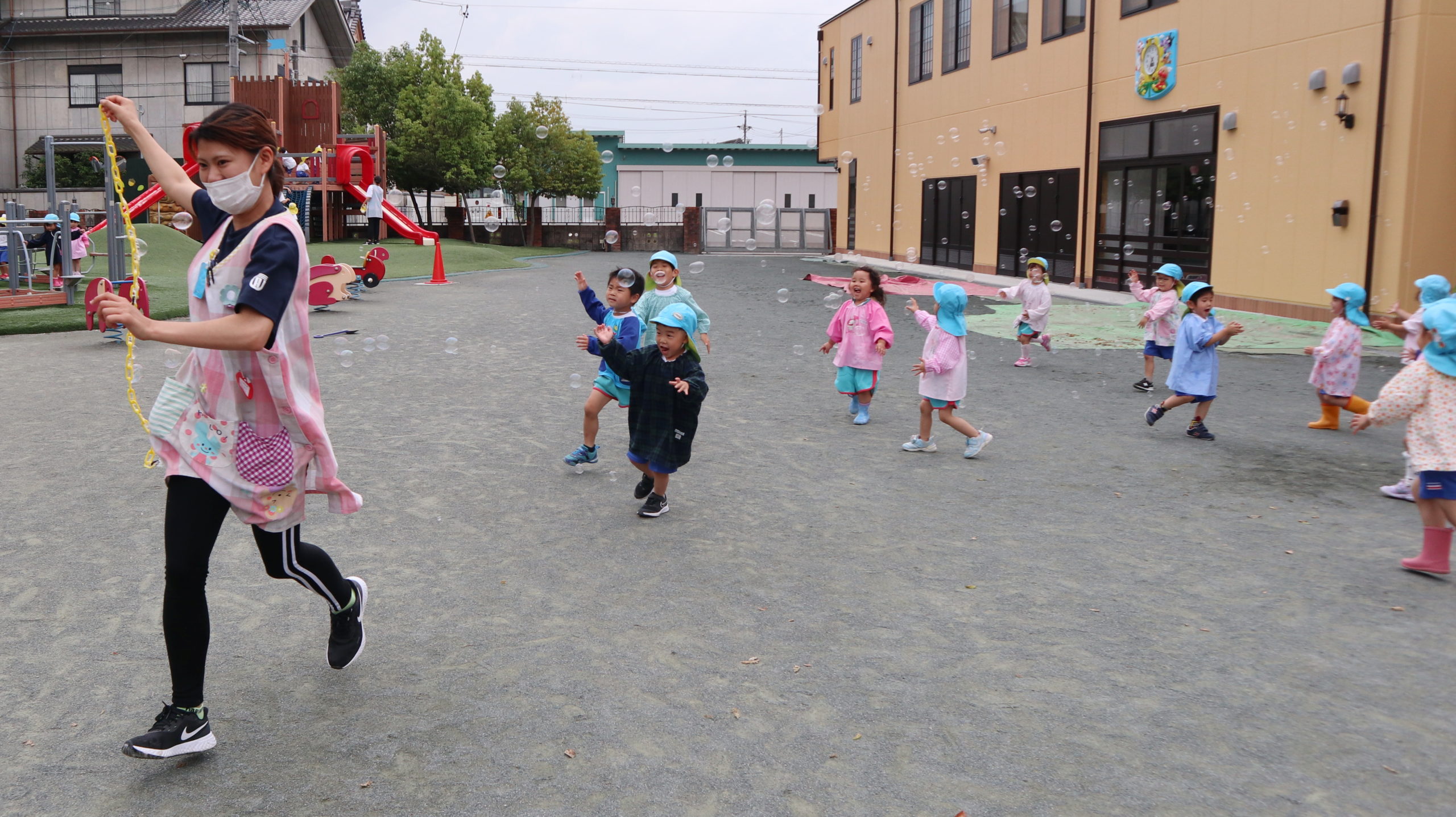 みどり先生が黄色い鎖を持って走ると、小さなしゃぼんだまでいっぱい!