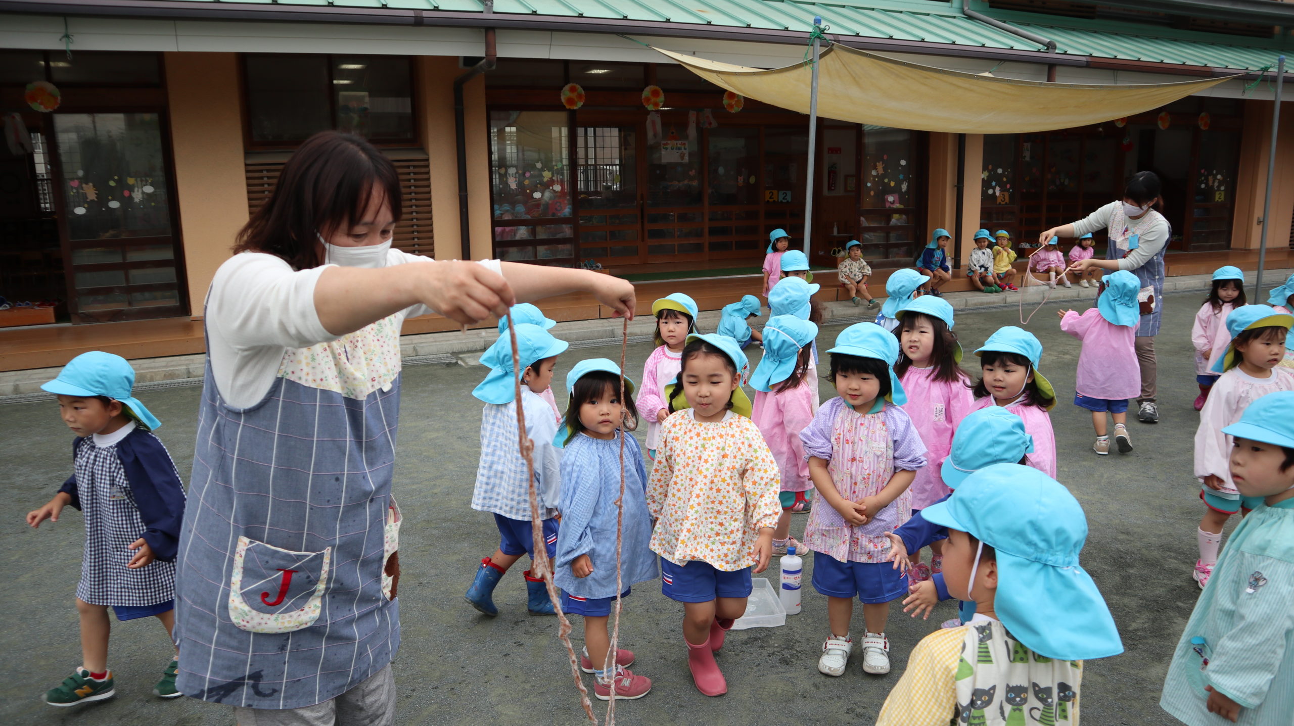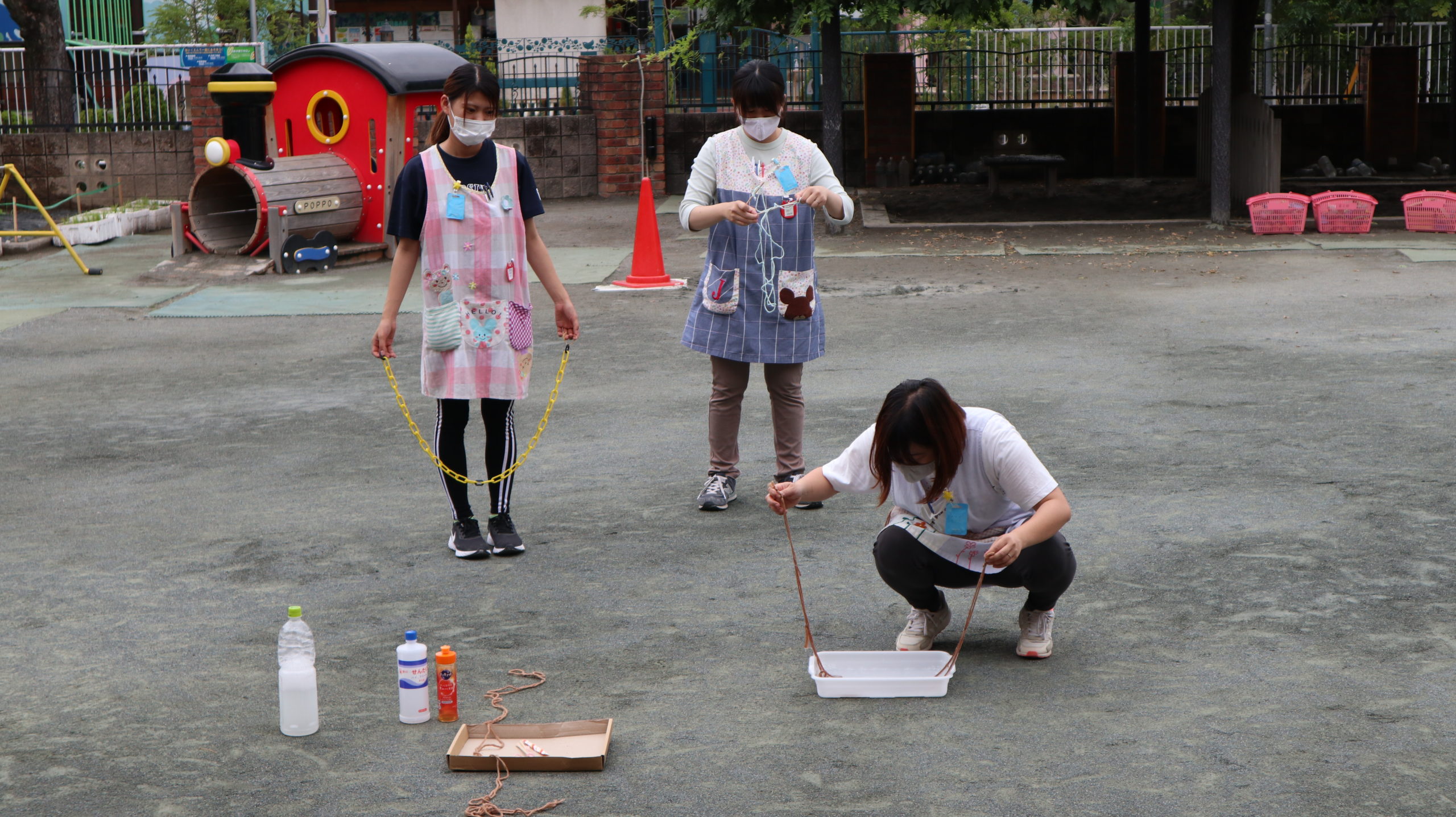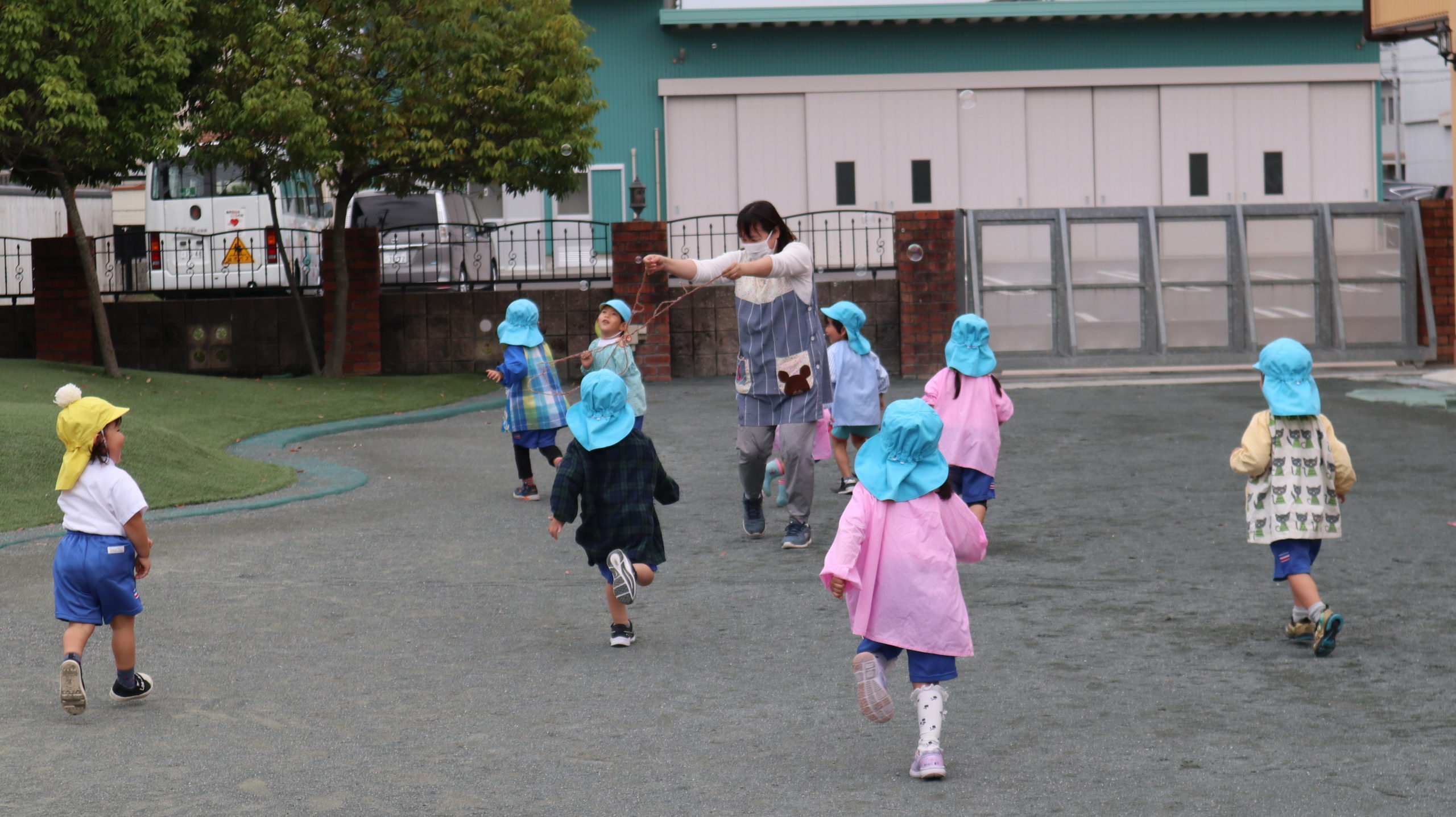 みどり先生が黄色い鎖を持って走ると、小さなしゃぼんだまでいっぱい!