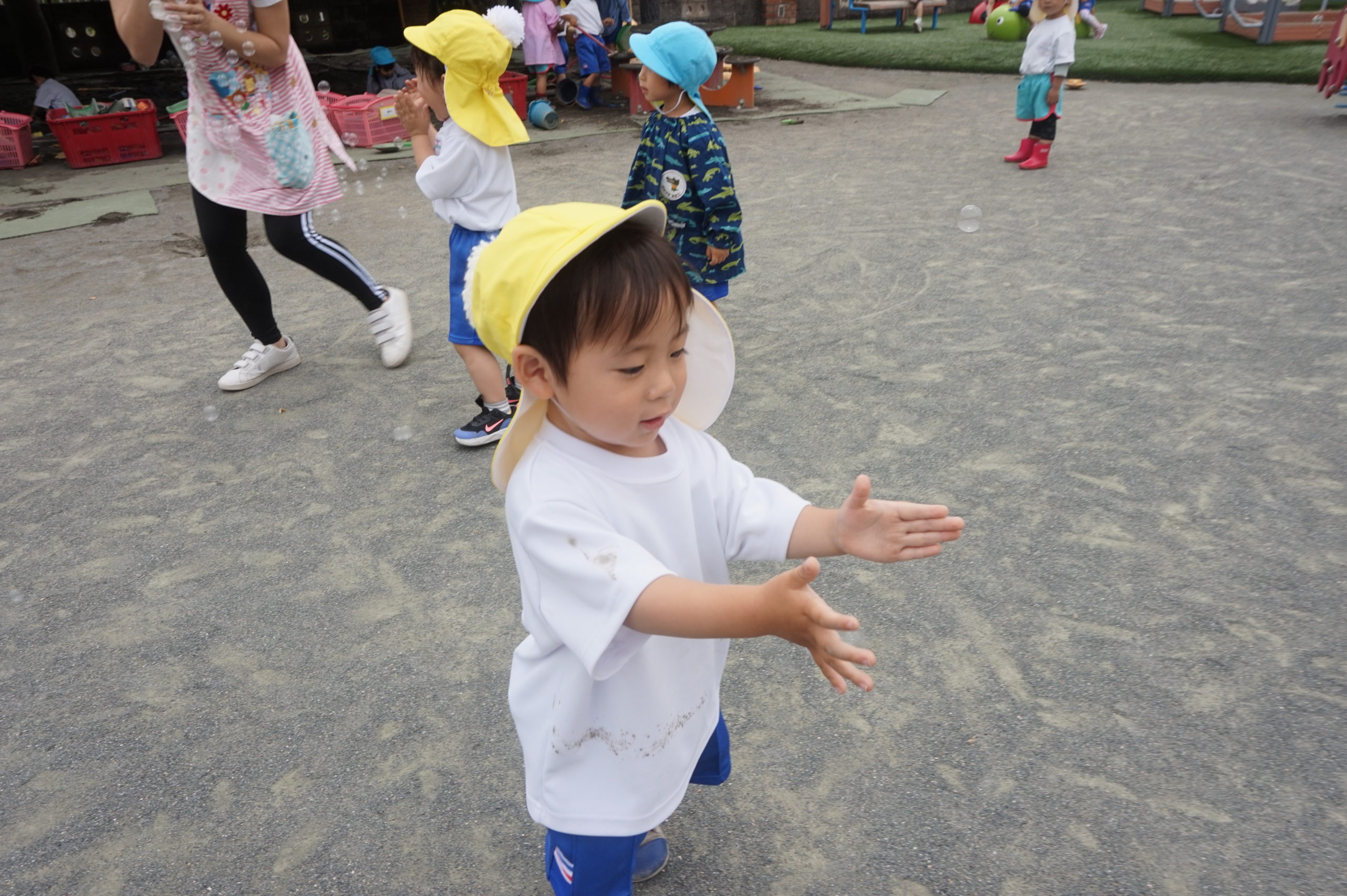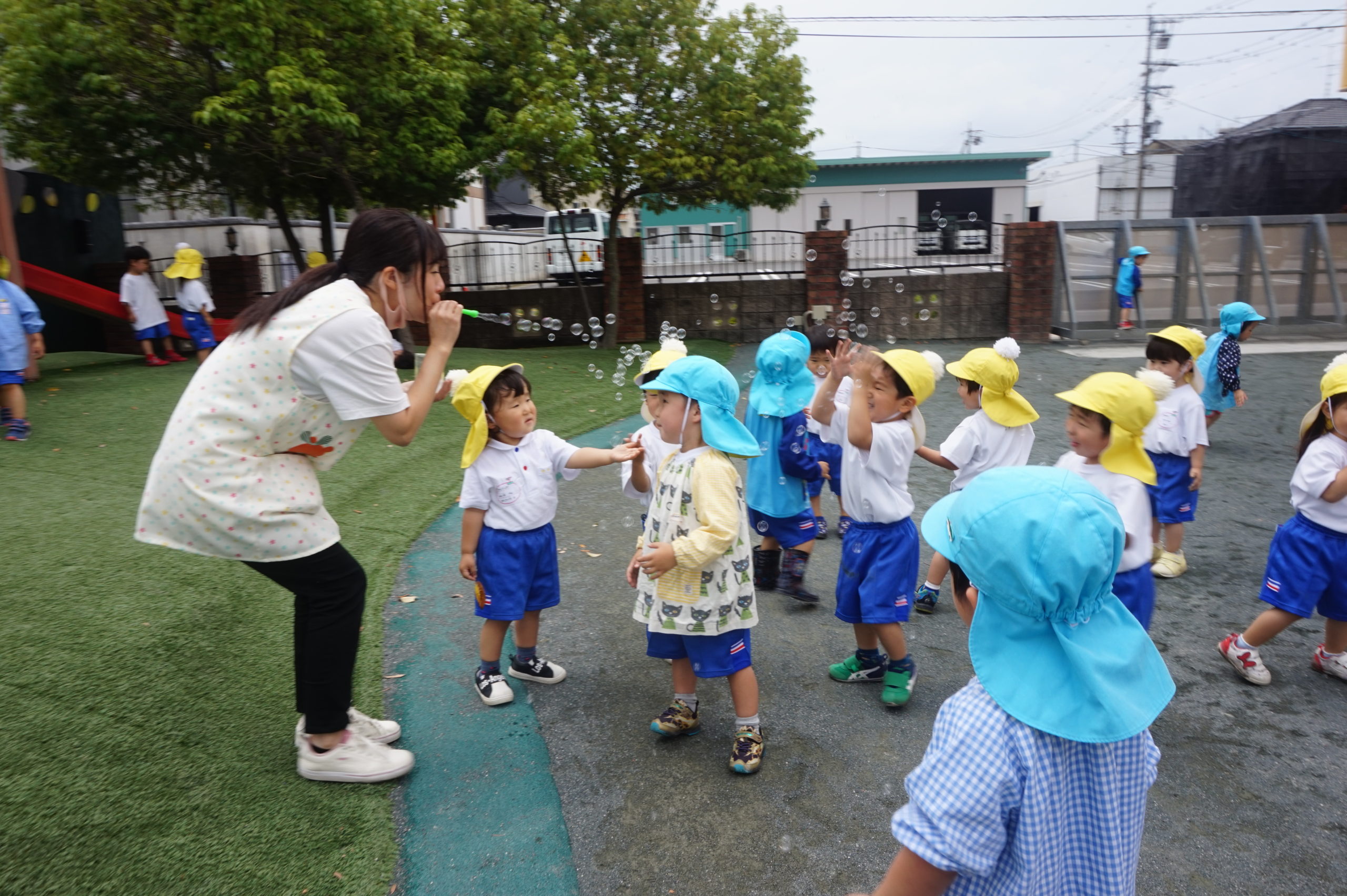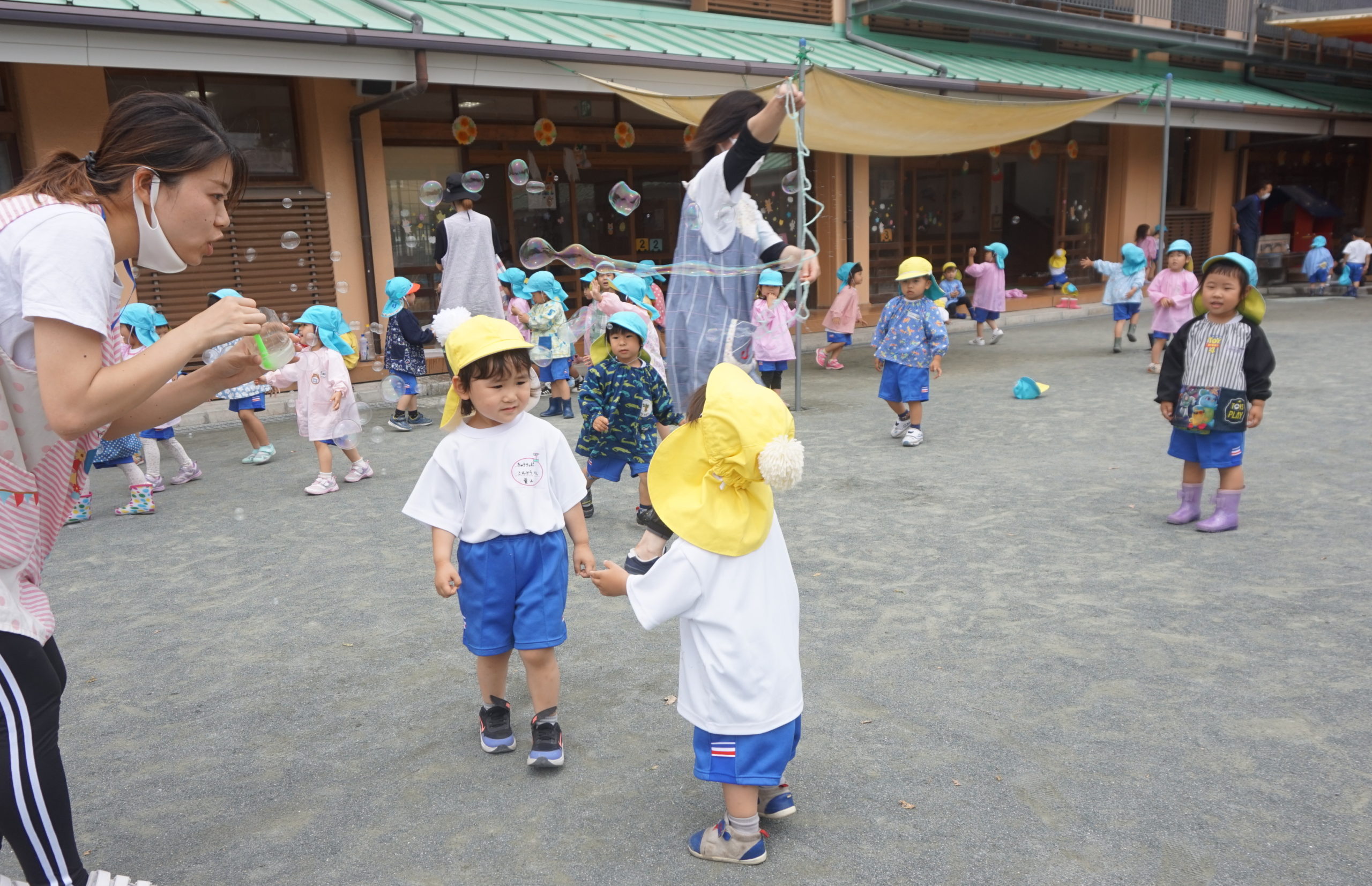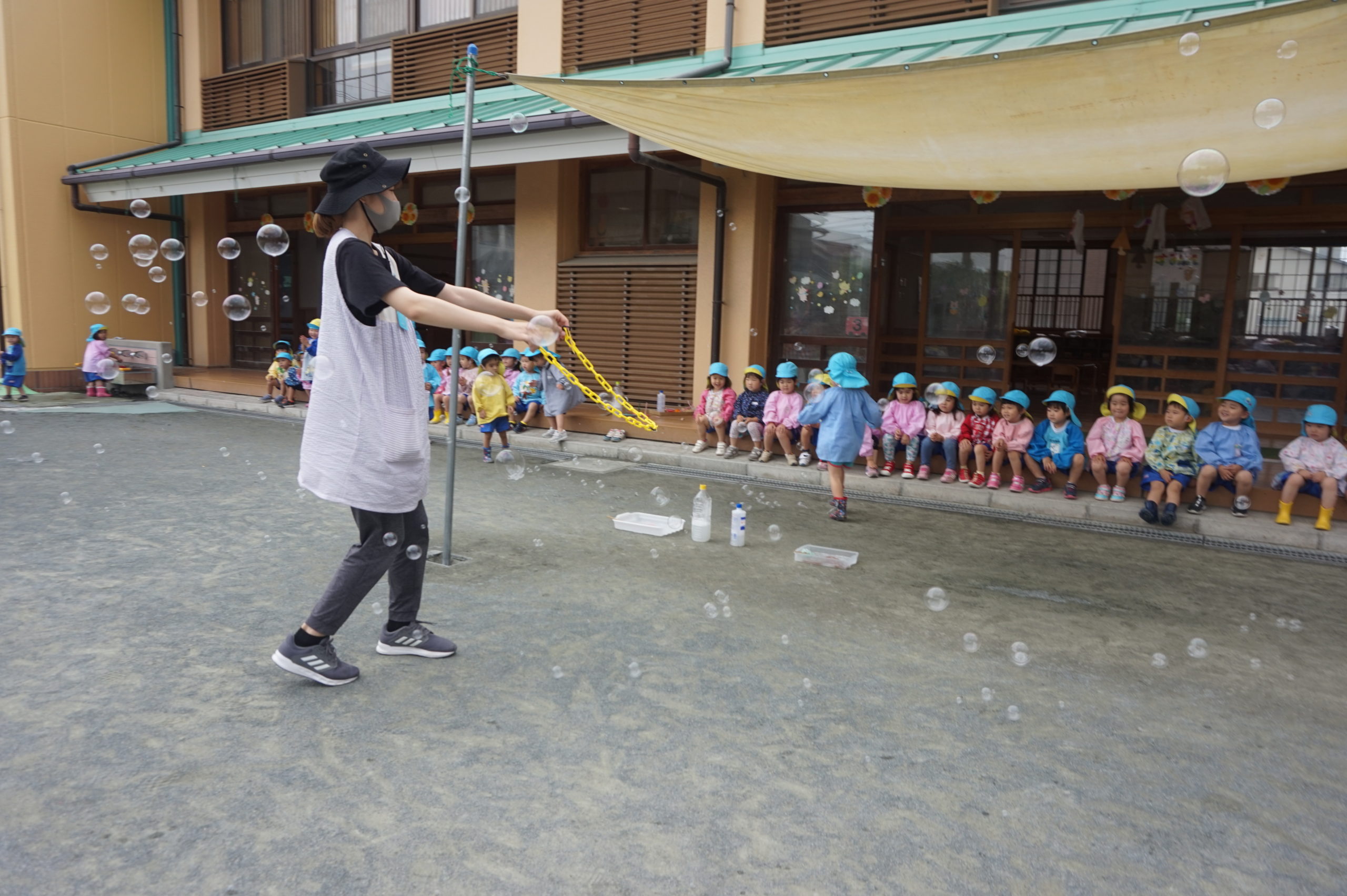 年少組の先生がたくさんしゃぼんだまを飛ばしたよ!
