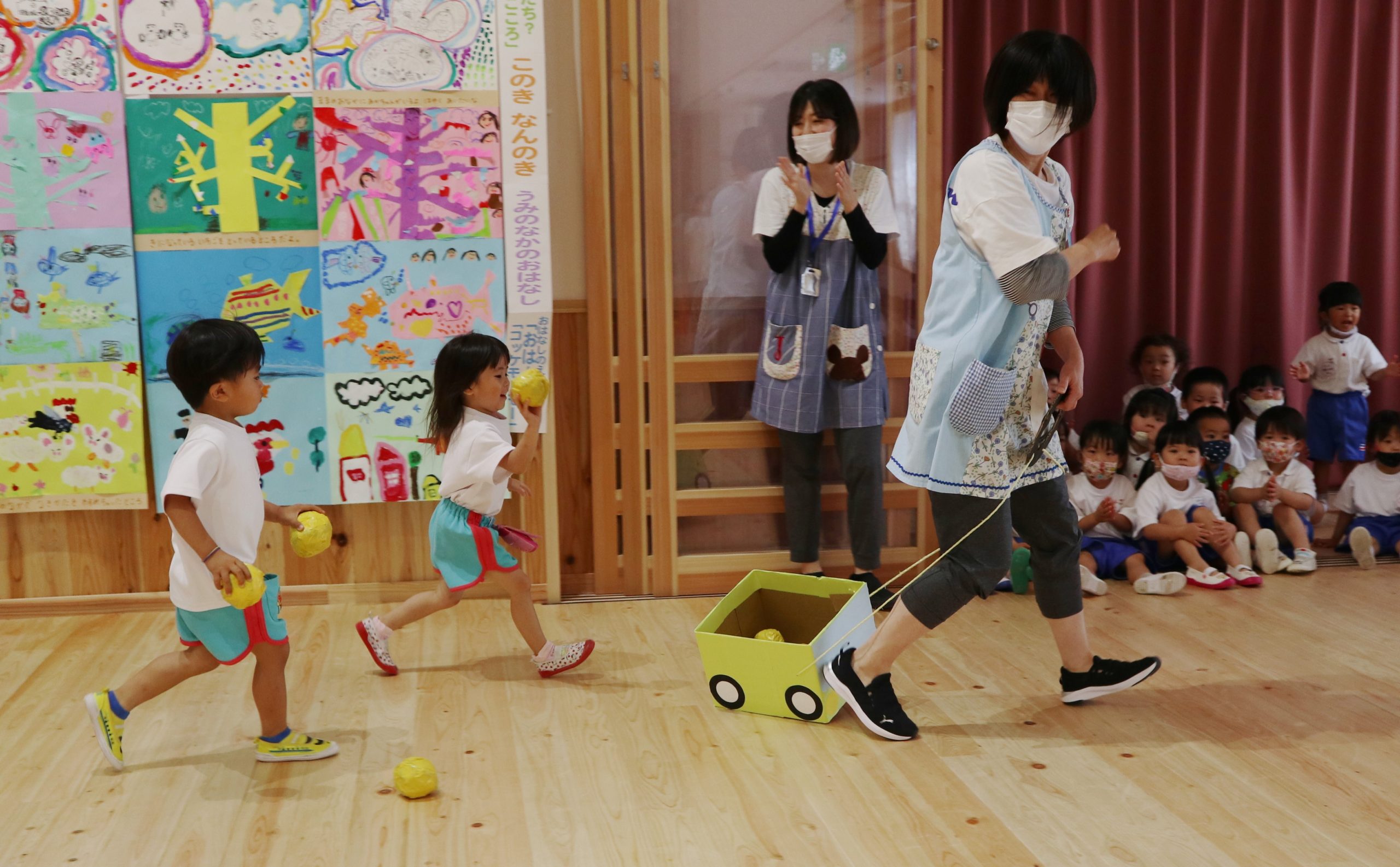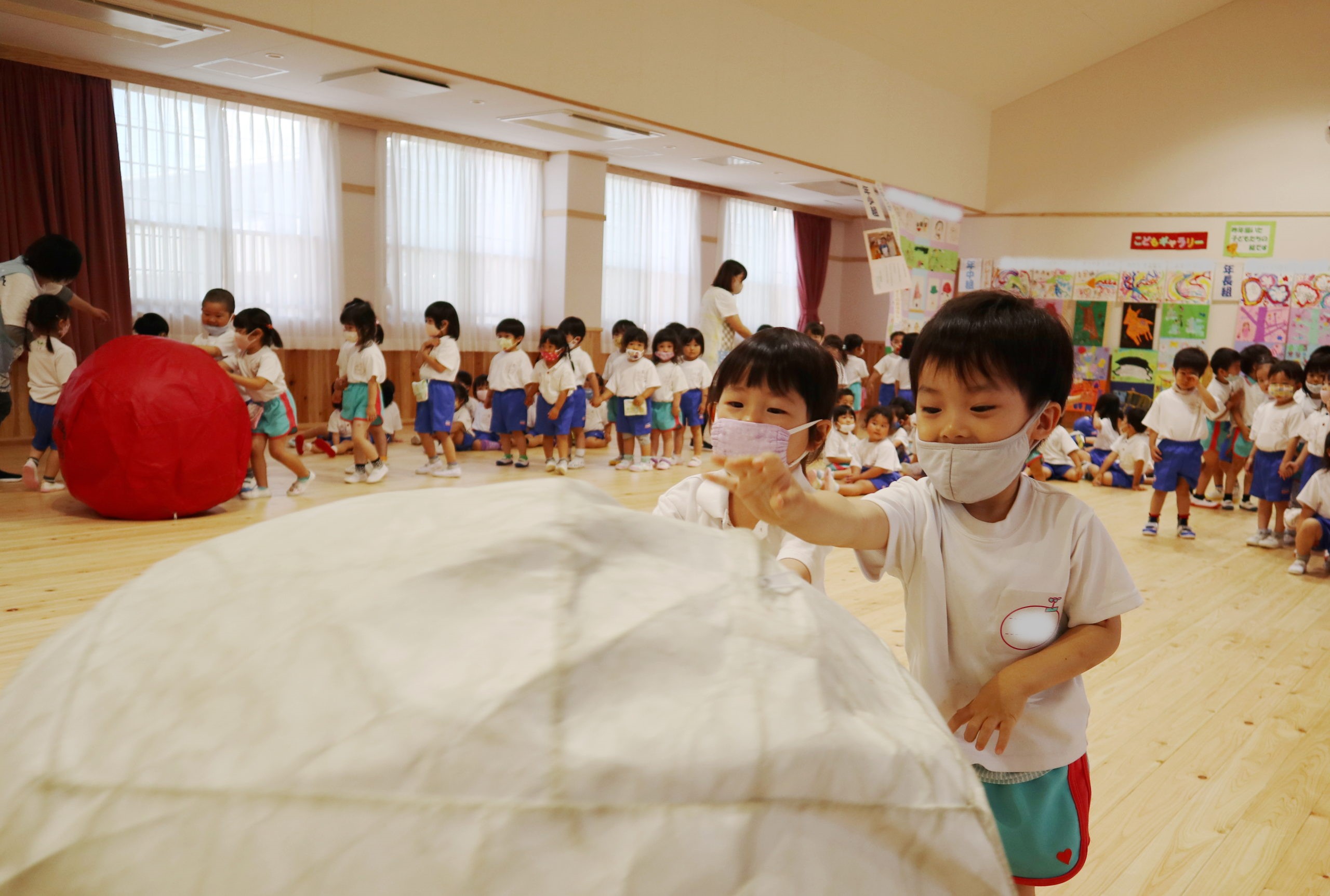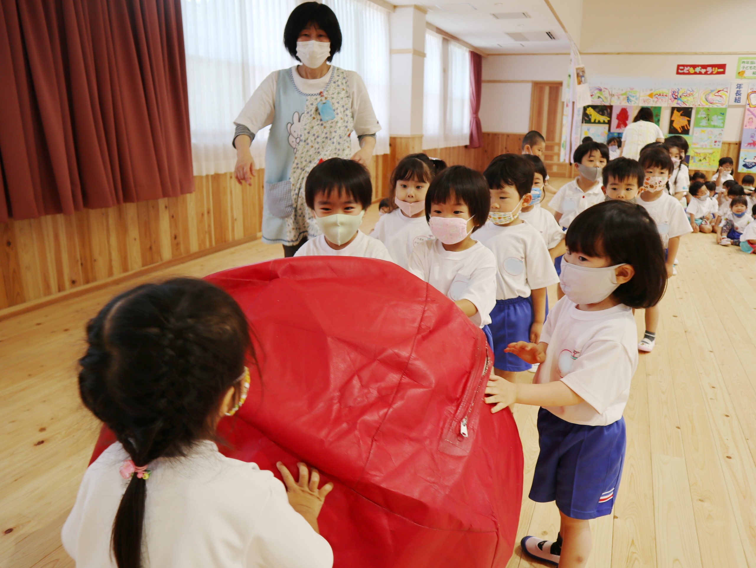 「まだまだいっぱい入っているね!」先生たちがたまを数える様子を見守るおともだち。