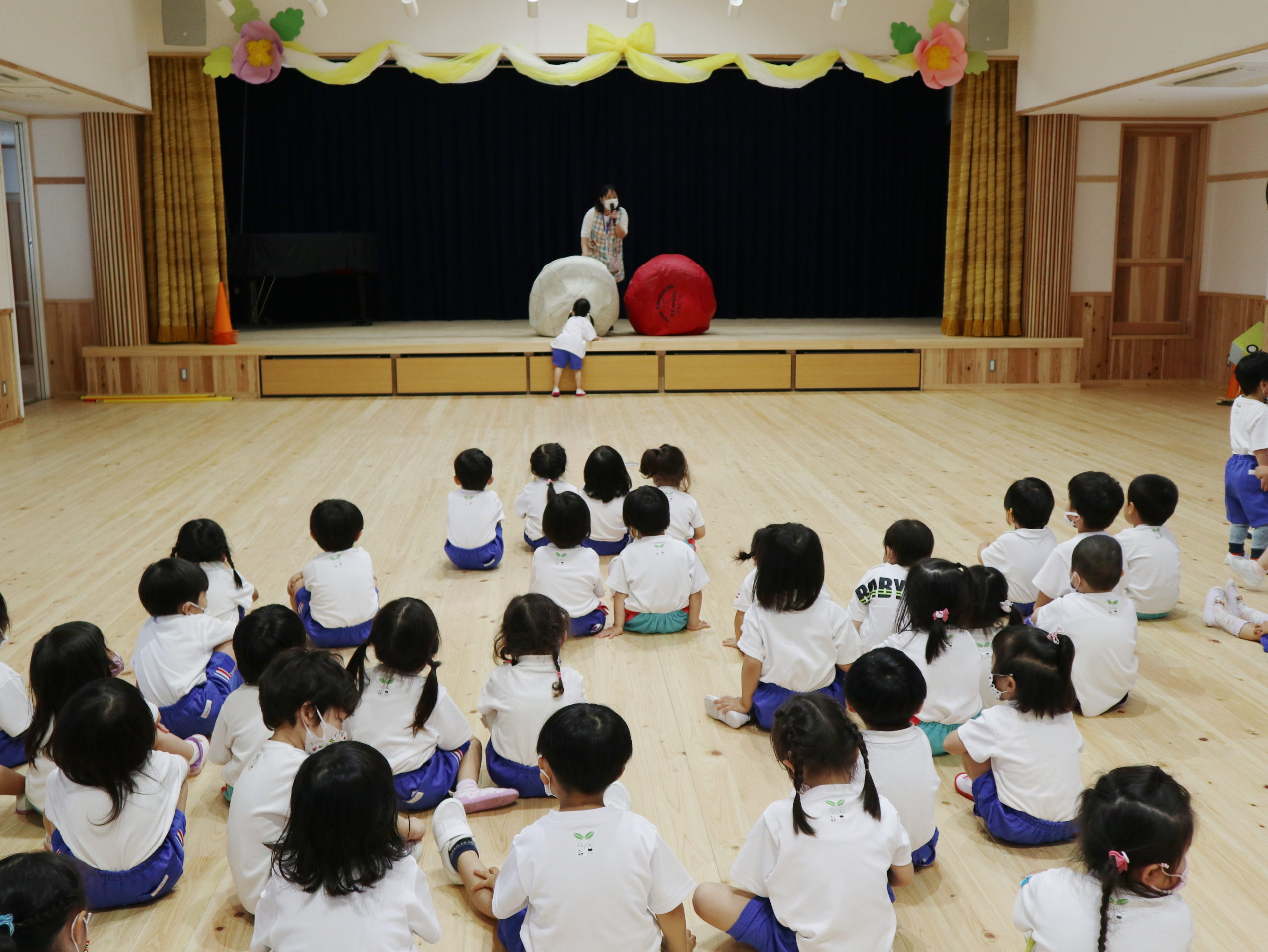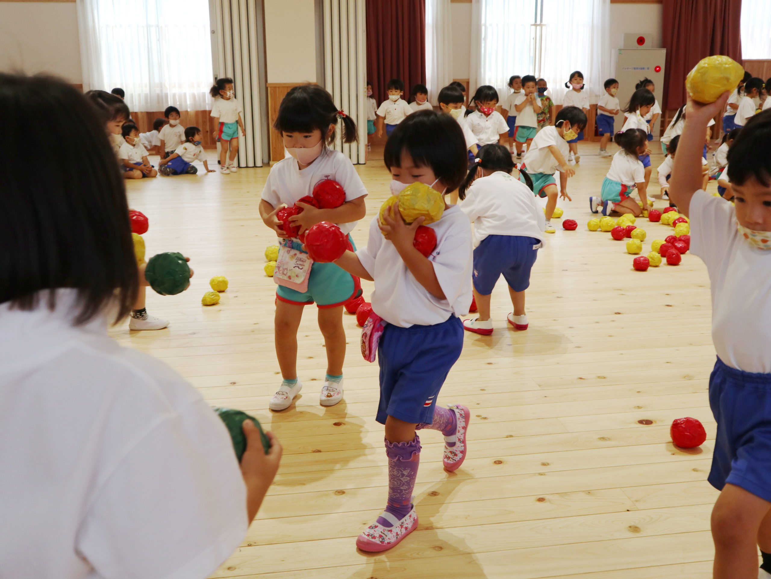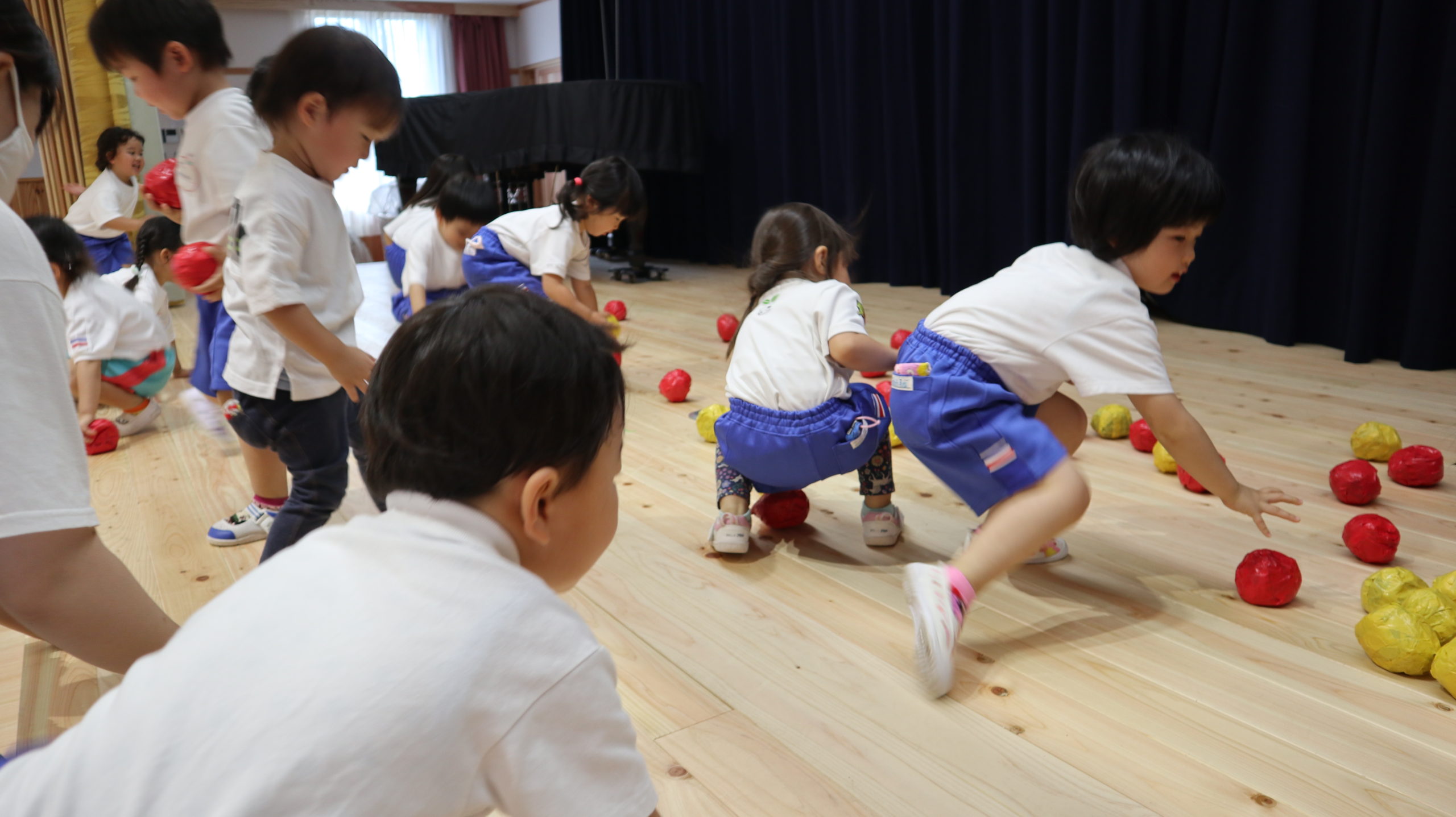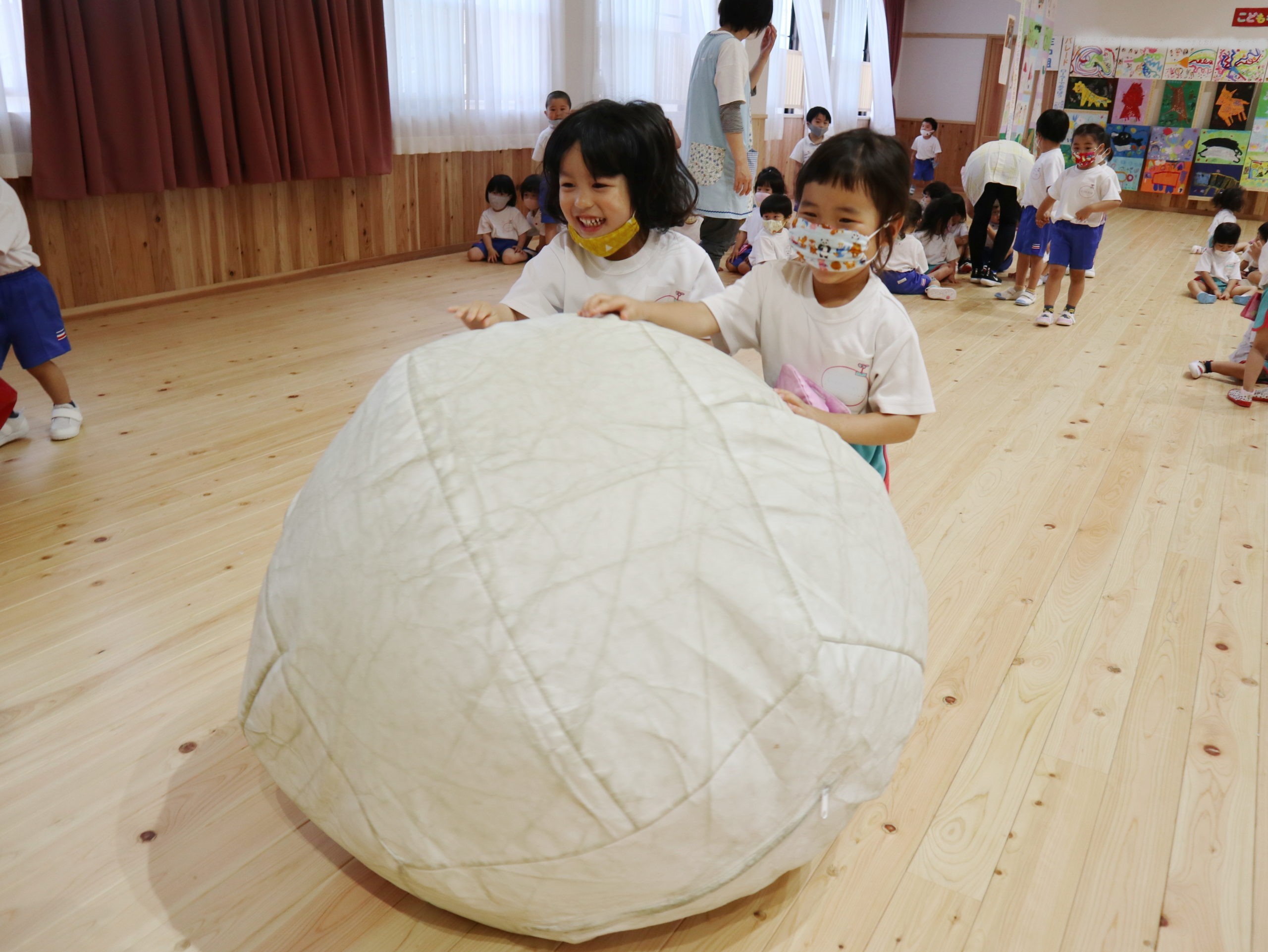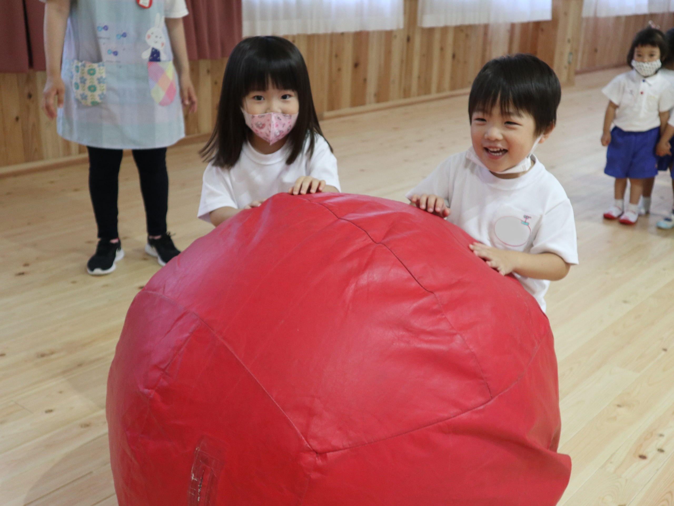 ようこ先生が紅白の大きな玉を「よいしょ よいしょ!」と転がしてきましたよ!