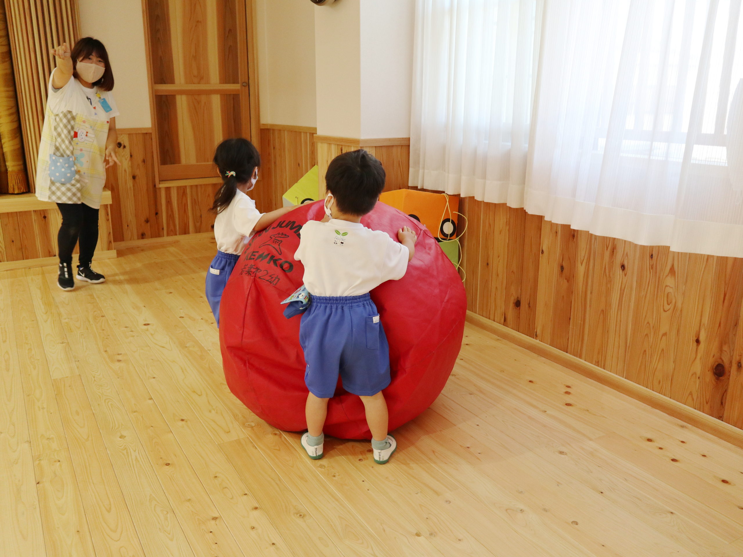「次はね、この大きな玉をおともだちと力を合わせて転がすよ!」とお話すると・・・