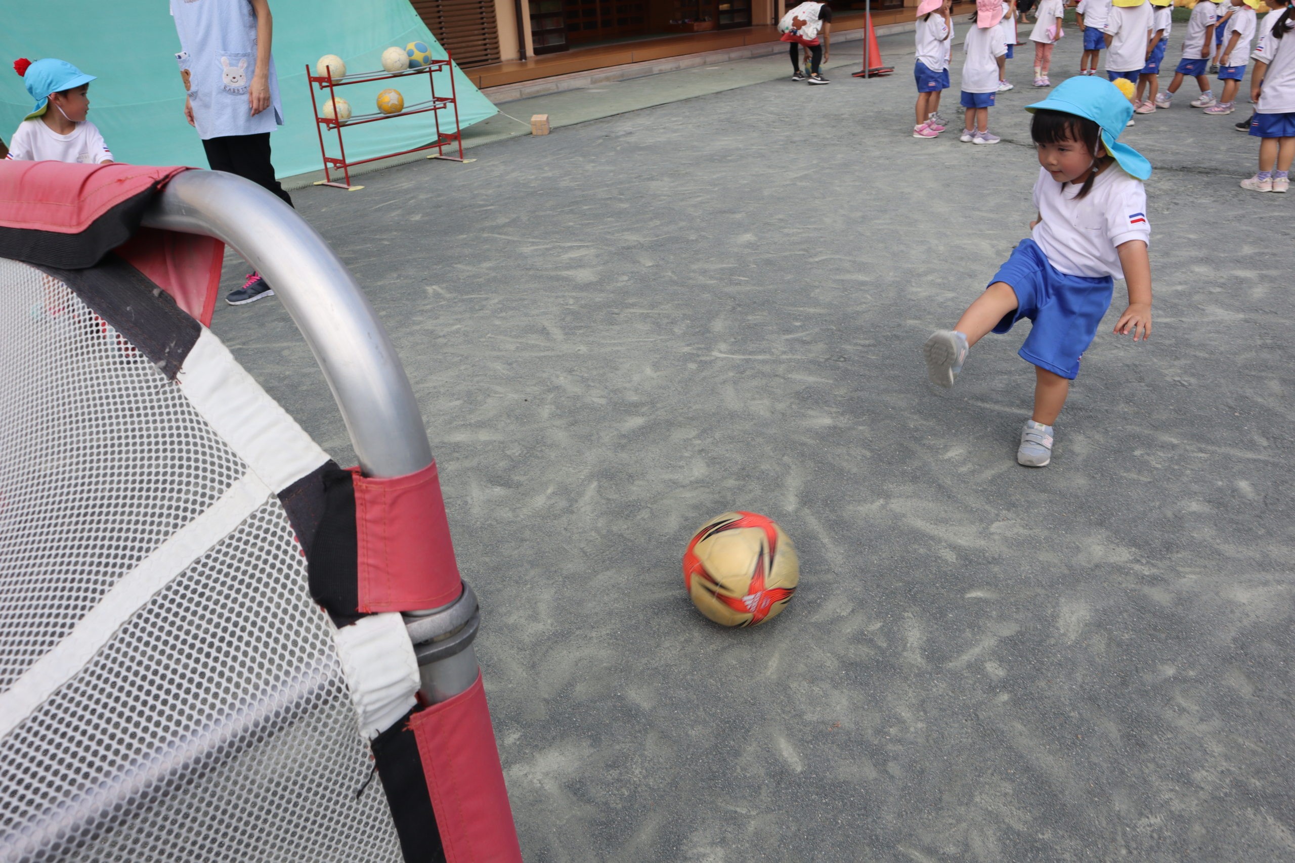 えい!と思いっきりボールを蹴ってゴール!ボールのお片付けもしてくれました。できることがふえてうれしいね!