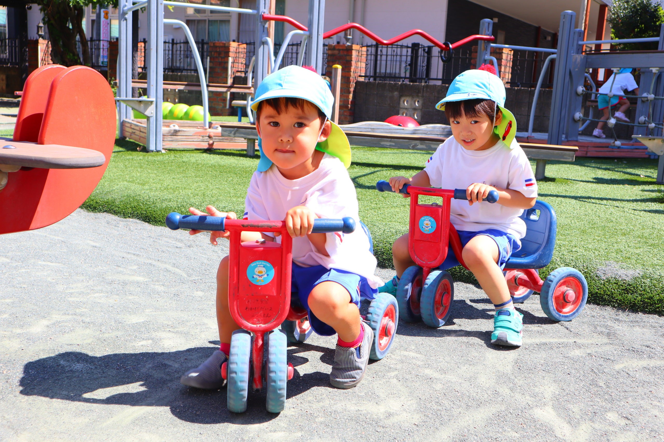 足が届かないほど大きなスクーターも「ぼくできるよ!」「見ててね。」と上手にのって、興味がひろがっています。