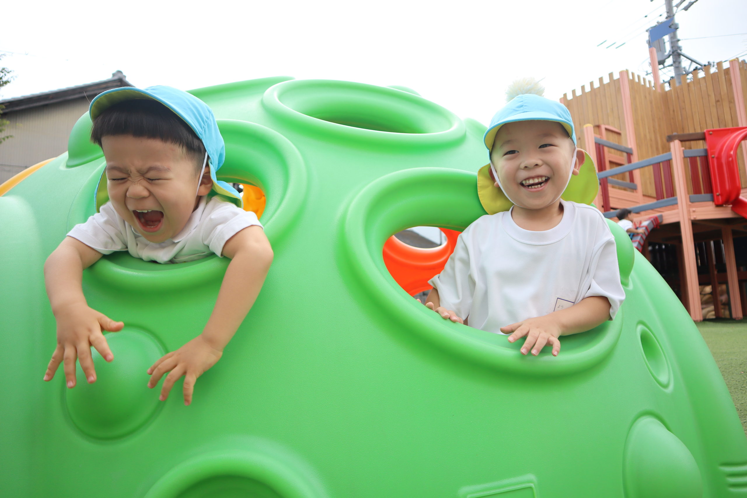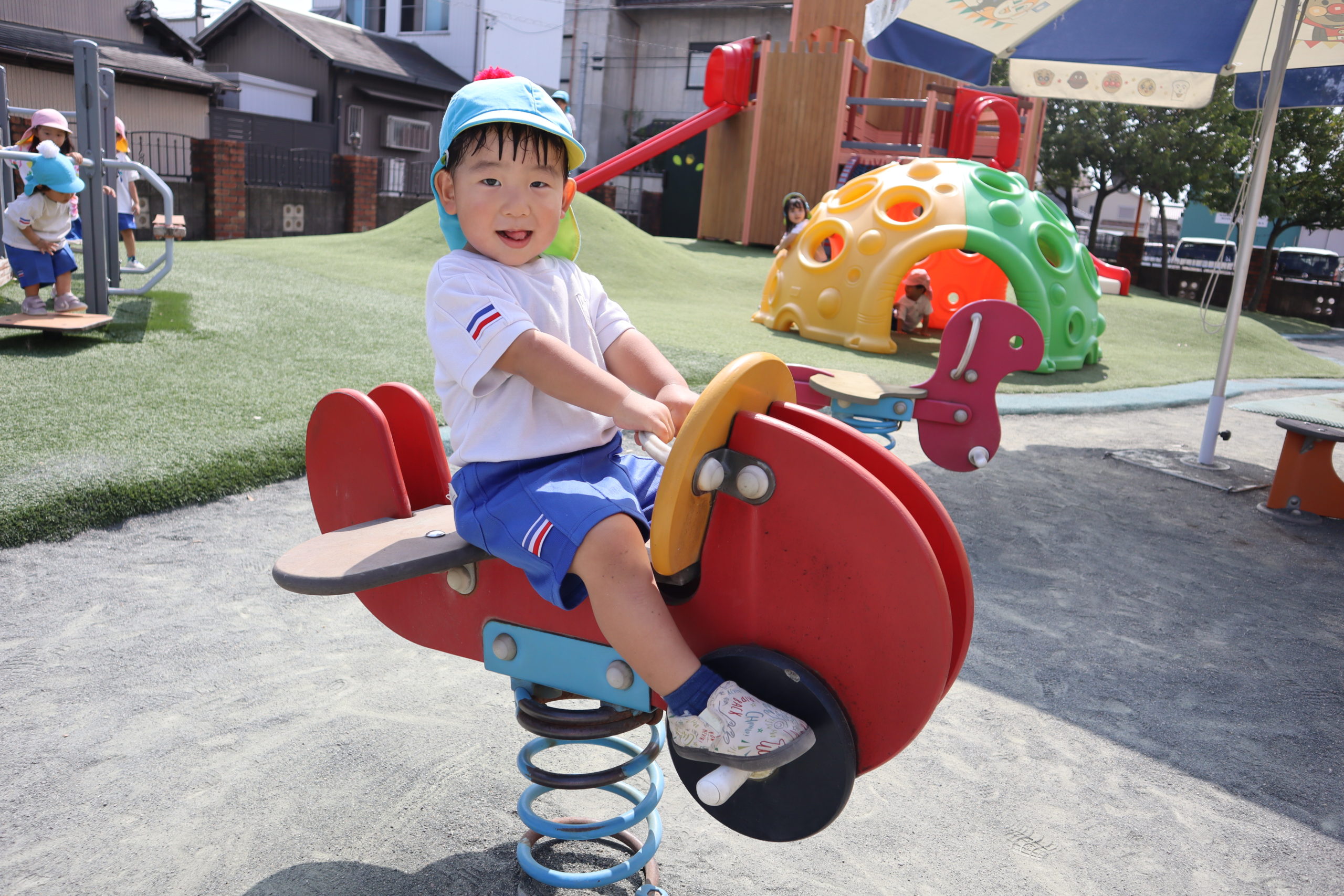 飛行機に乗ってブーン!お空を飛んでる気分でゆらゆら。おともだちとかわりばんこも上手にできるようになったね。