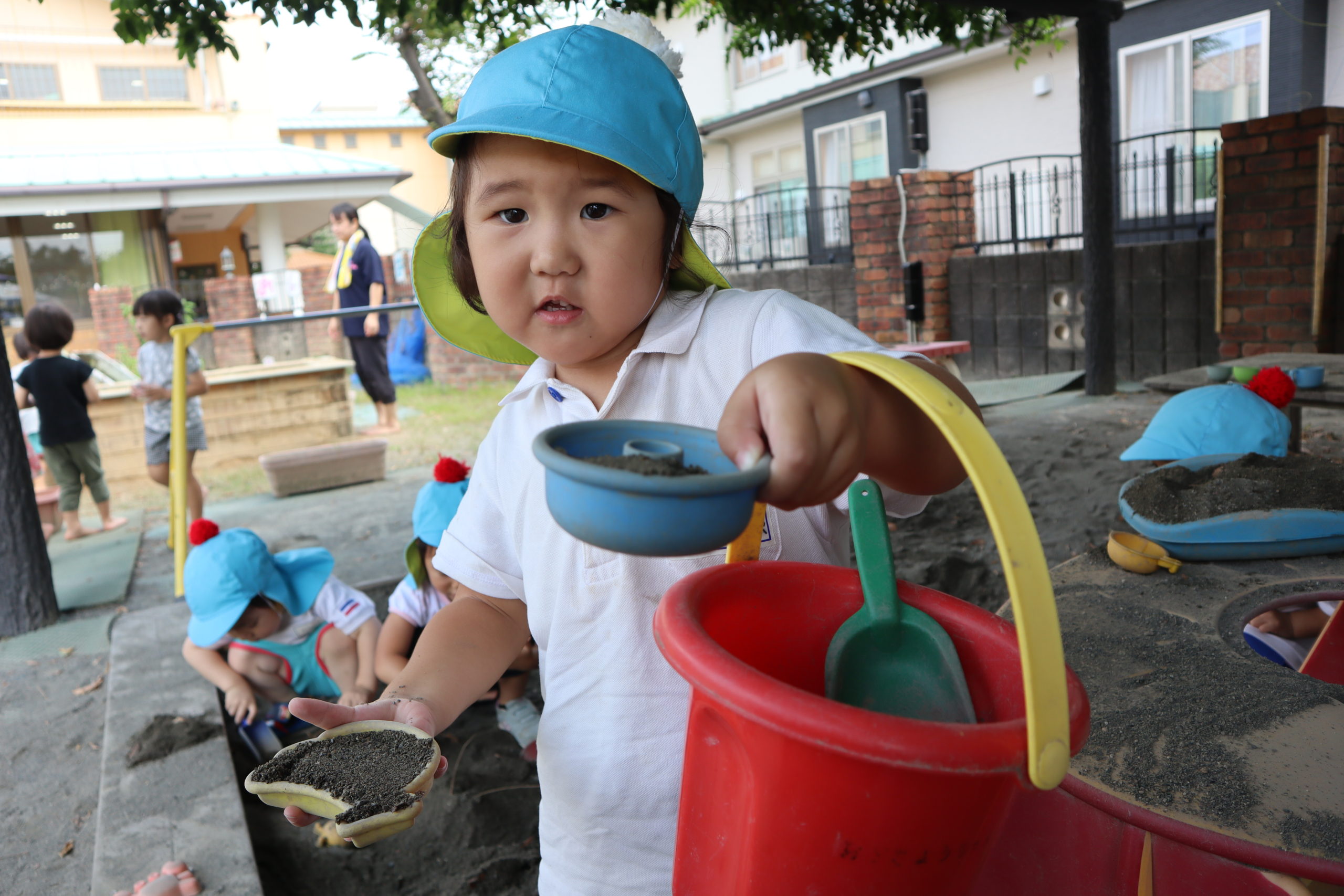 わかば先生と大きなお山づくりに挑戦。トントンと固めたり、葉っぱをトッピングしたりしたよ。お砂場は一番人気!