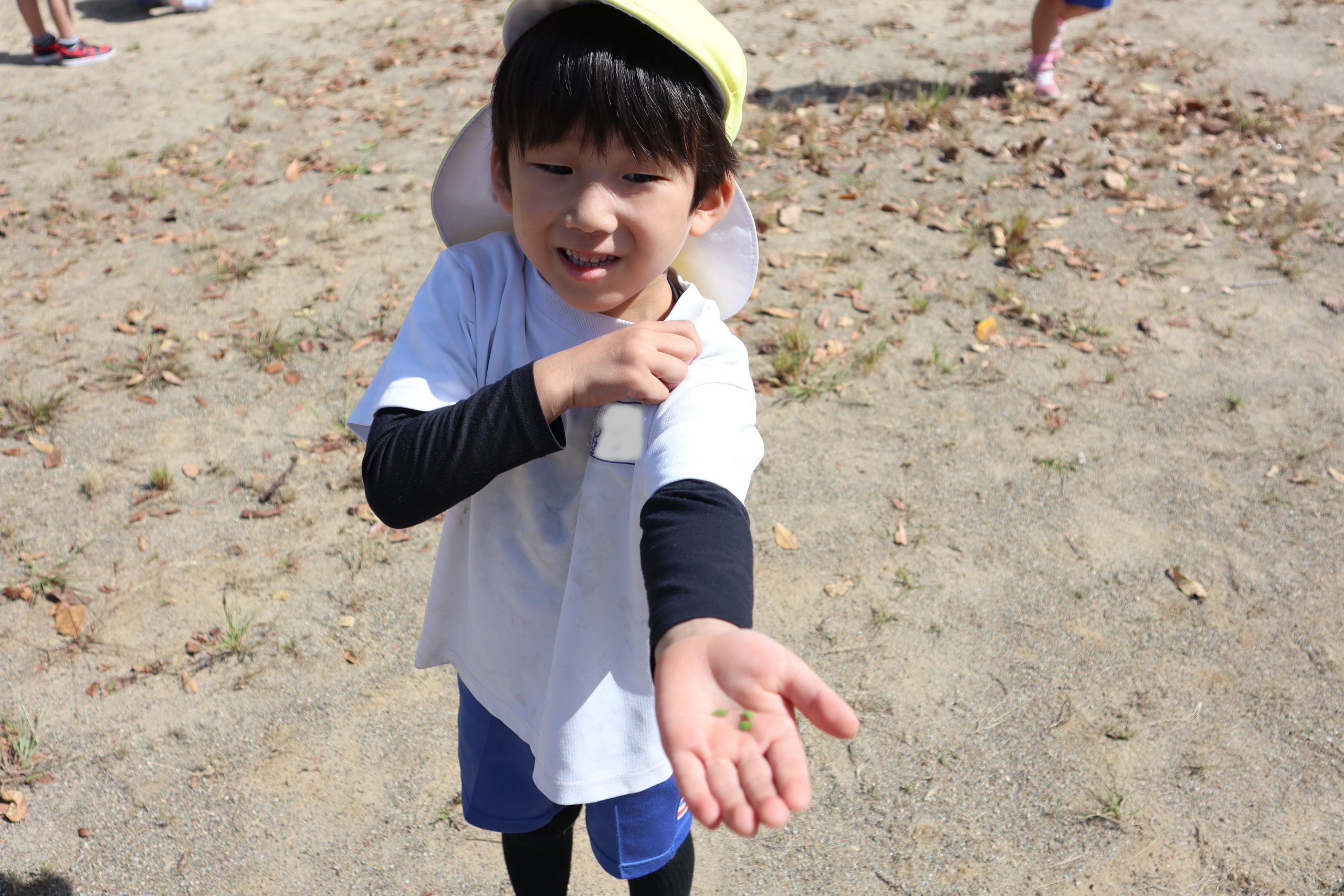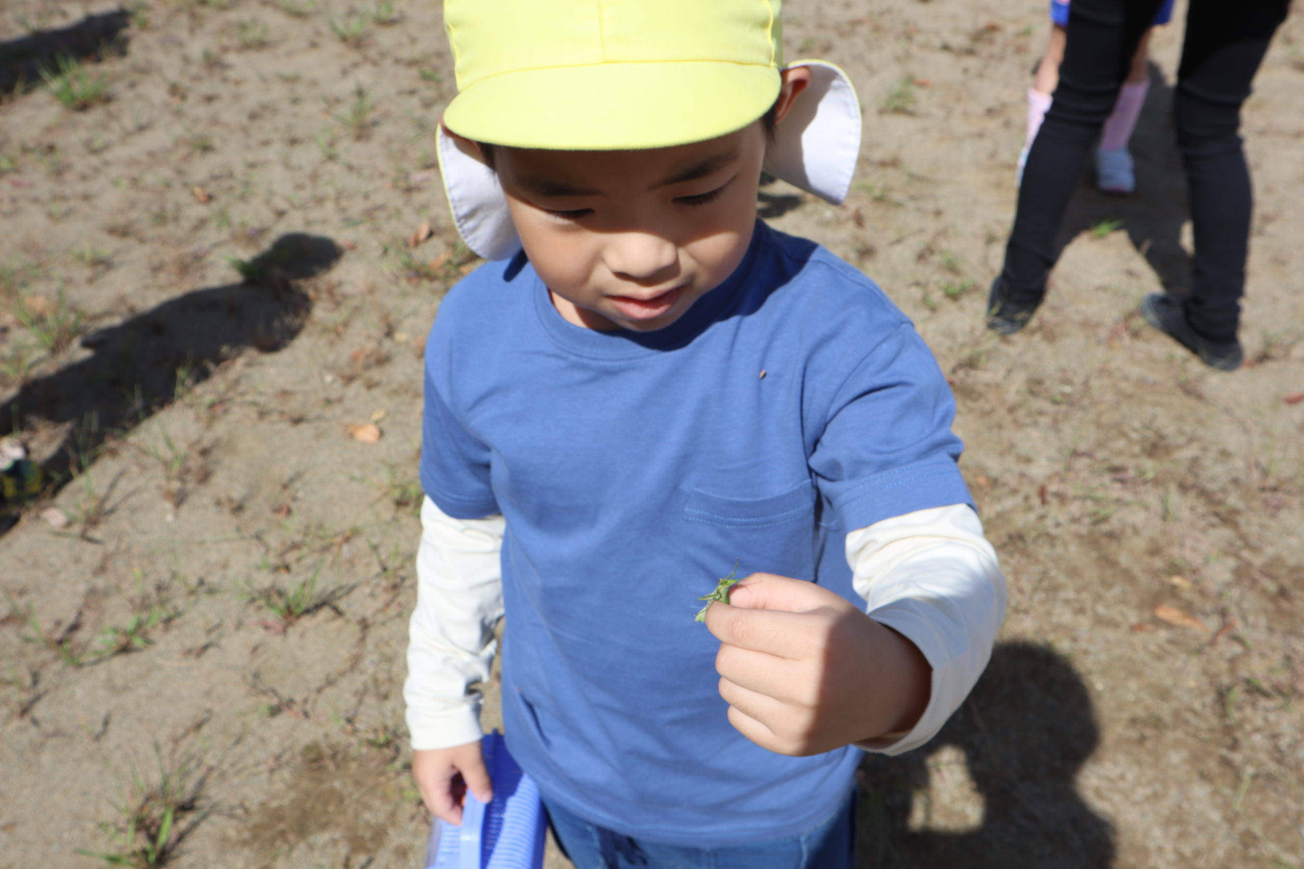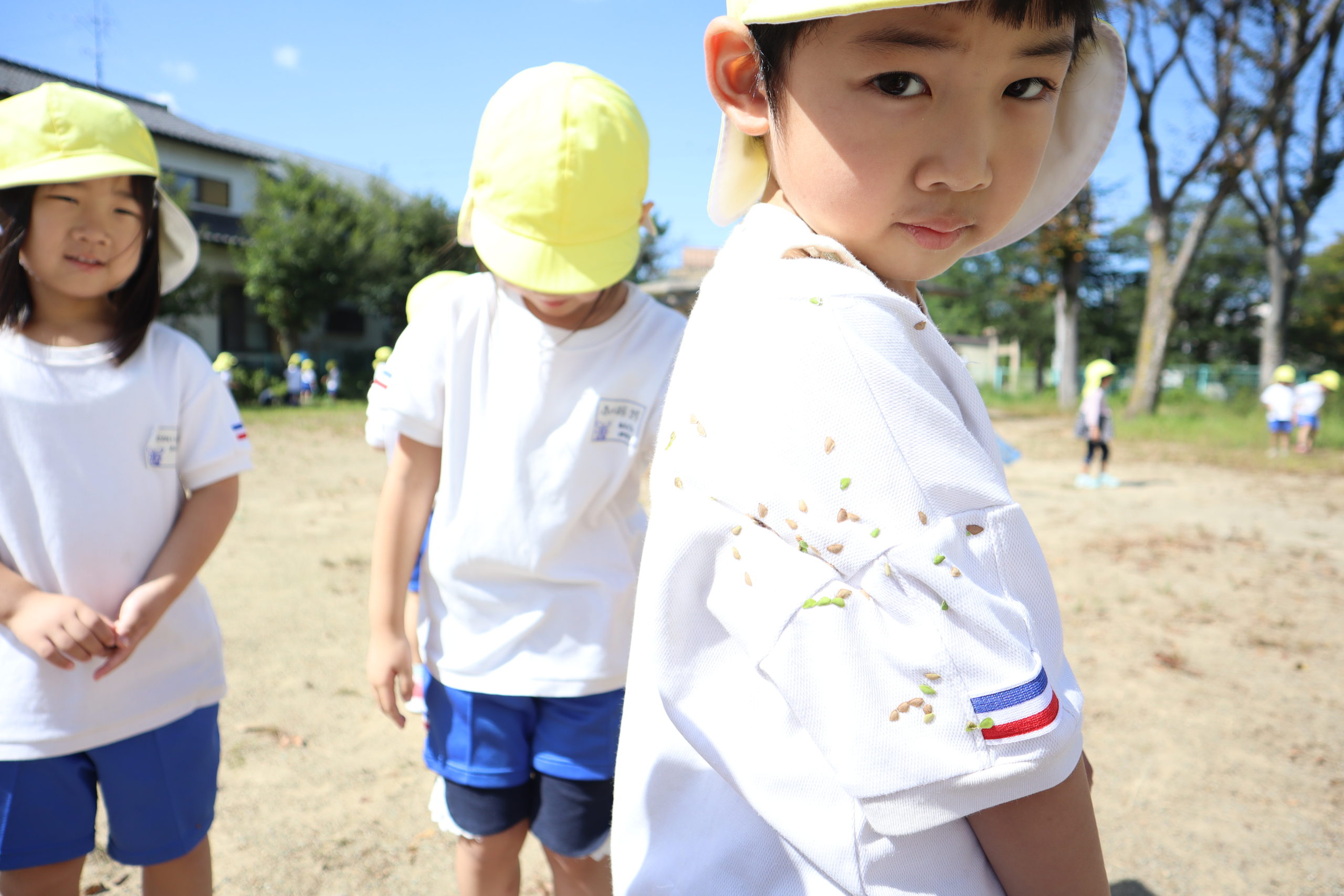 ぼくのもとってー!服についたひっつきむしを友達に取ってもらったよ。