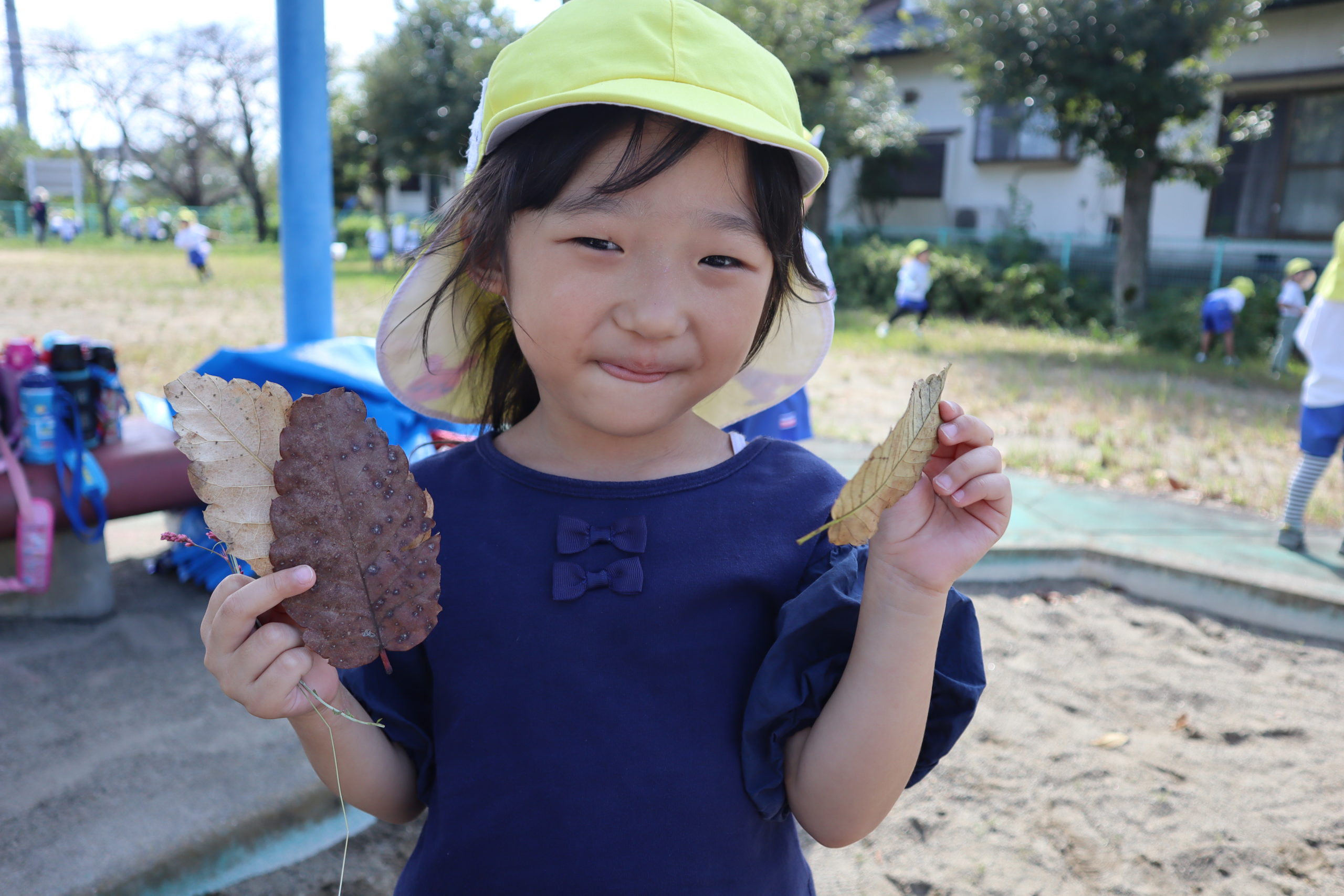 葉っぱひろったよ。緑の葉っぱが黄色や茶色に変身したんだね。秋みつけたね。