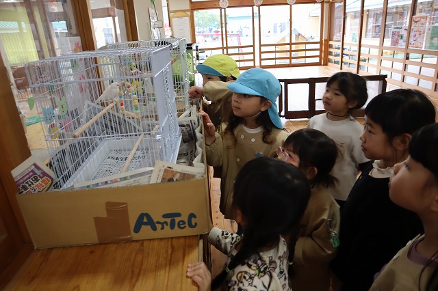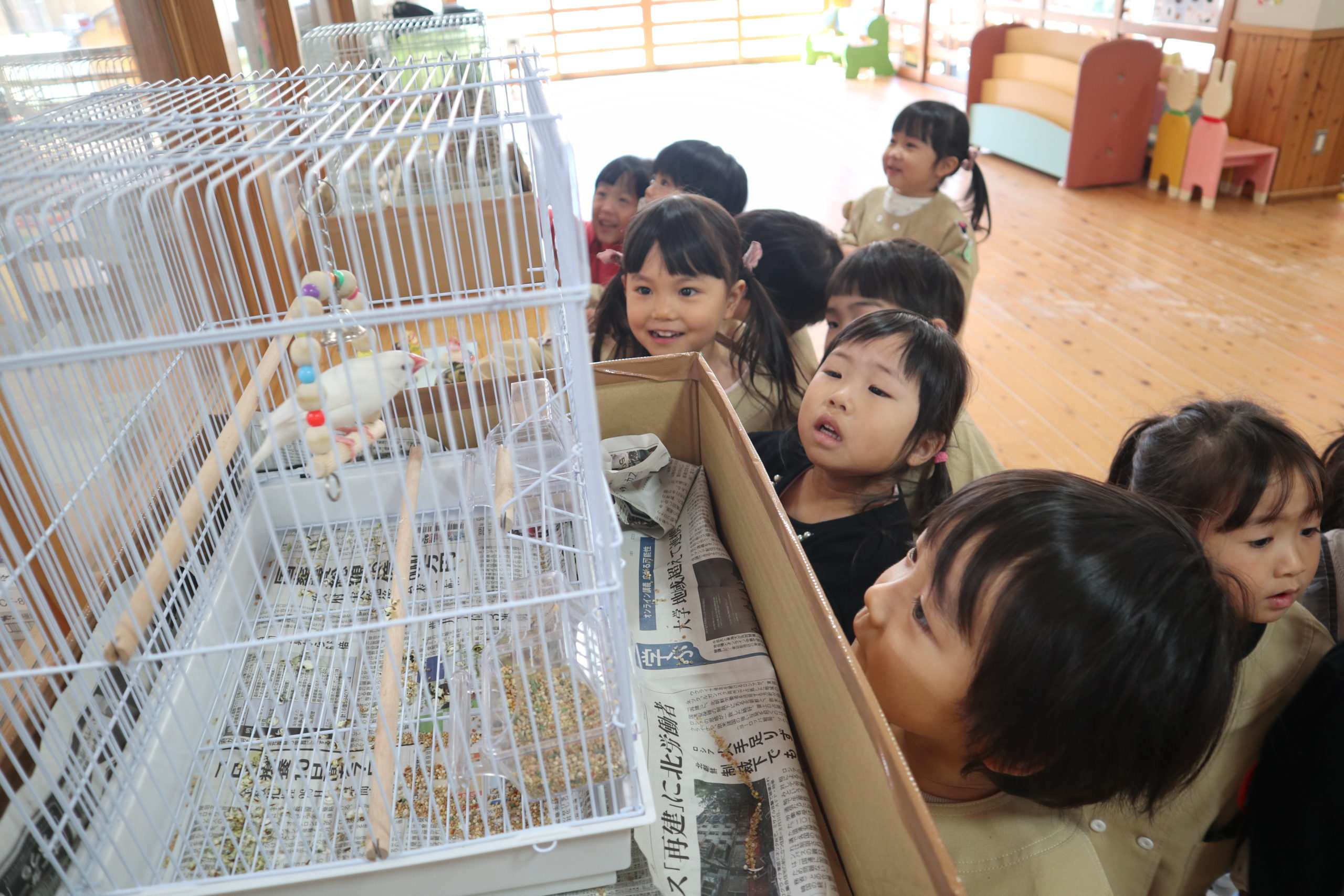 朝、外遊びから戻ってきたこどもたちも白い文鳥さんを一目見ようと集まってきました。