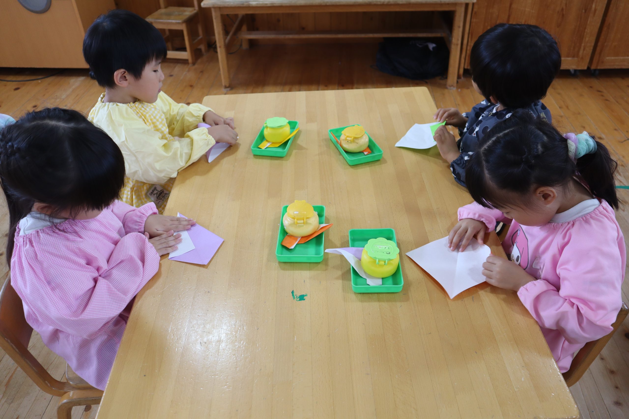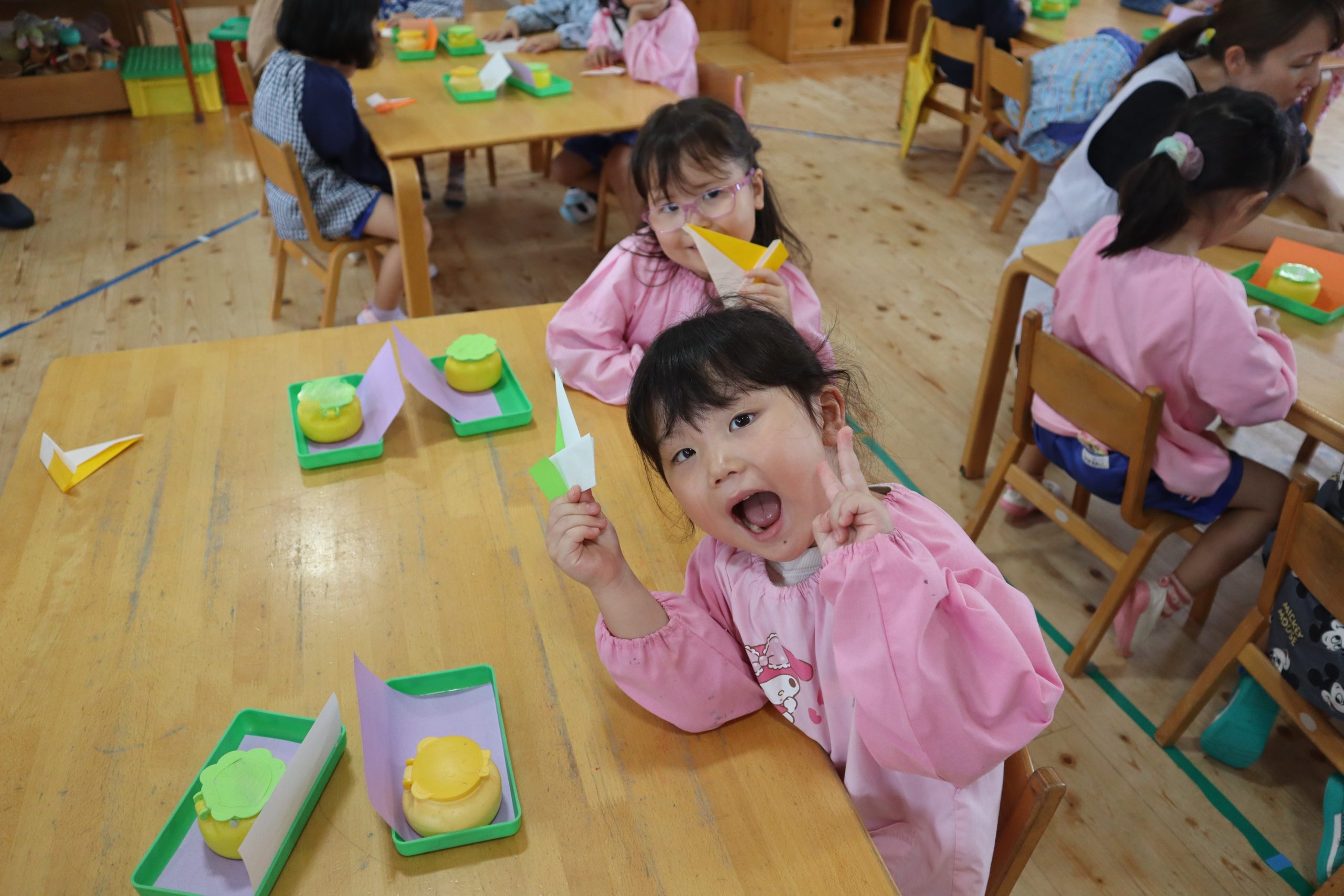 みほ先生が「前に貼ってあるヨットをよく見て真似して折れるといいね。」と声をかけると