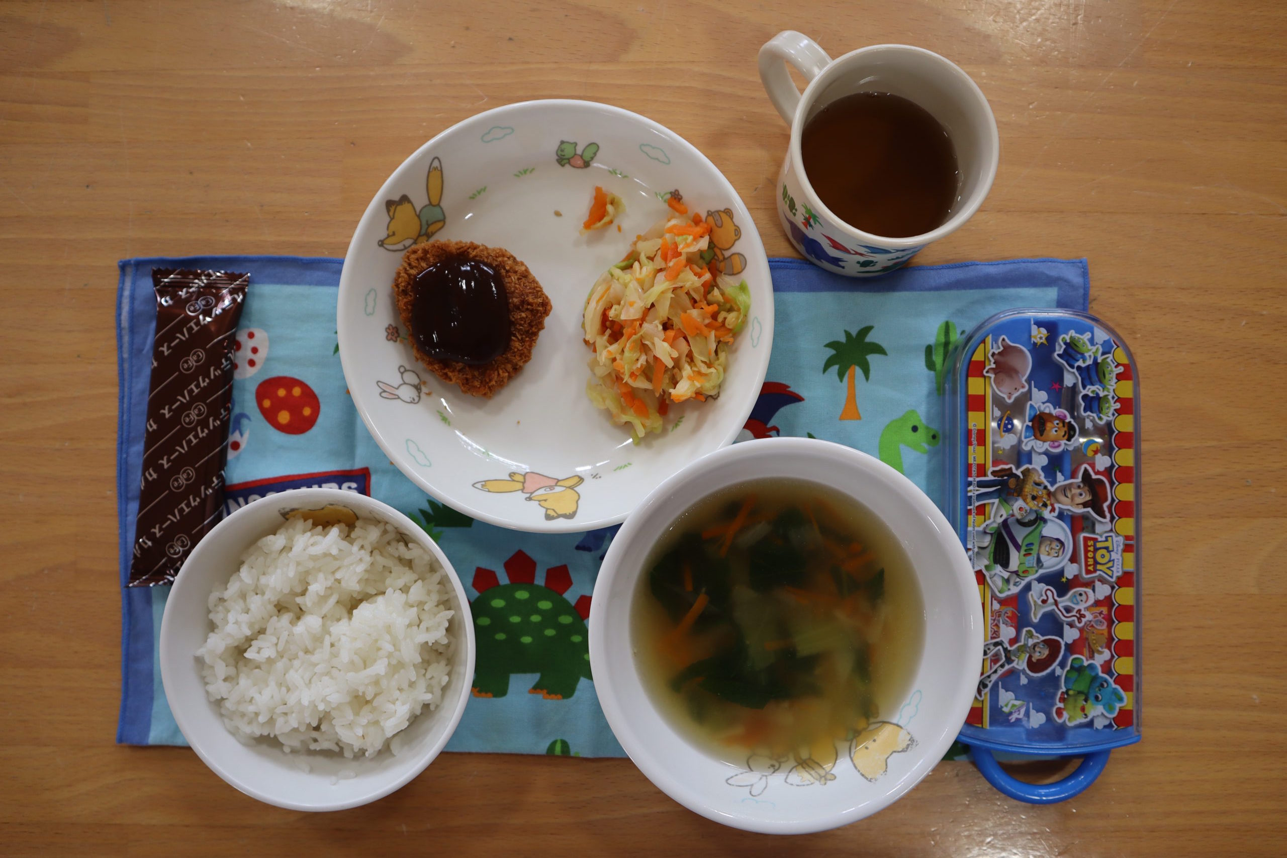 給食の献立は、米麦、みそかつ、おひたし、ちゅうかスープ、カルシウムウエハースです。