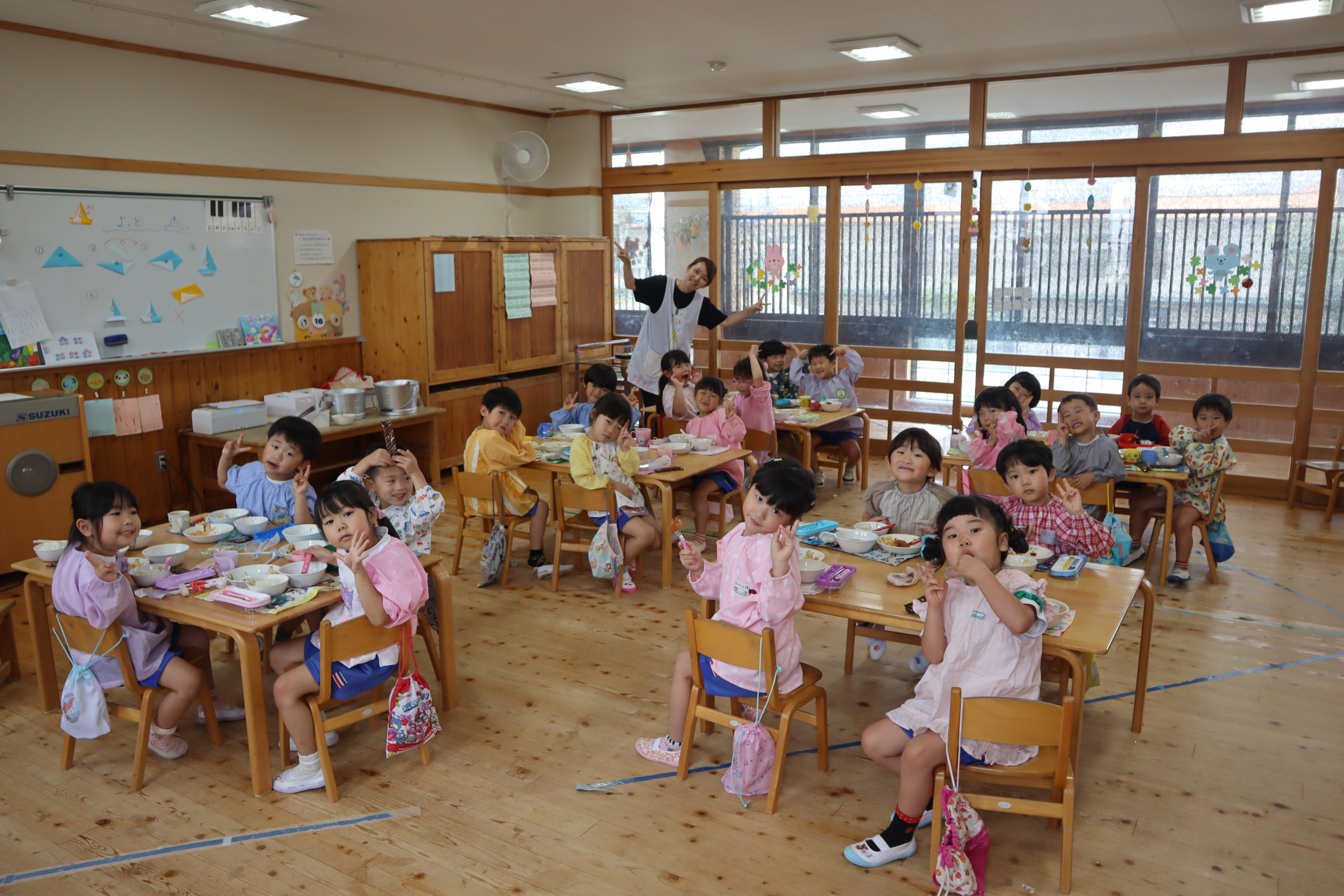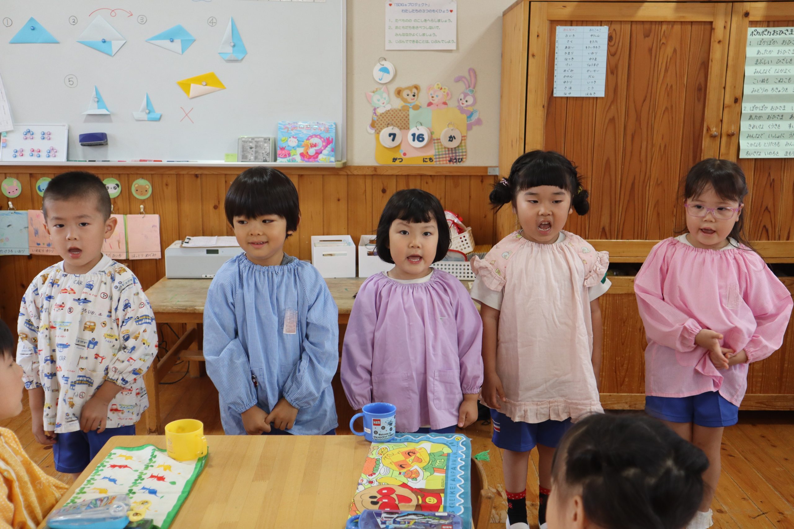 給食の準備が終わると、「おとうばんさんまえでてきてくださいねー。」とみほ先生。