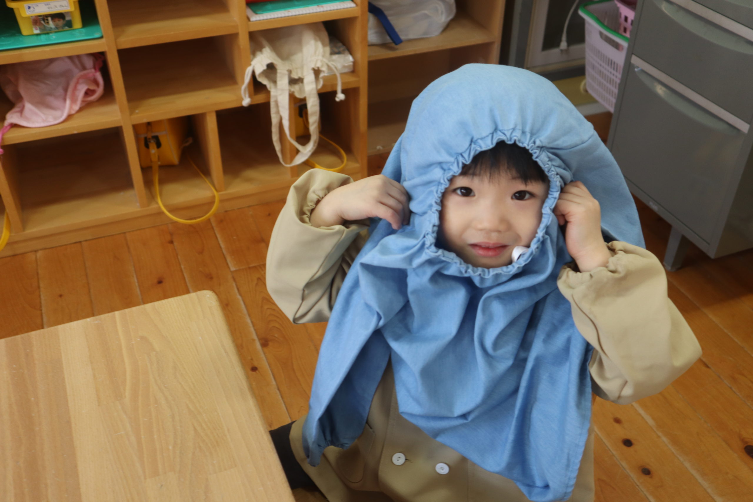 なかなか一人で着ることができなかったエプロンスモックも「できるよ!」といって見せてくれました。