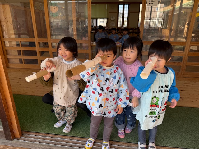 トイレットペーパーの芯を繋げて望遠鏡を作ったお友だちは