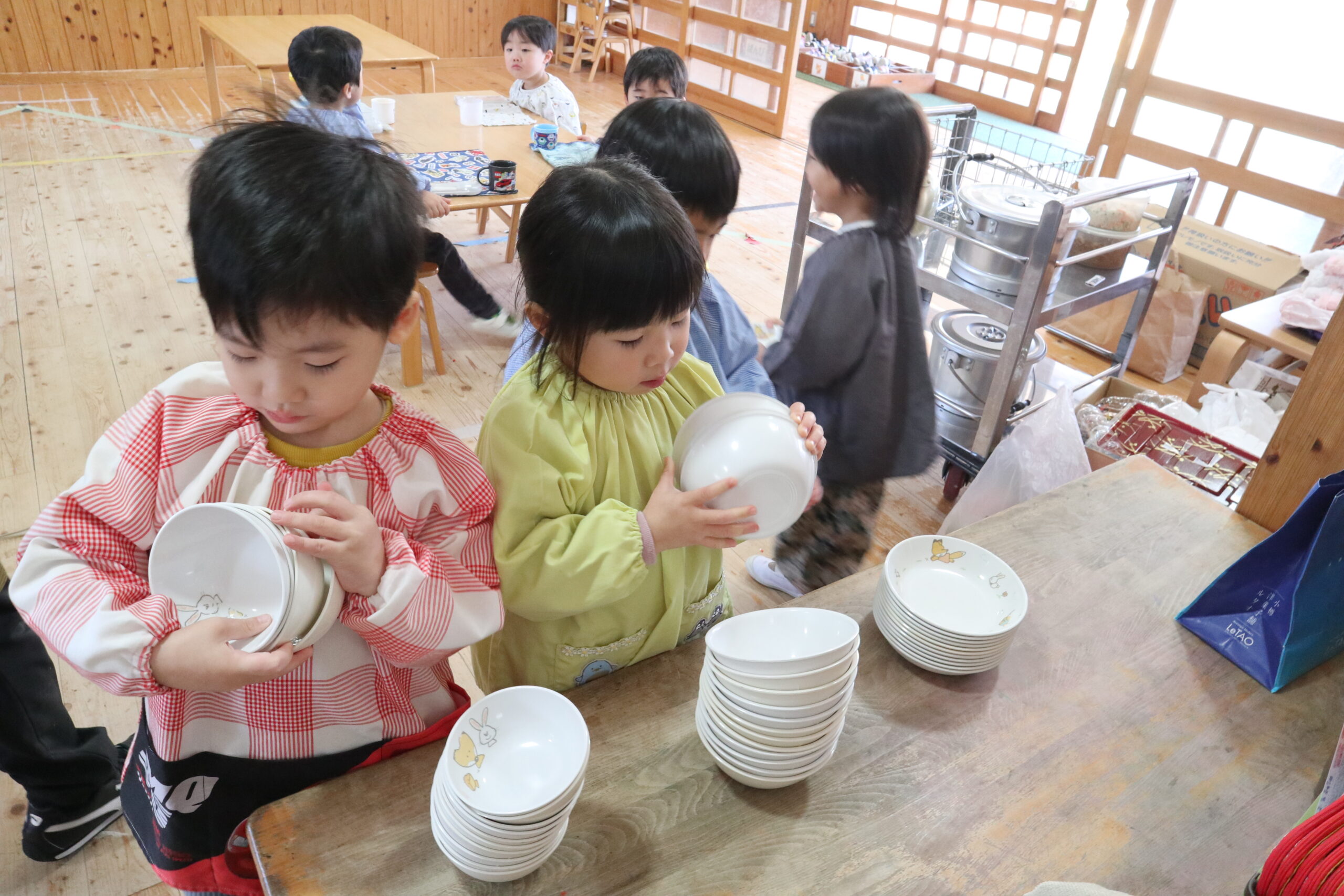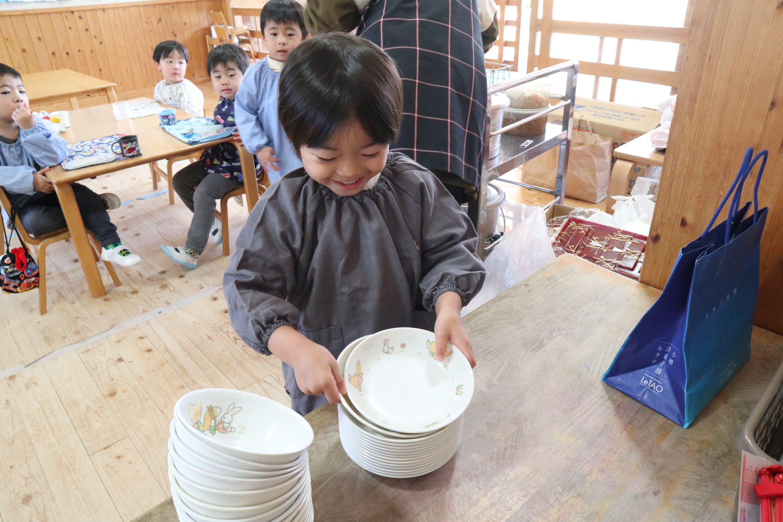 挨拶の後は、食器を配ります。「同じグループのお友達の人数を数えて、その数のお皿を持っていくよ。」とひな先生に教えてもらうとグループのお友達の人数を数え、食器を数えました。