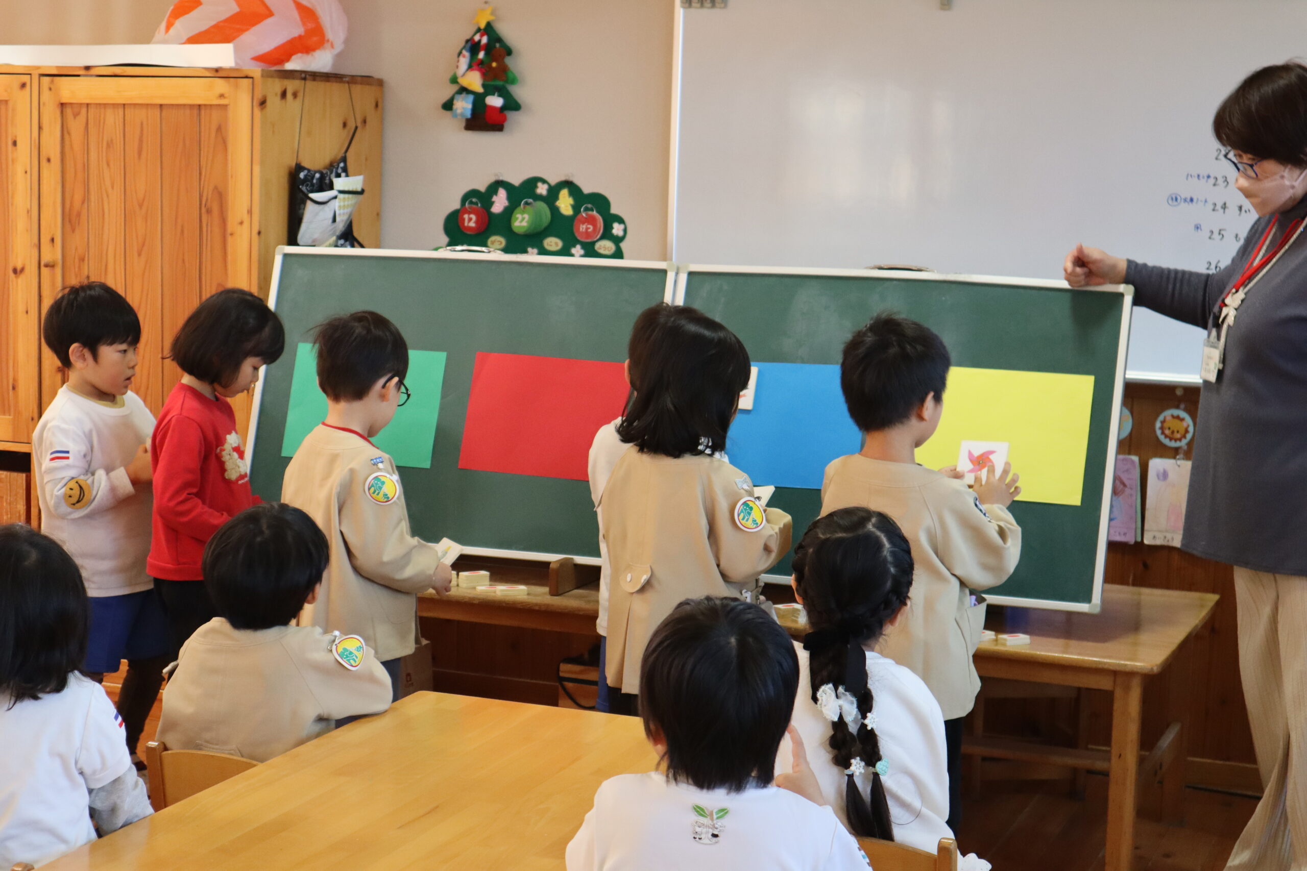各色に2枚の絵パネルを貼り、どちらの絵パネルが丸の磁石が多いのかという数比べのゲームを行いました。