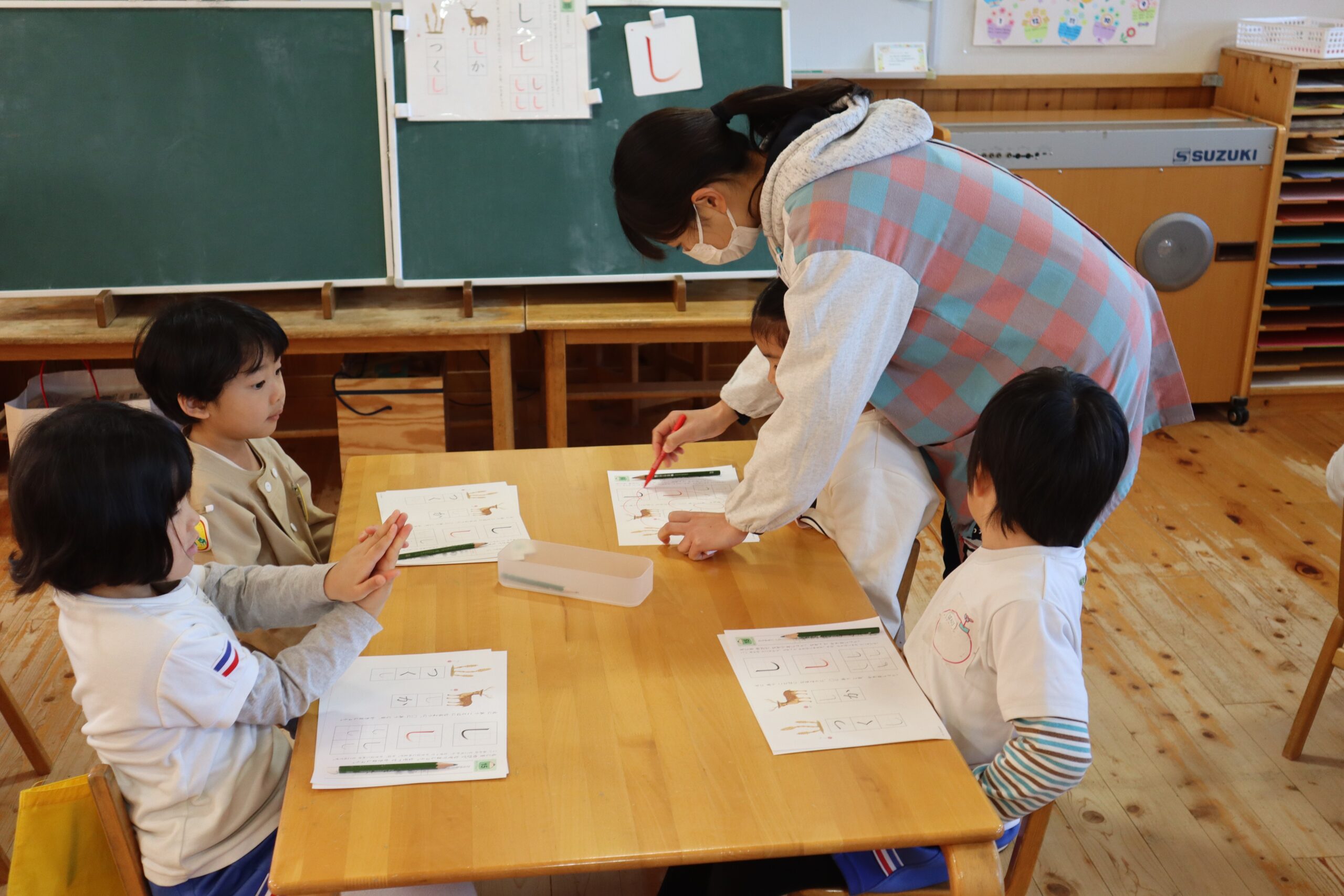 学研の先生やあゆ先生と一緒に鉛筆の持ち方を「こうやって持つよね?」「これで合ってるかな?」と確認をしてから取り組んでいました。