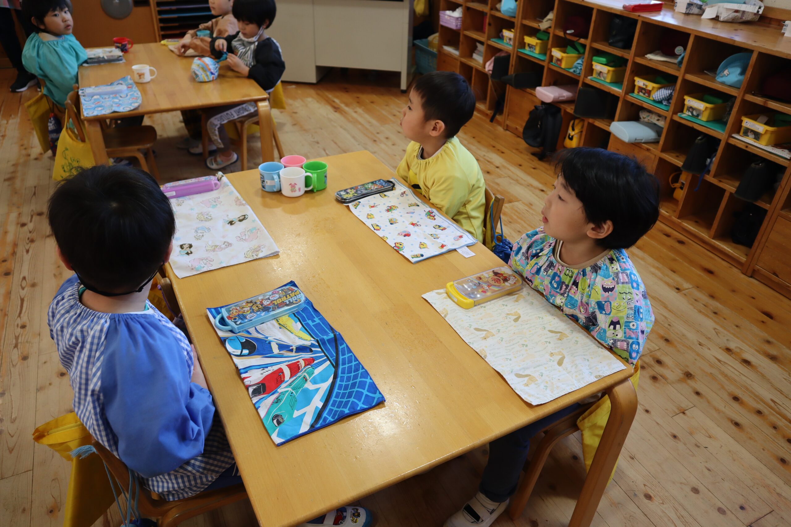 あゆ先生の「お給食にするよ~!」の声でお当番さんは机を拭いてくれています。他のお友だちは準備をしていました。