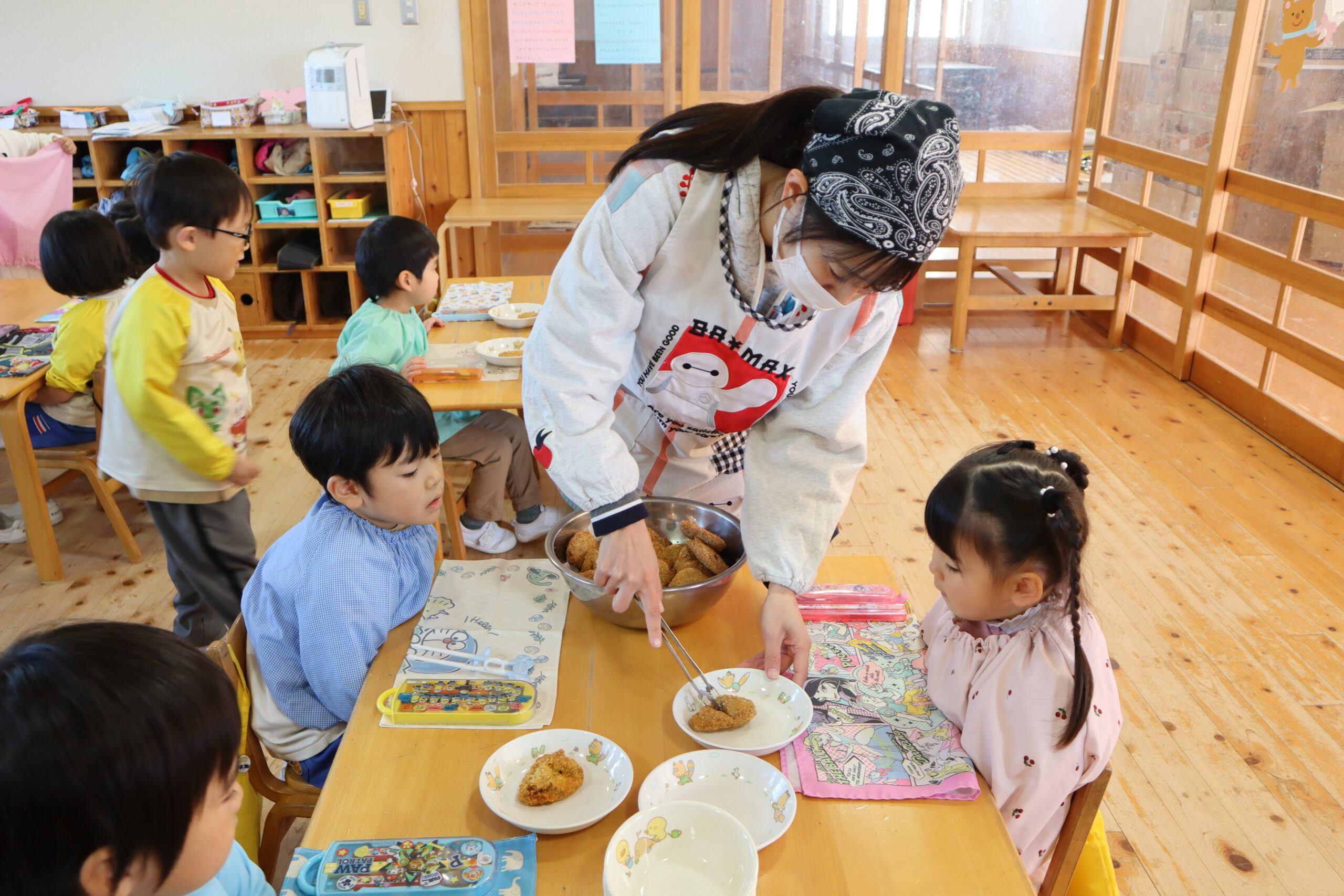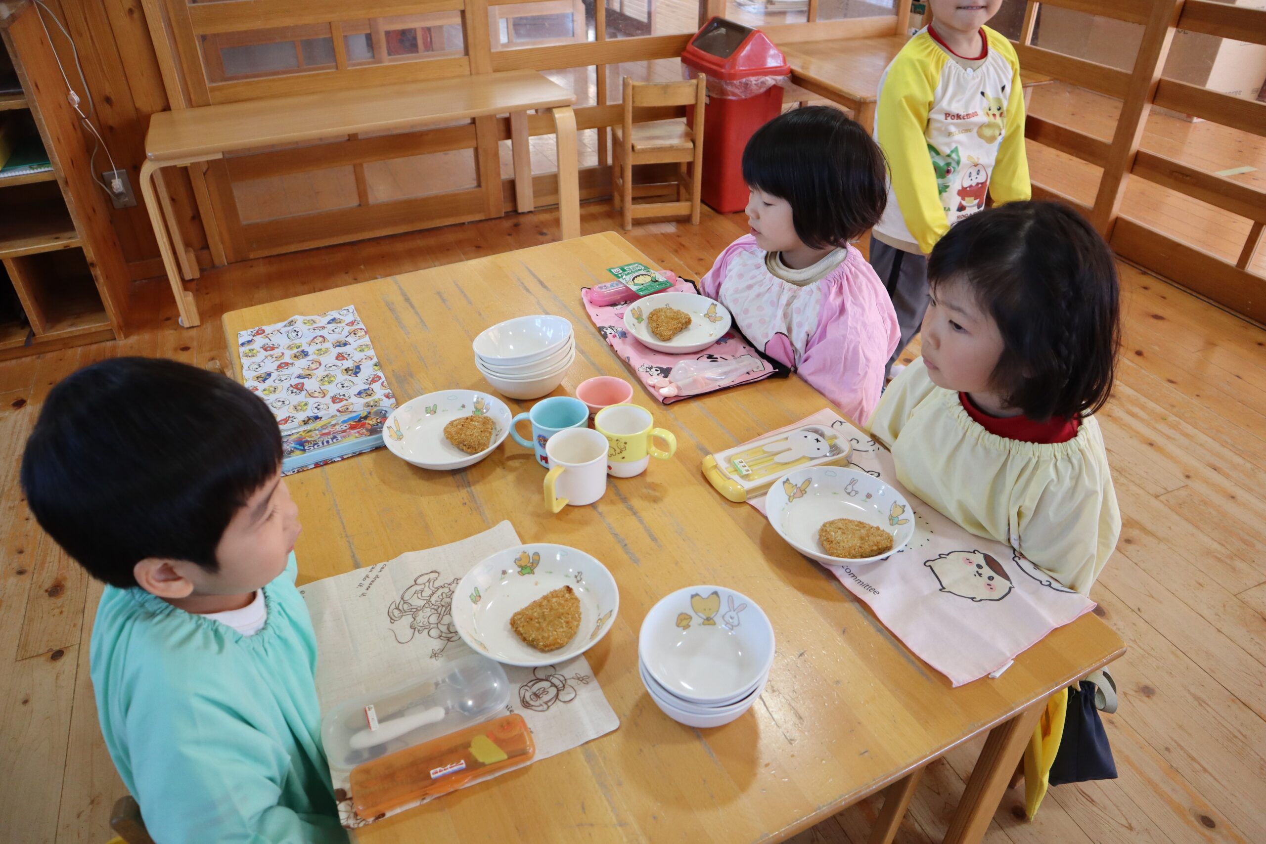 あゆ先生がみんなに「フライは1個かな?半分かな?」と聞くと、「1個食べれるよ!」「ちょっと苦手だから半分!」