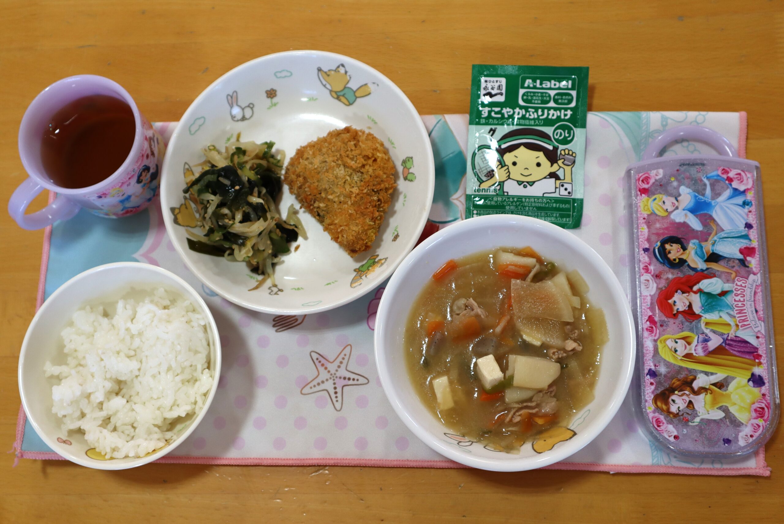 「ご飯・かぼちゃひき肉フライ・もやしとわかめの中華和え・豚汁・のりのふりかけ」です。