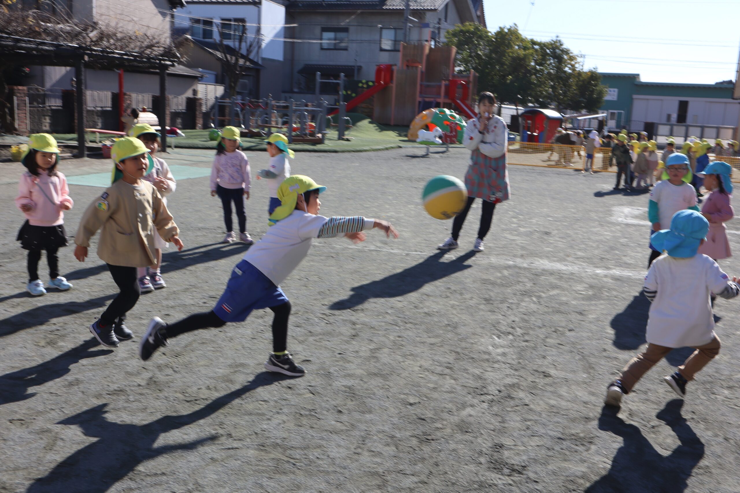 相手チームのお友だちを狙ってボールを投げるお友だち、相手チームから飛んでくるボールをよく見て当たらないように逃げるお友だち。