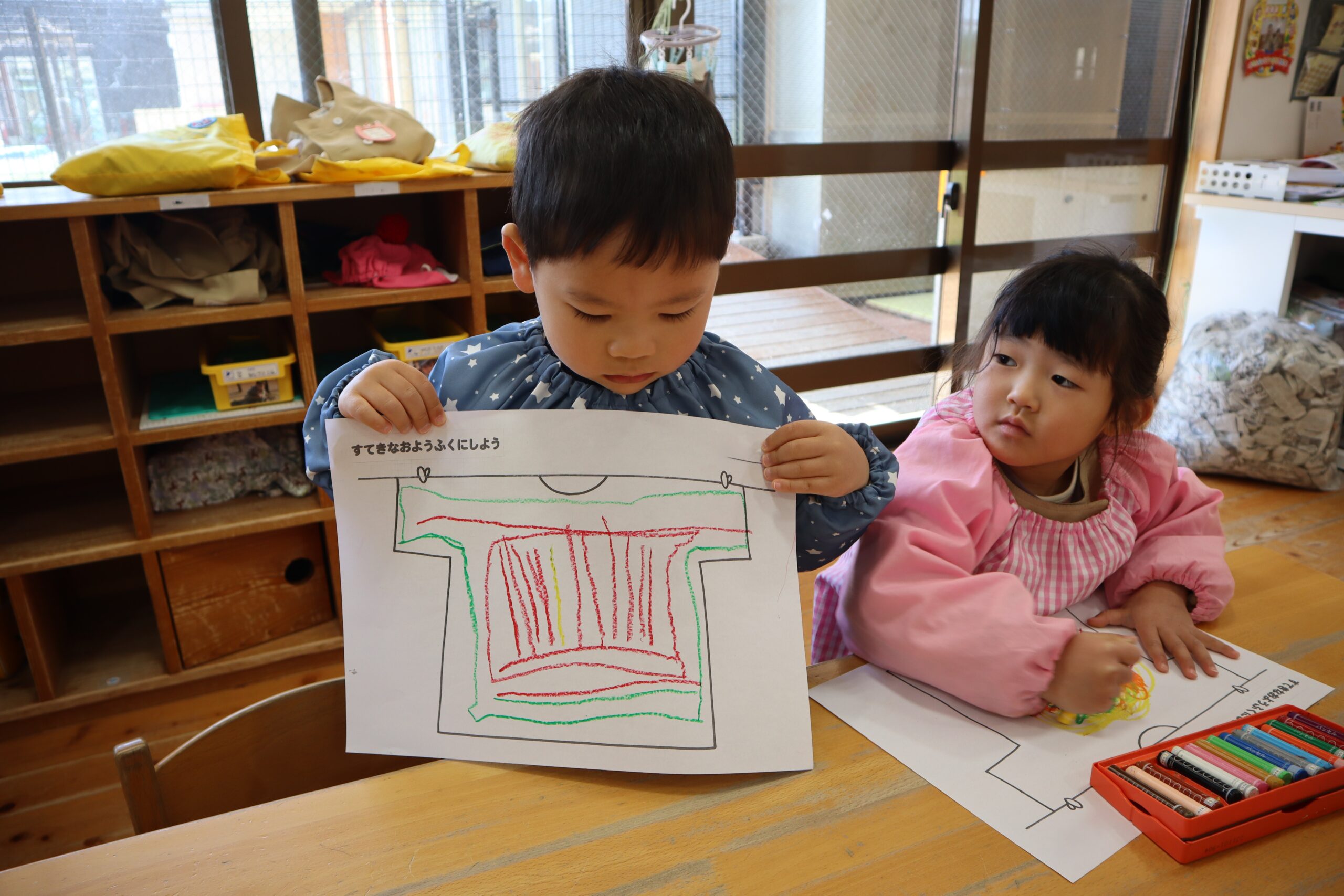 今日は知育プリントのTシャツにお絵描きを行いました。