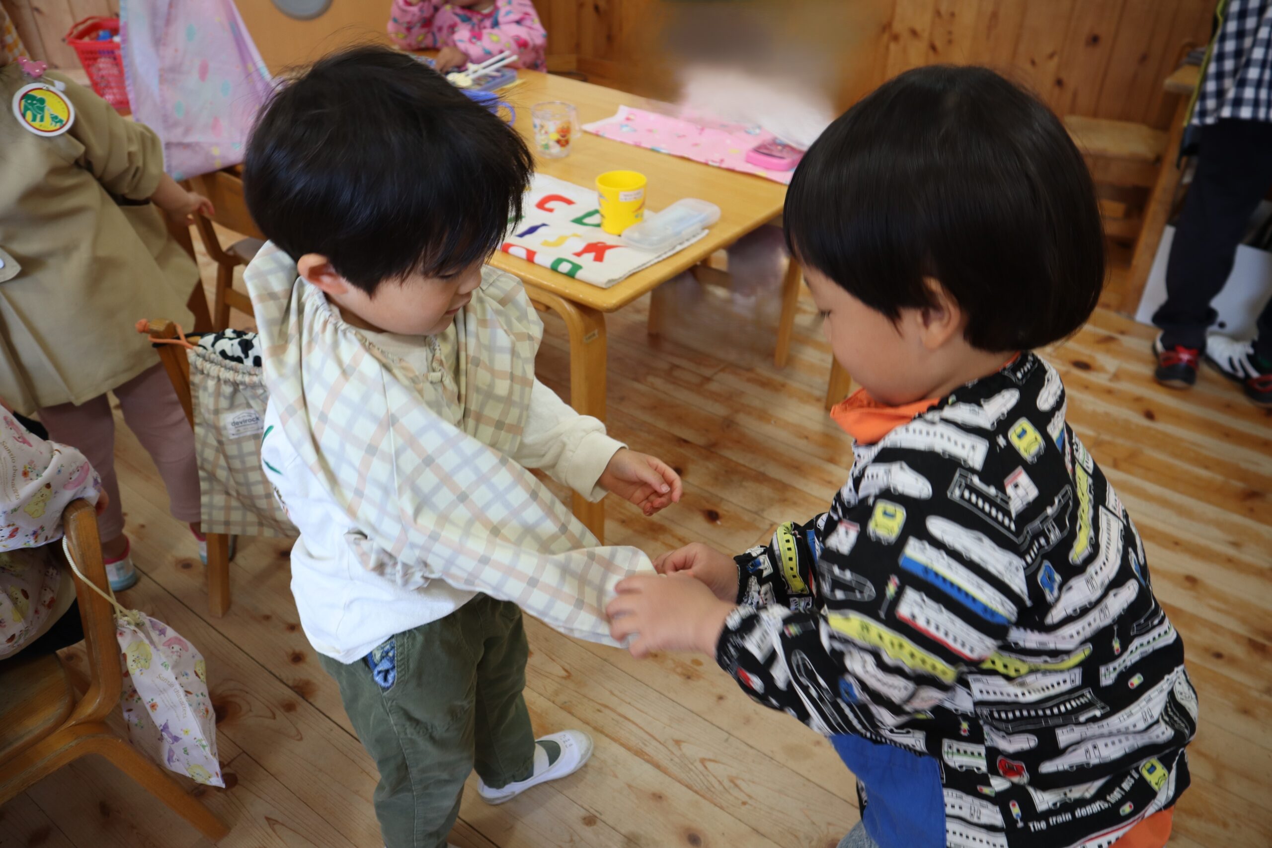 スモックが前後ろ反対にならないように気を付けながら着たり、