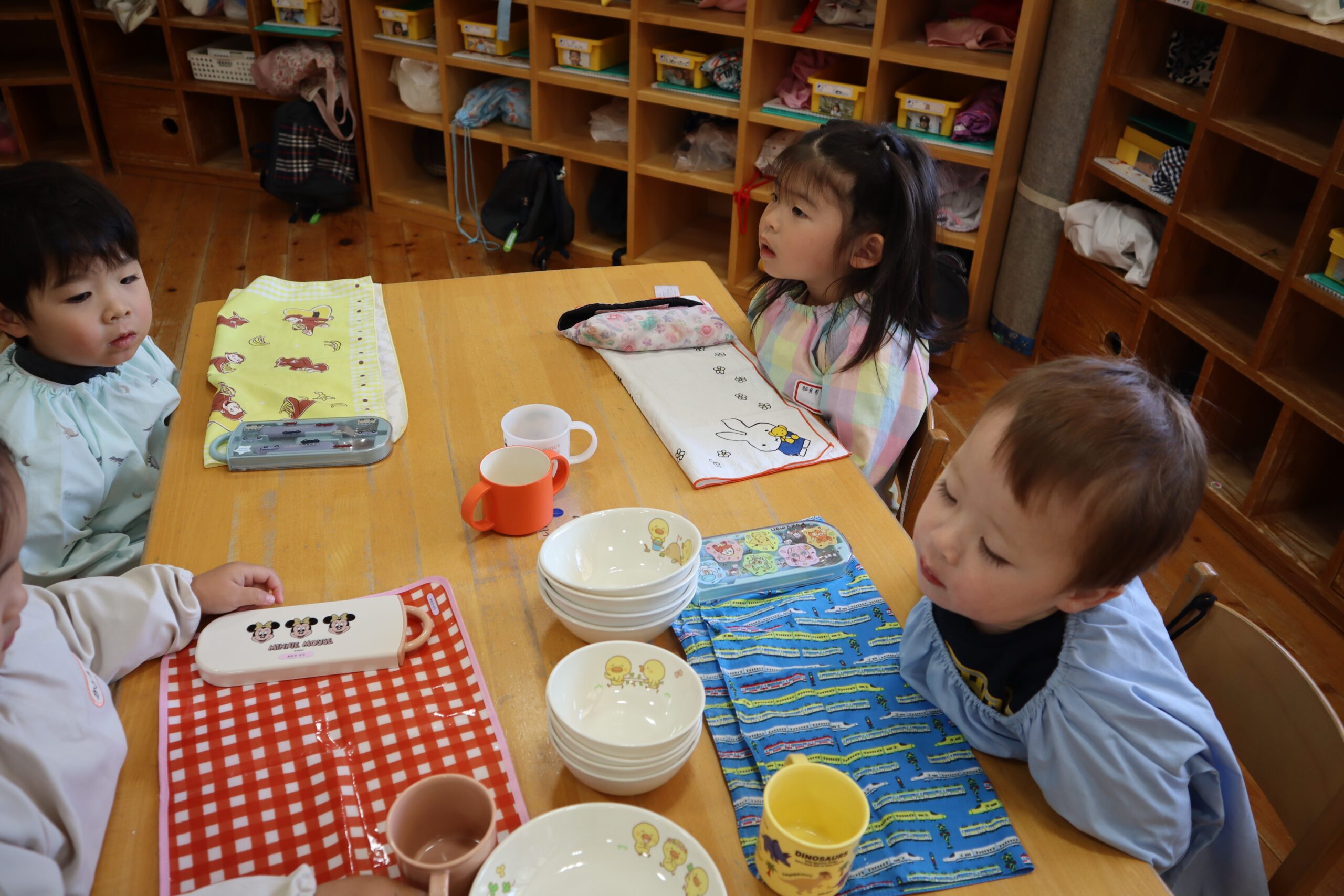 お部屋に戻ると自分のおかばんから給食セットを出して準備を始めます。