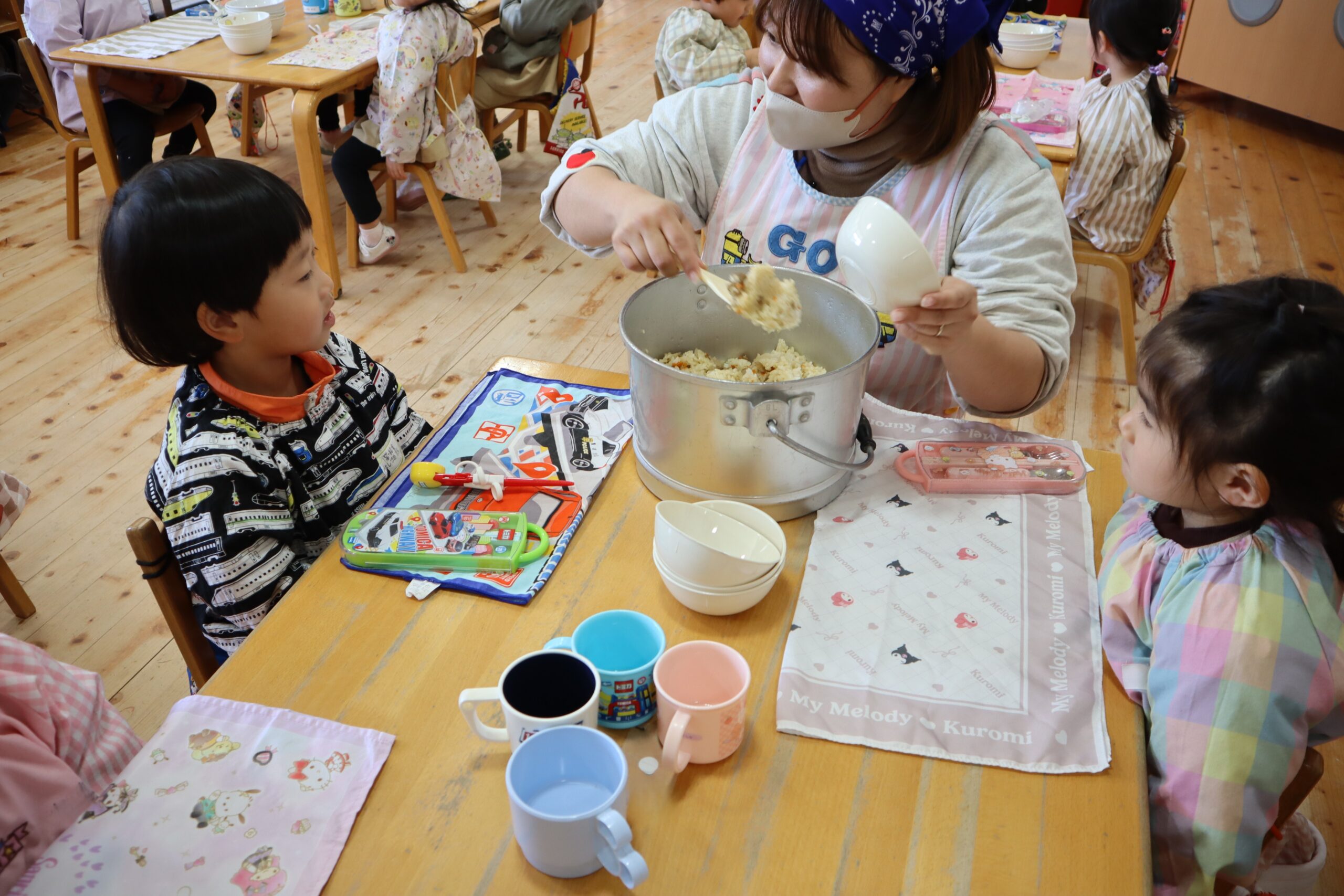 どんなお給食なのかを確認しながら「いっぱい食べる!」「お汁はちょっとにする!」とみんな教えてくれました。