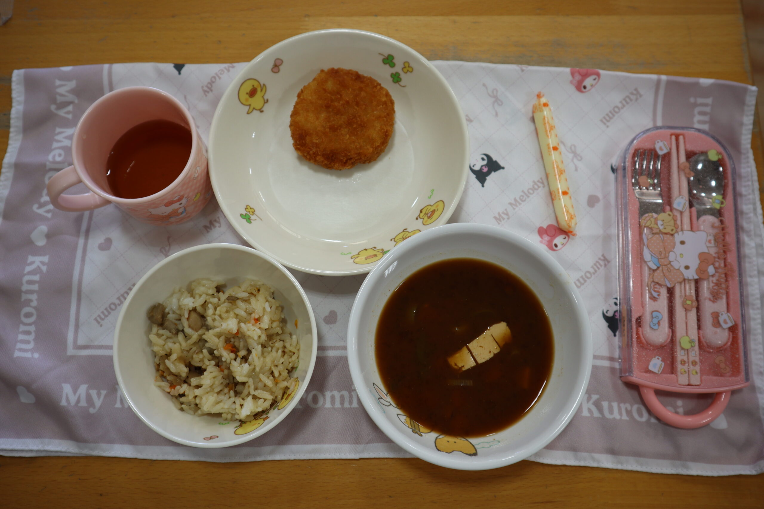 本日の献立は「五目ごはん・エビカツ・豆腐となめこのみそ汁・ステックチーズ」です。