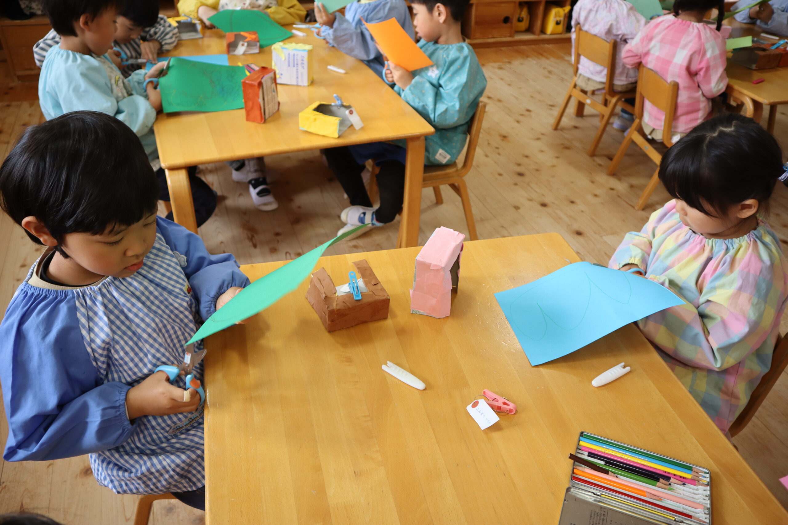 好きな色の画用紙に「どんな形の木(屋根)にしようかな~」とお友達と相談しながら、