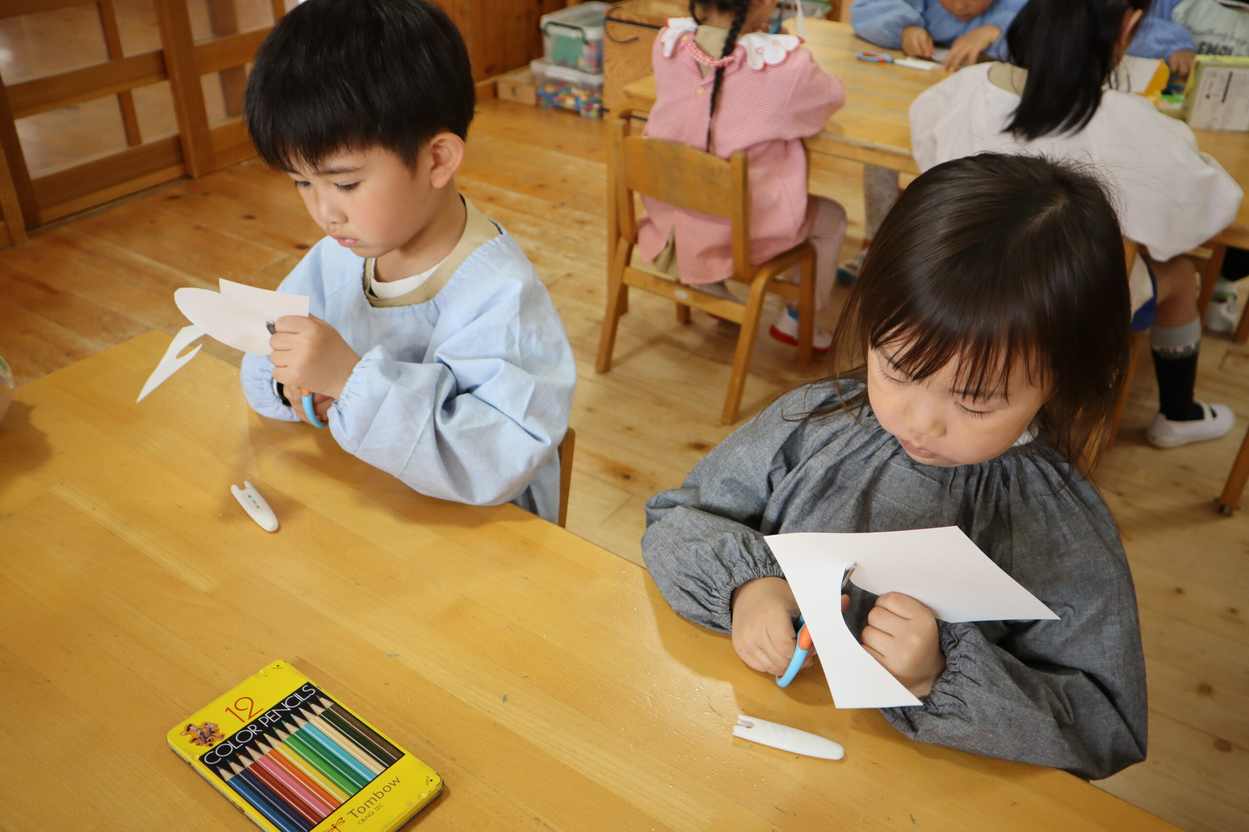 みほ先生が「はさみはどうやって持つかな?」と聞くと「こういうふうだよね!」「どうやって持つんだっけ・・・」とみんなで確認をして切り始めました。