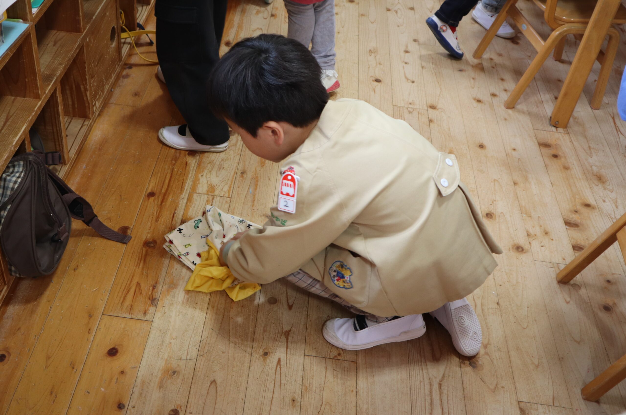みほ先生が「お片付けするよ!」と声を掛けると、活動用スモックを丁寧にたたんで片付ける姿は、