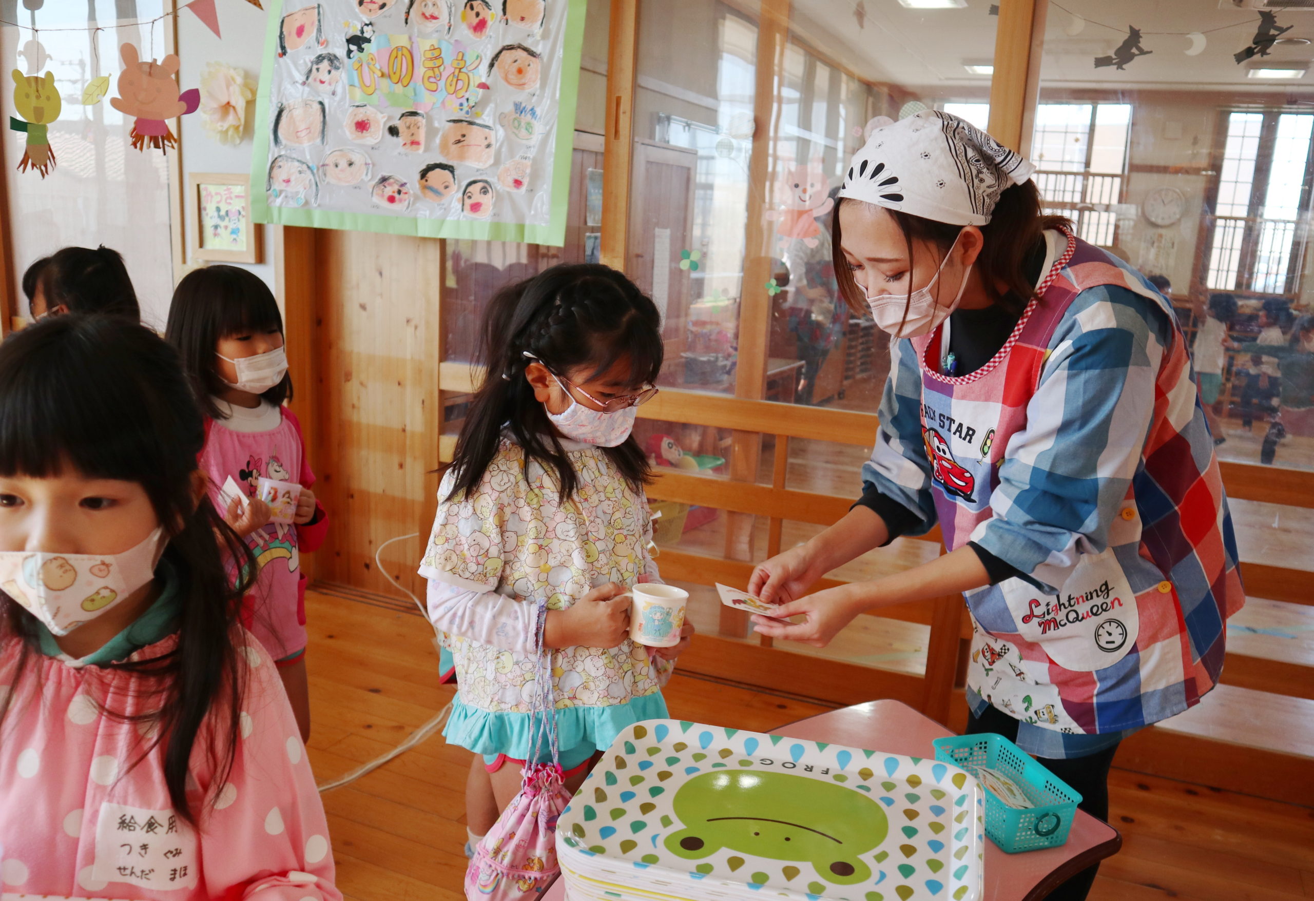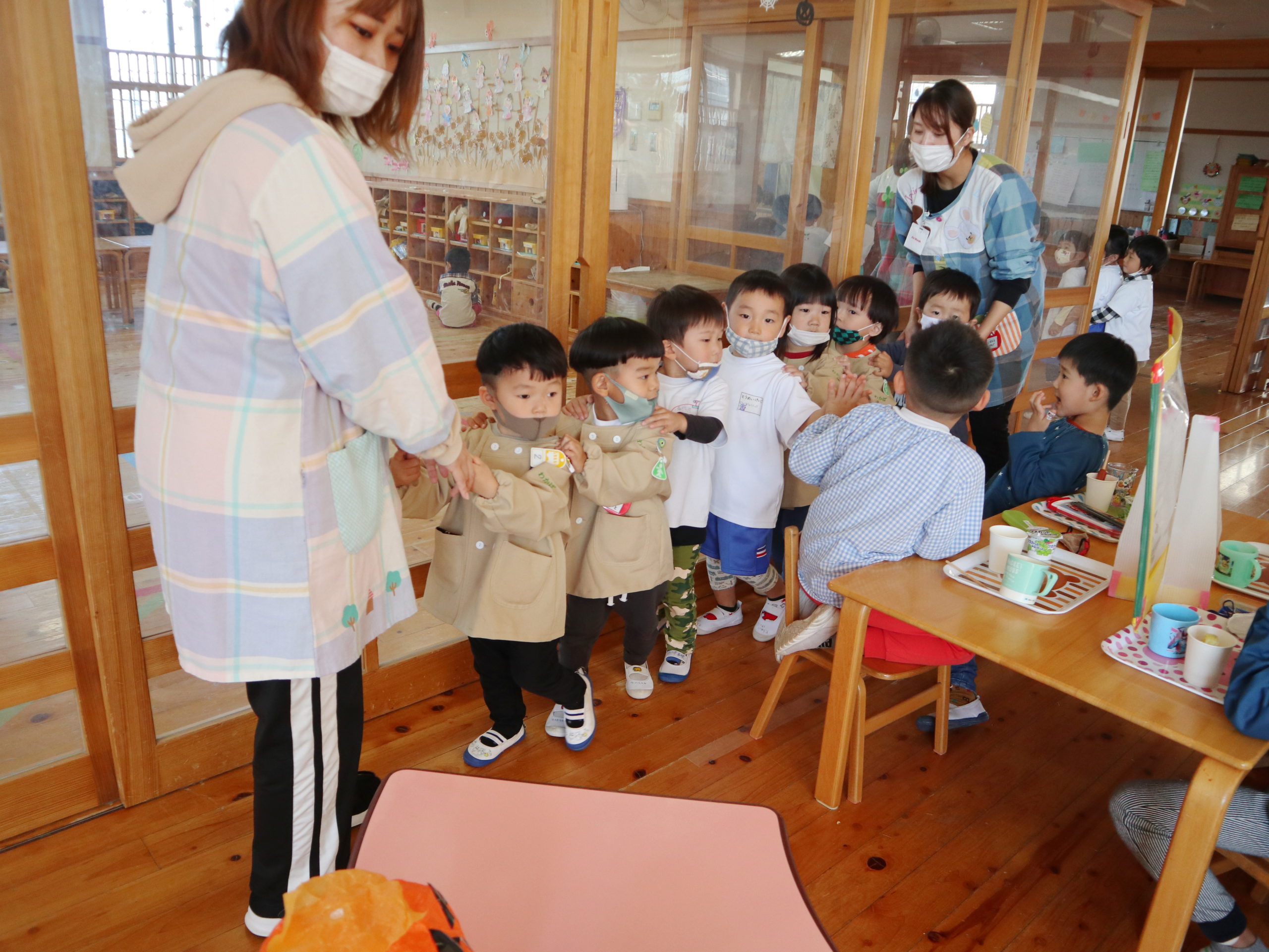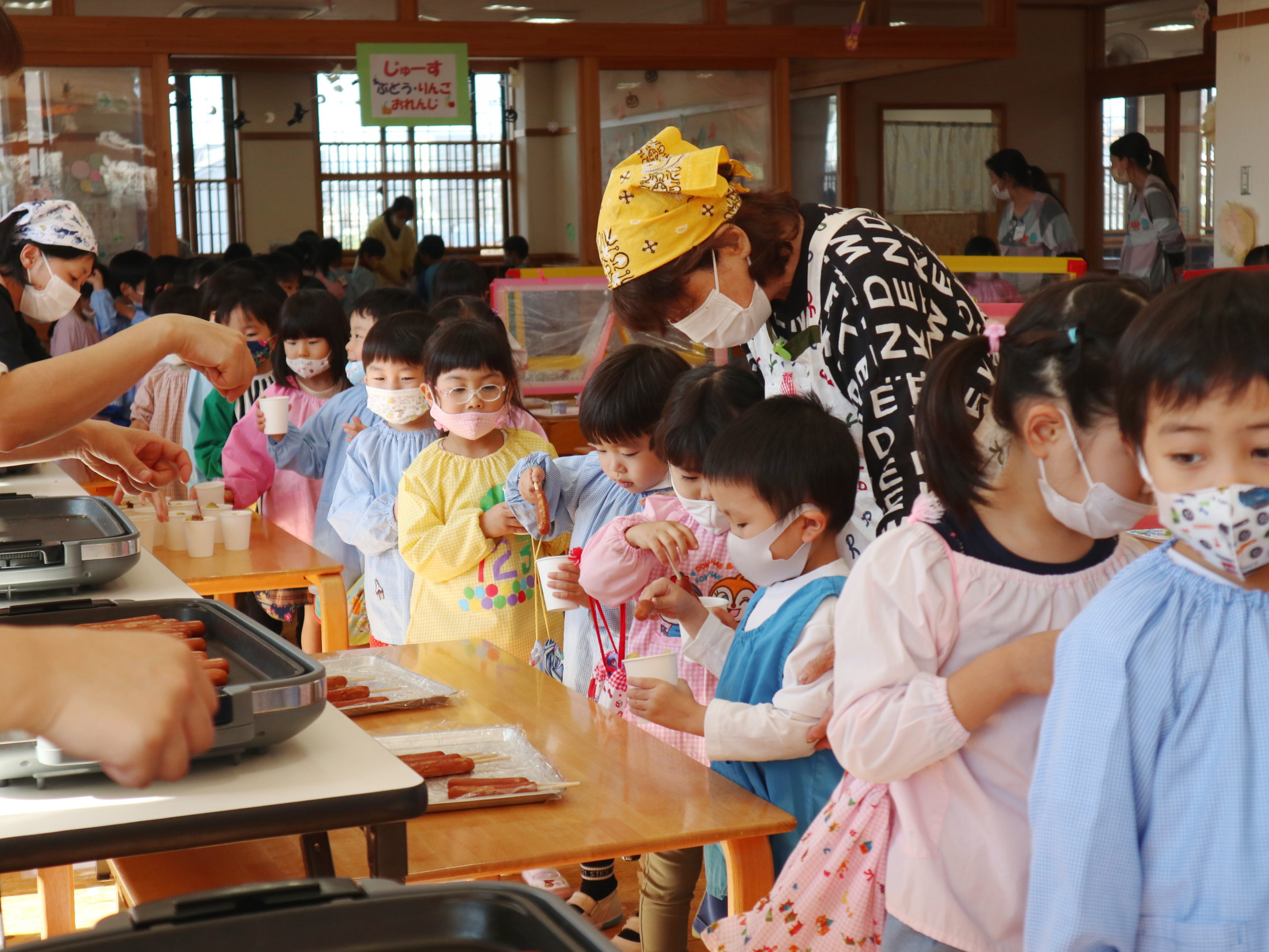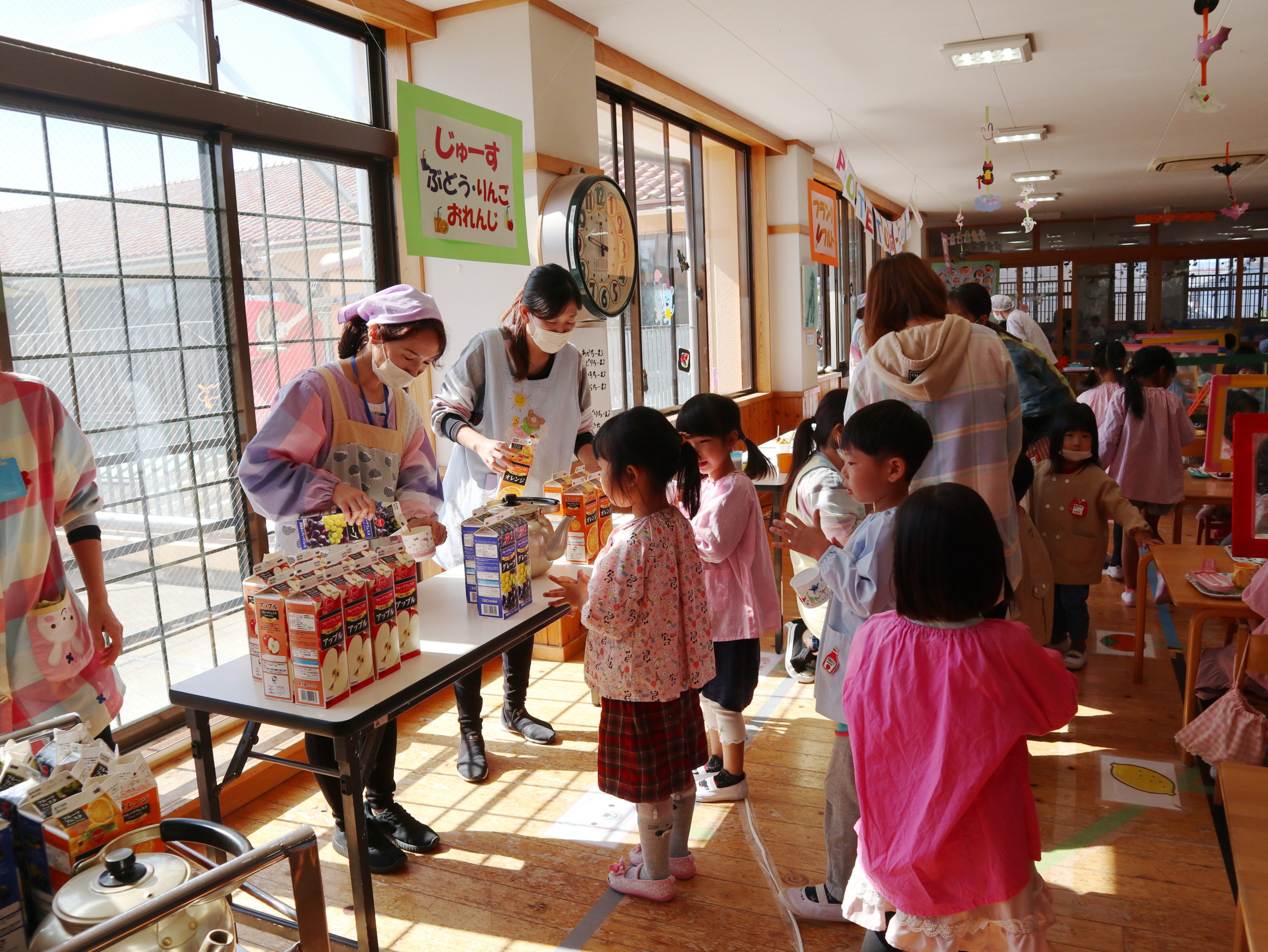 年中組さん、年長組さんは2階のフロアで『POTETOパーティー』を行いました。招待券を先生に見せたら、さあ、始まりです。