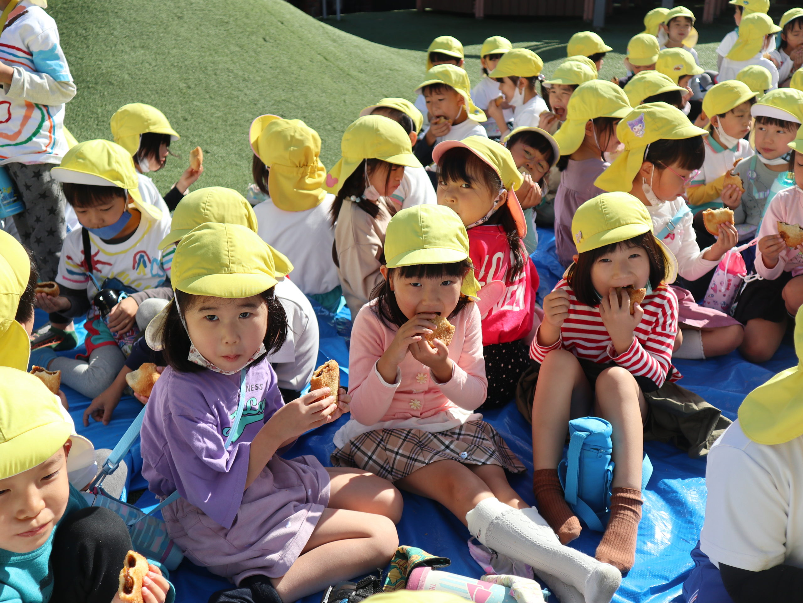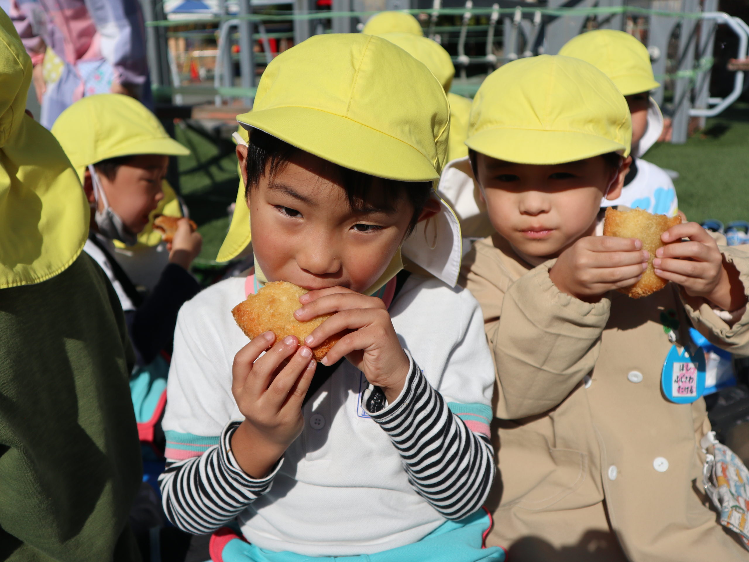 年長のおともだちは後のお楽しみに!ととっておいたカレーパンをお外で頬張りました。