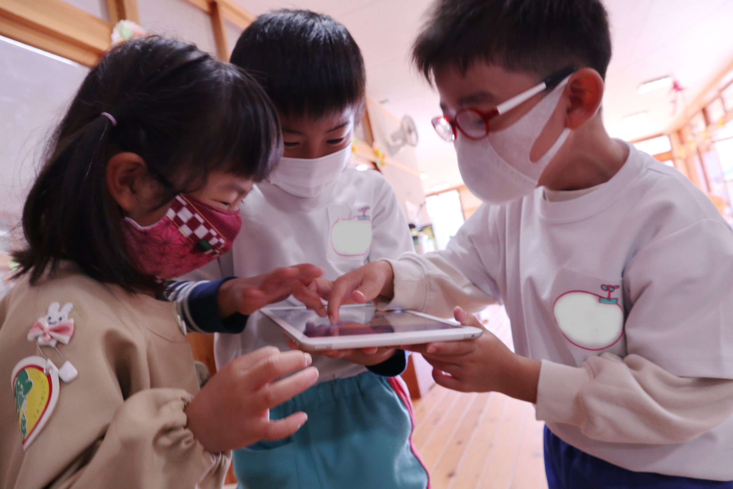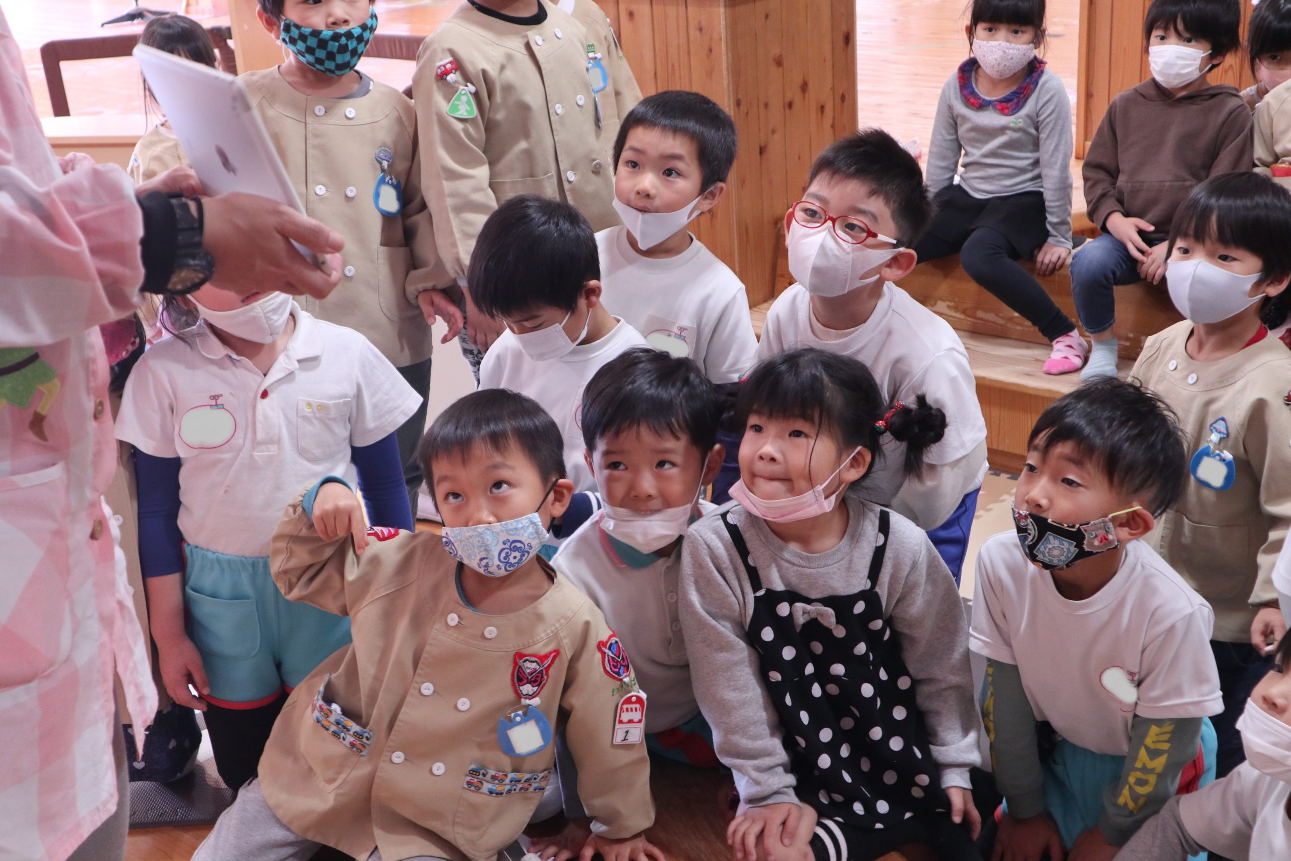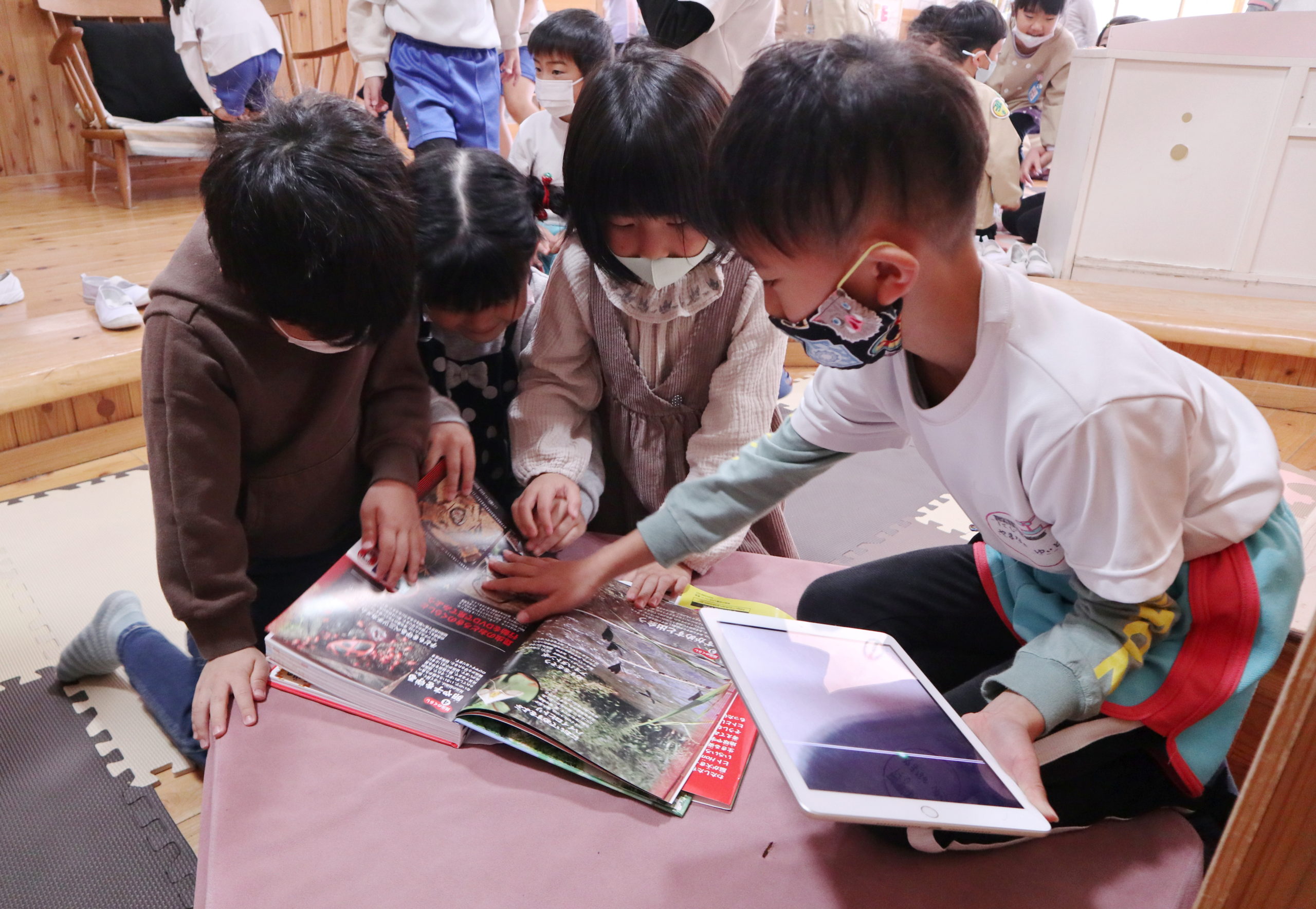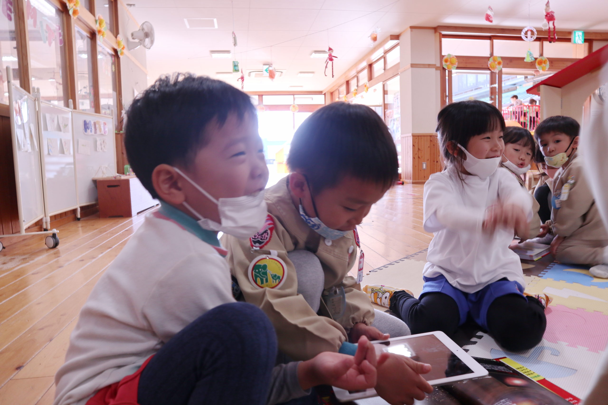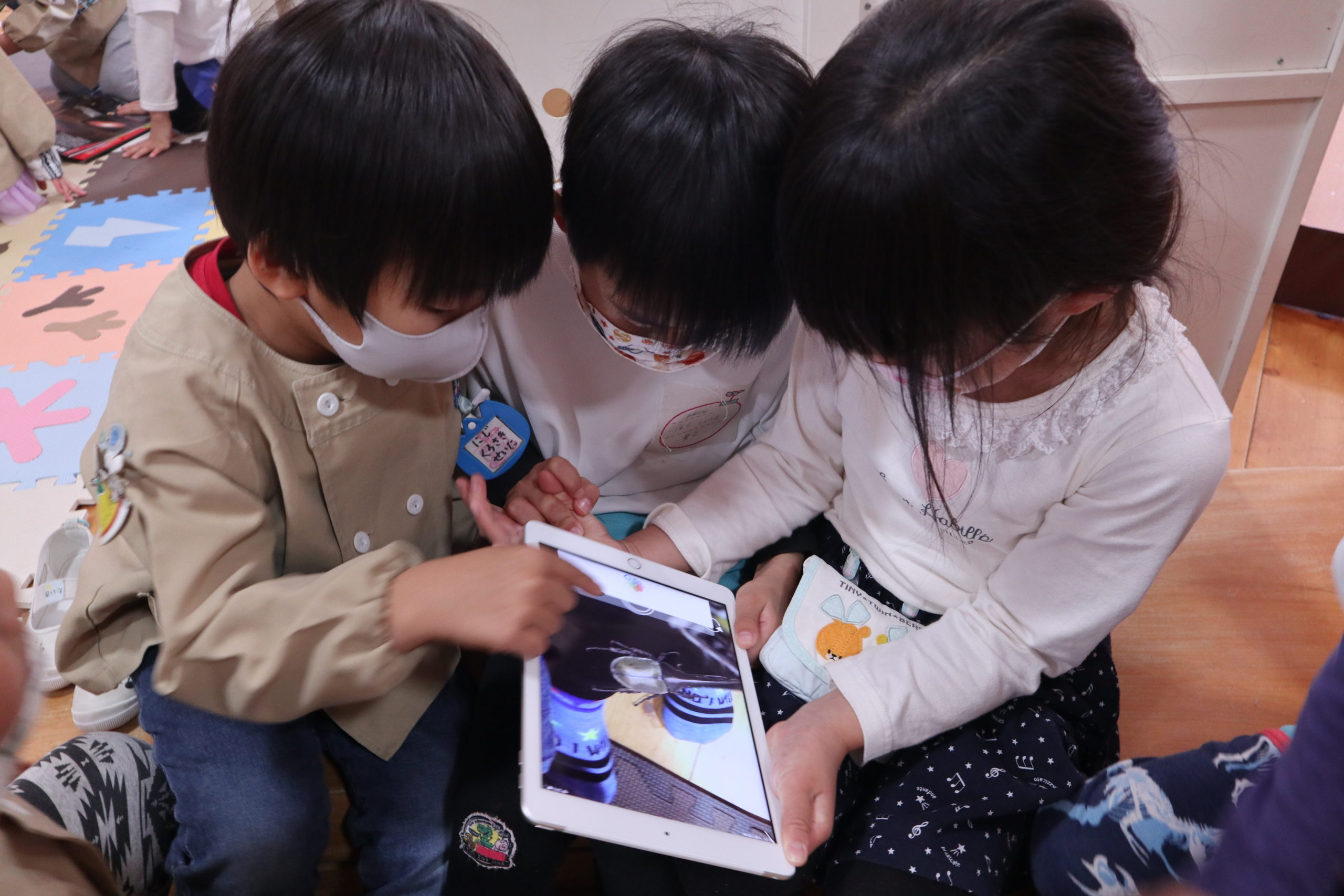 11月18日 にじ組のこどもたちが絵本の部屋に集まって夢中で何かを見ています。